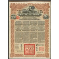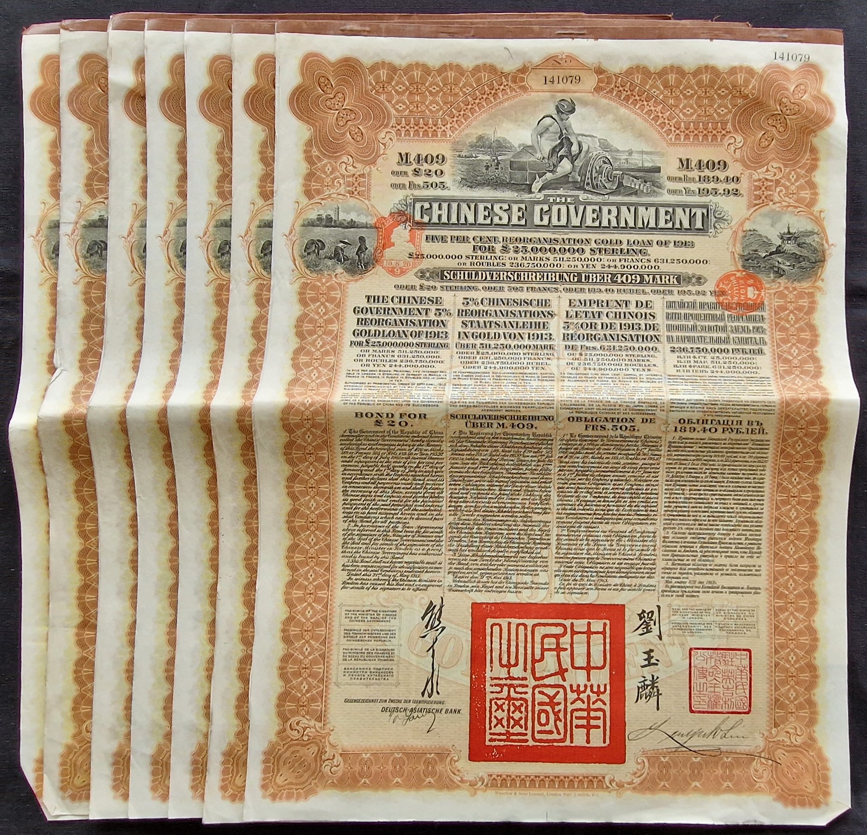 China: 1913 5% Reorganisation Gold Loan, a group of 8 bonds for 409 marks, issued by DAB, Mercury at top, brown and black, printed by Waterlow & Sons, with coupons. Generally EF (8).