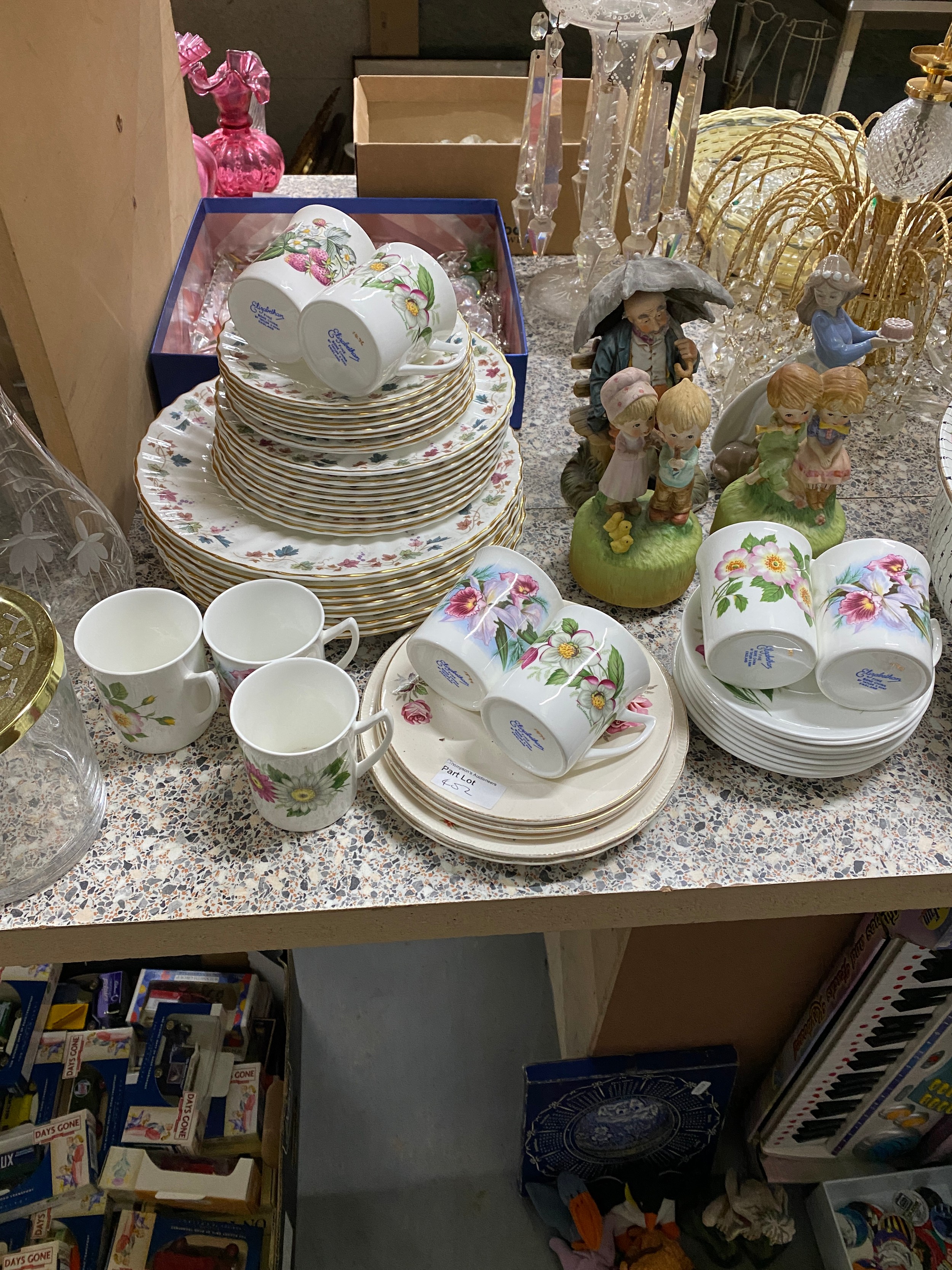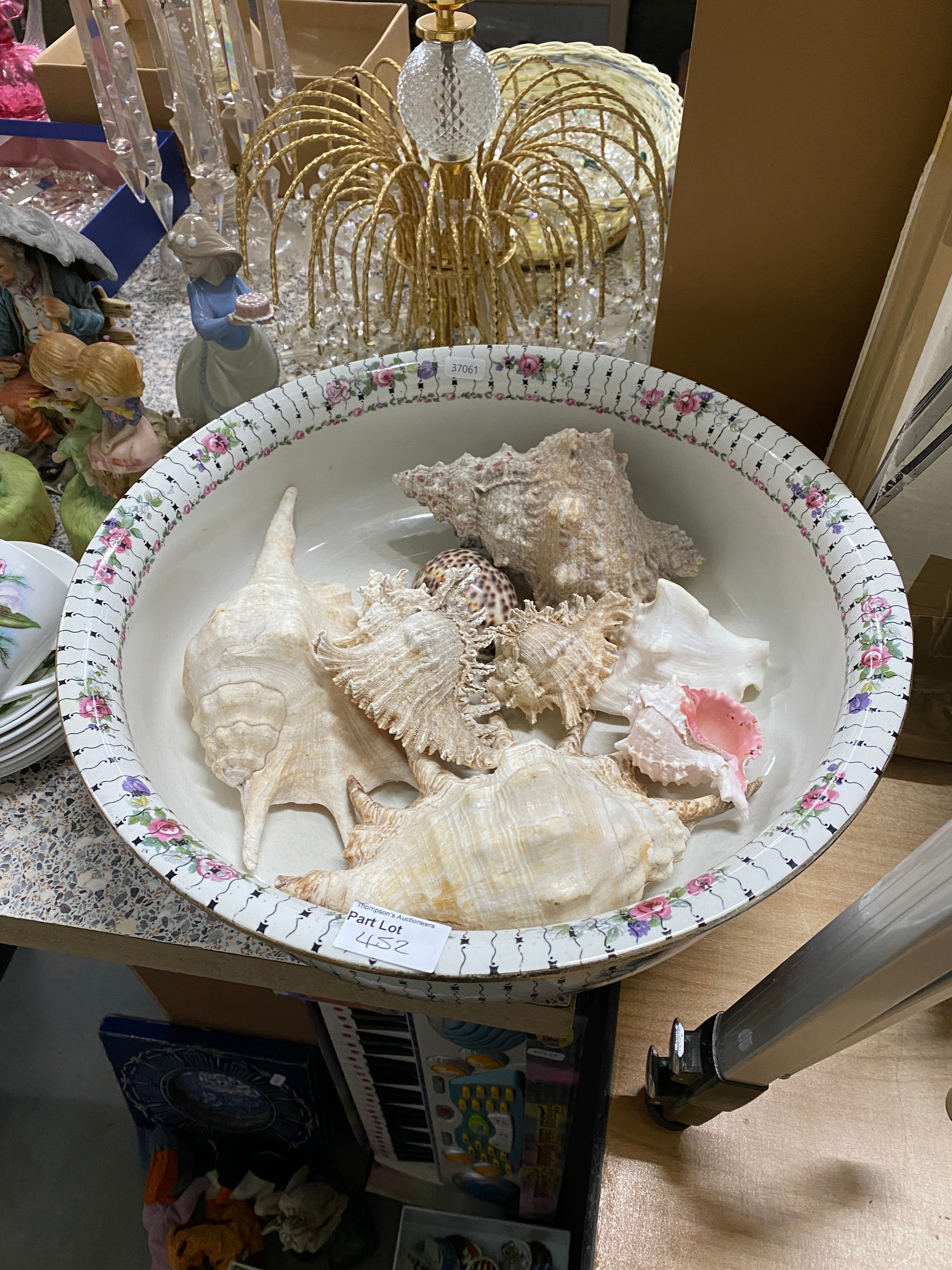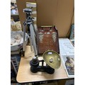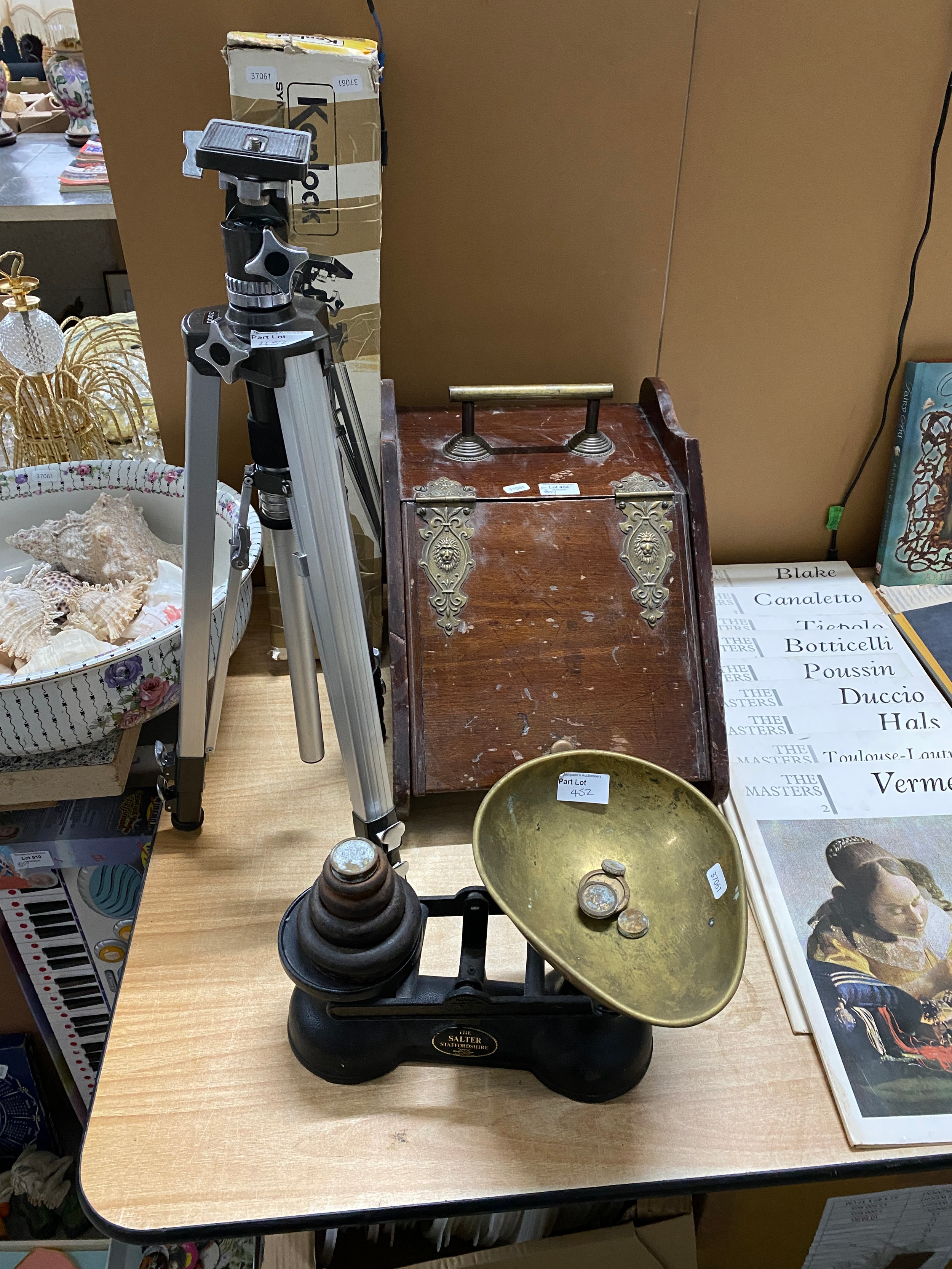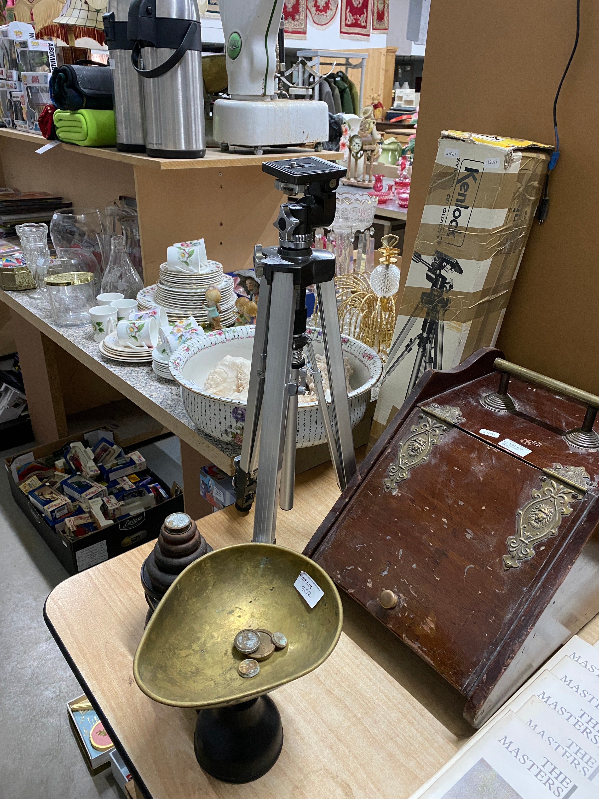 Kenlock tripod, assorted table wares including Royal Doulton 'Canterbury', sea shells, mahogany coal scuttle, Salter scales and weights etc