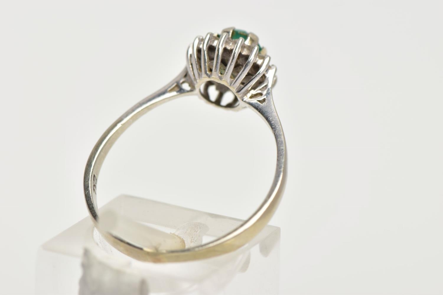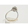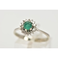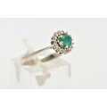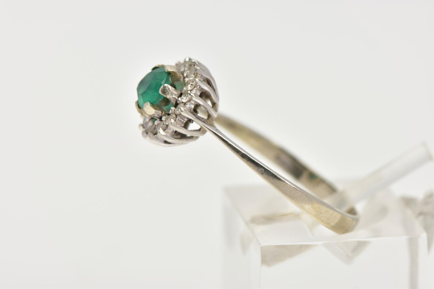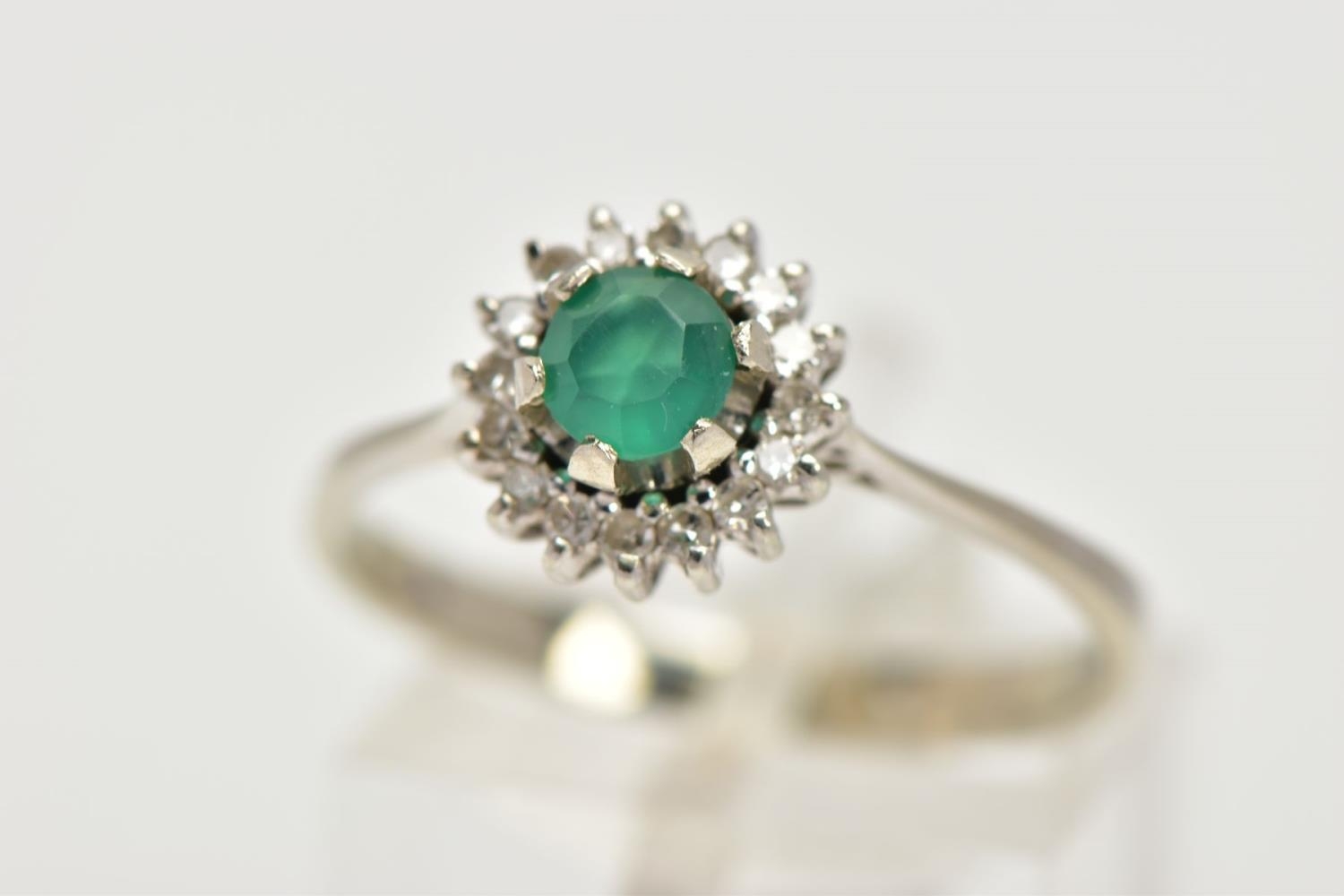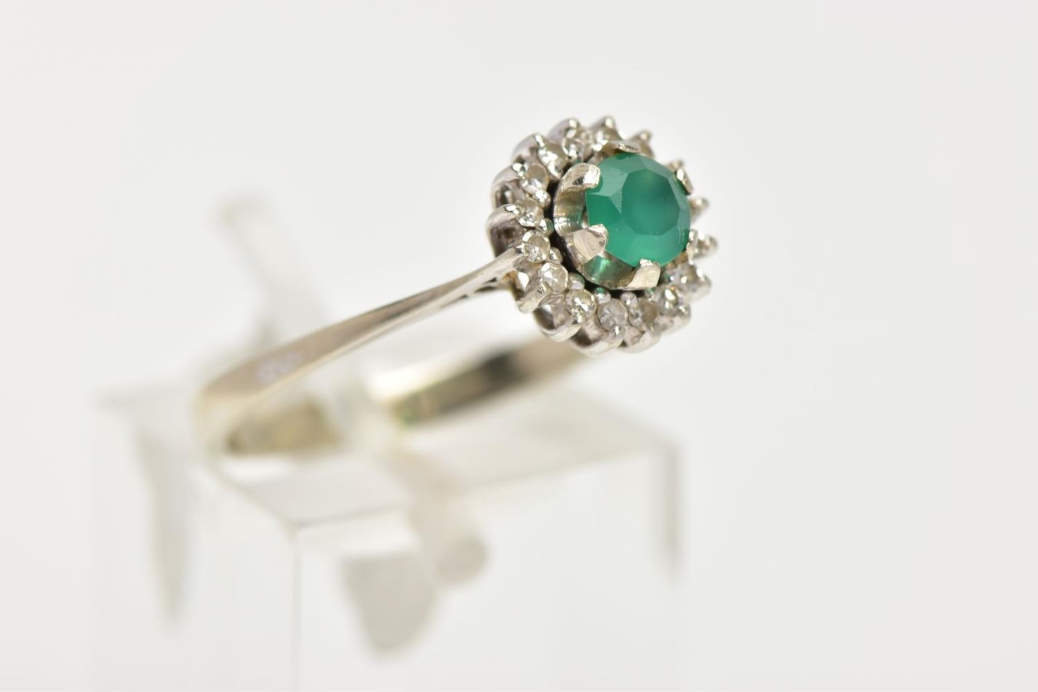 A GREEN CHALCEDONY AND DIAMOND CLUSTER RING, the central circular green chalcedony within a single cut diamond surround, stamped 750, ring size P 1/2, approximate gross weight 2.5 grams (condition report: overall good condition, moderate general wear)
