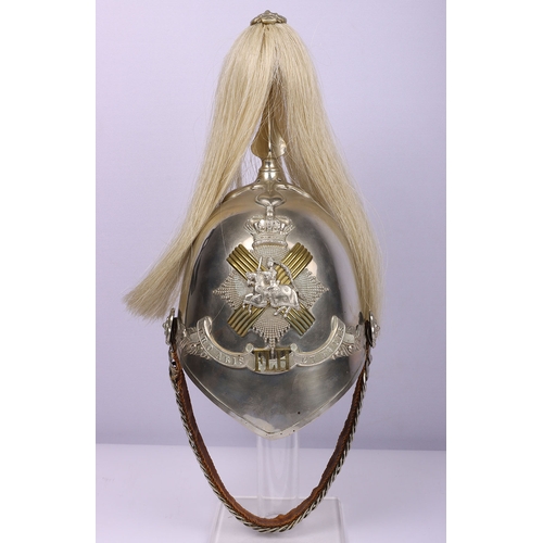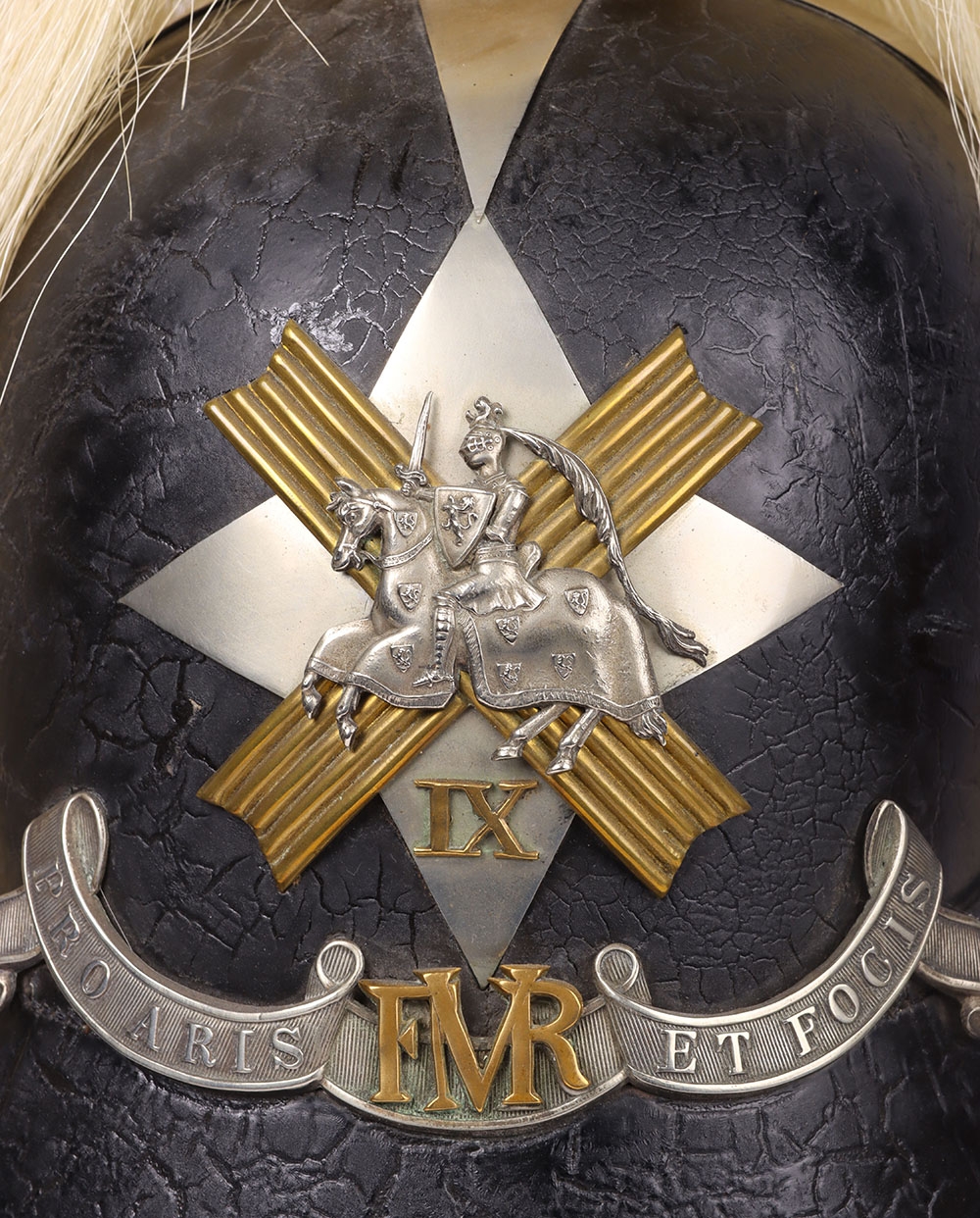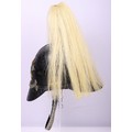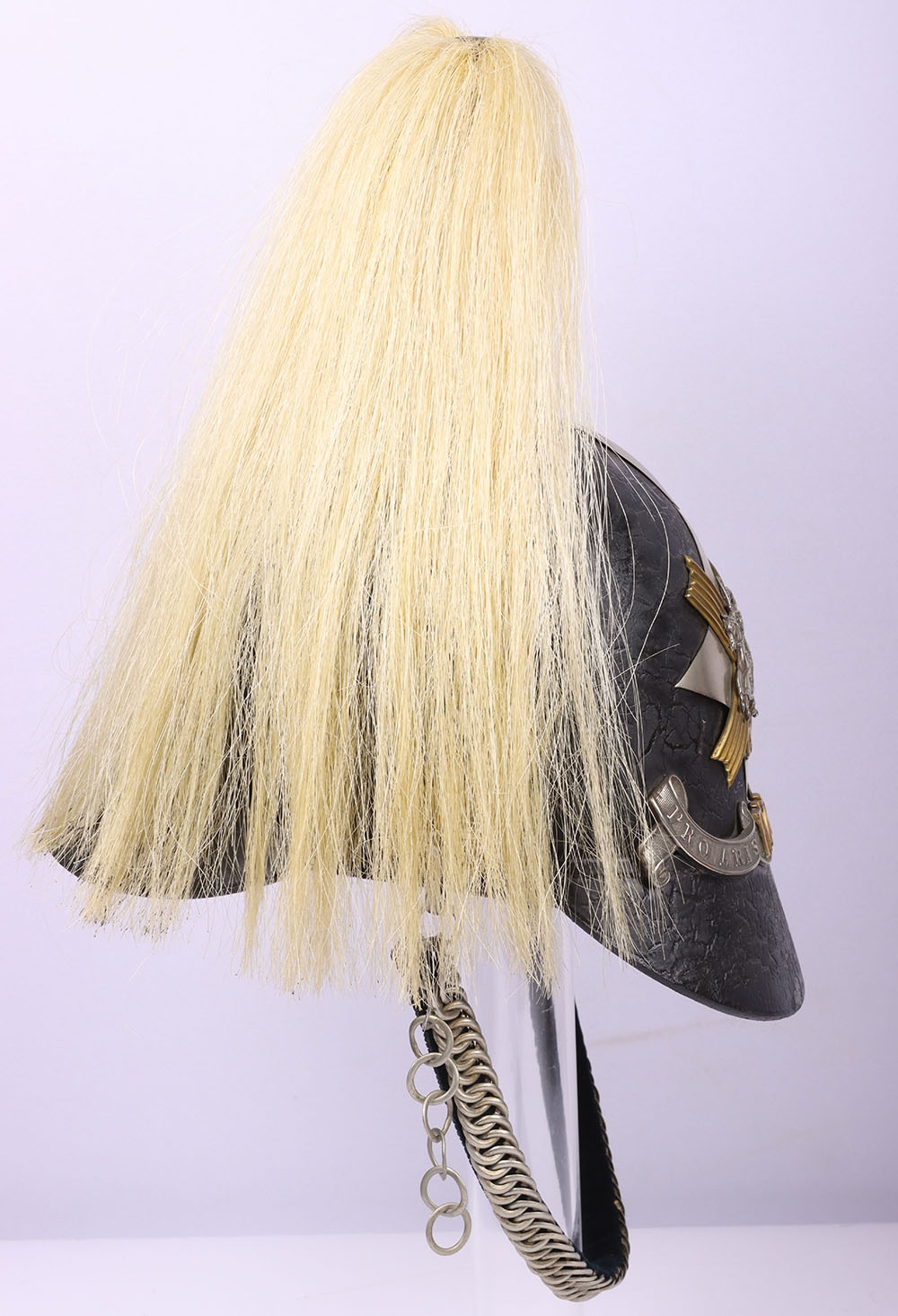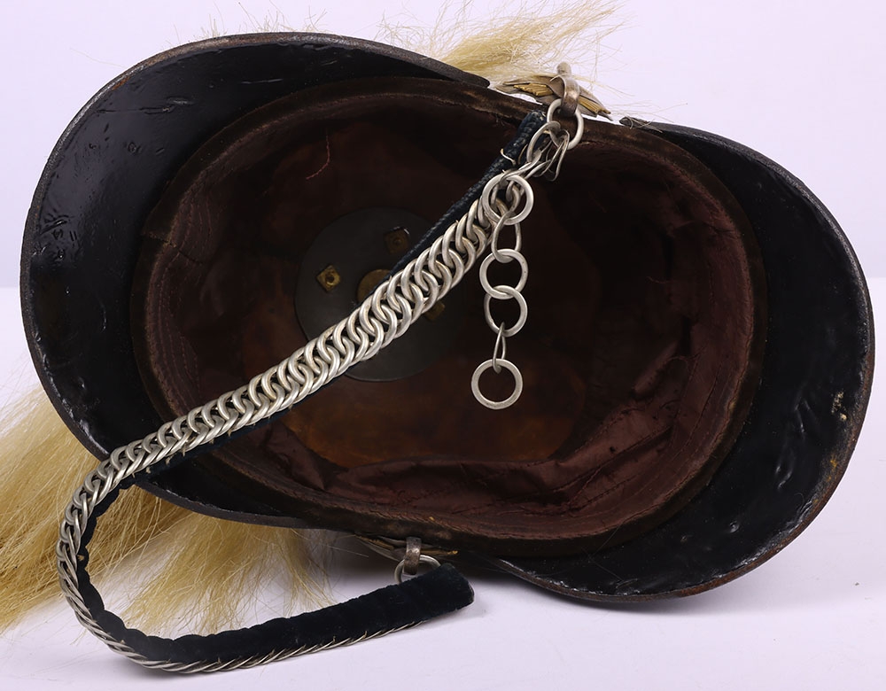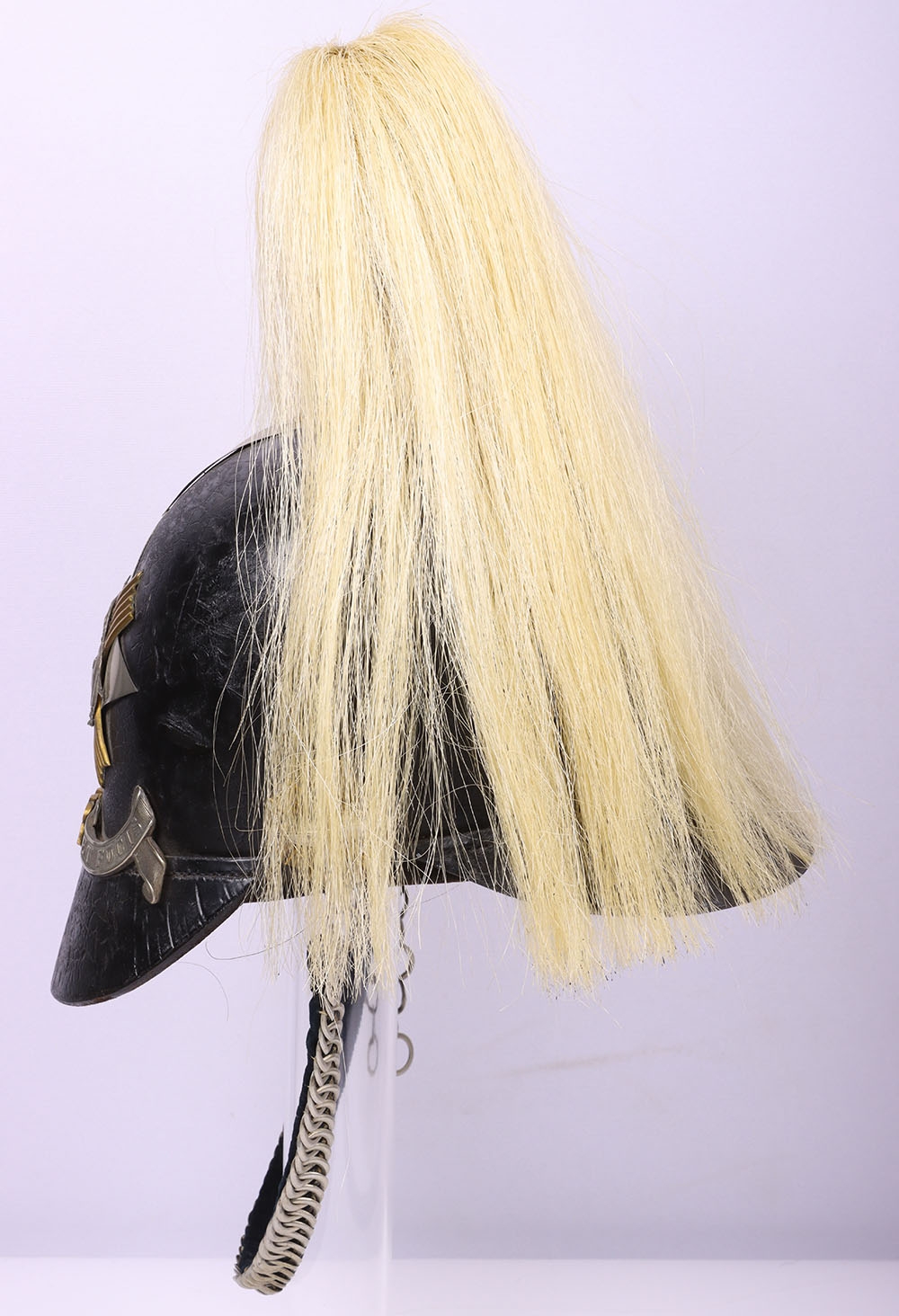 Victorian Fife Mounted Rifles Helmet, good example of the leather bodied dress helmet with white metal and brass regimental helmet plate to the centre. Regimental pattern side bosses with linked chinstrap. Plume socket with white horse hair plume intact. Quilted cloth lining to the interior of the helmet. Generally a good example.