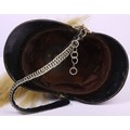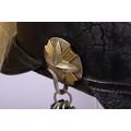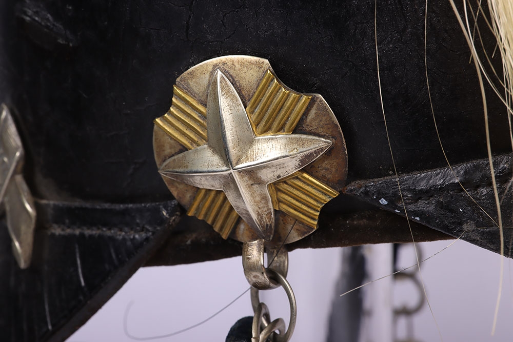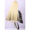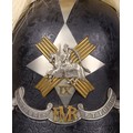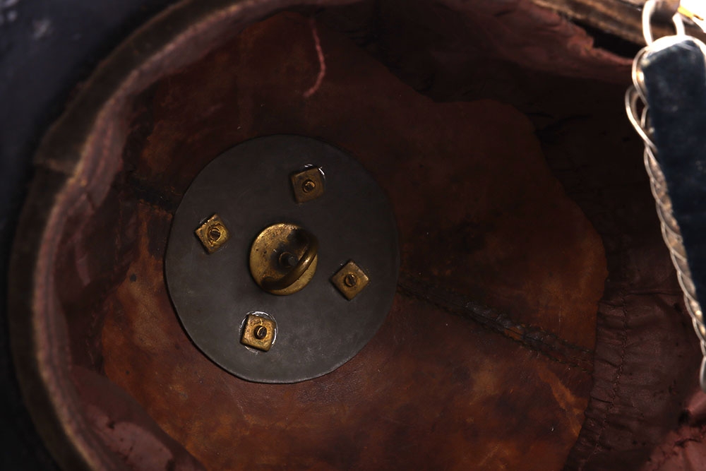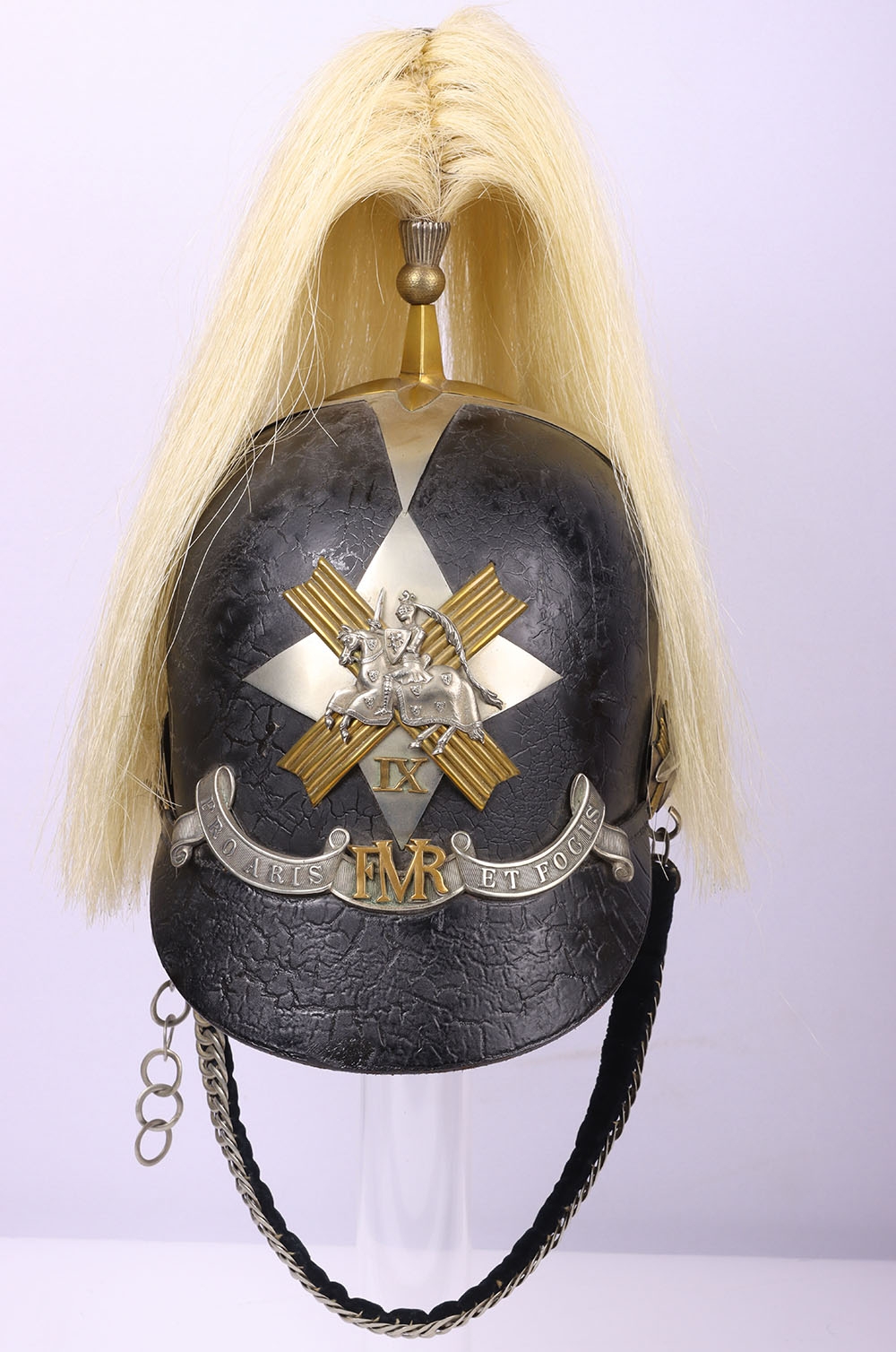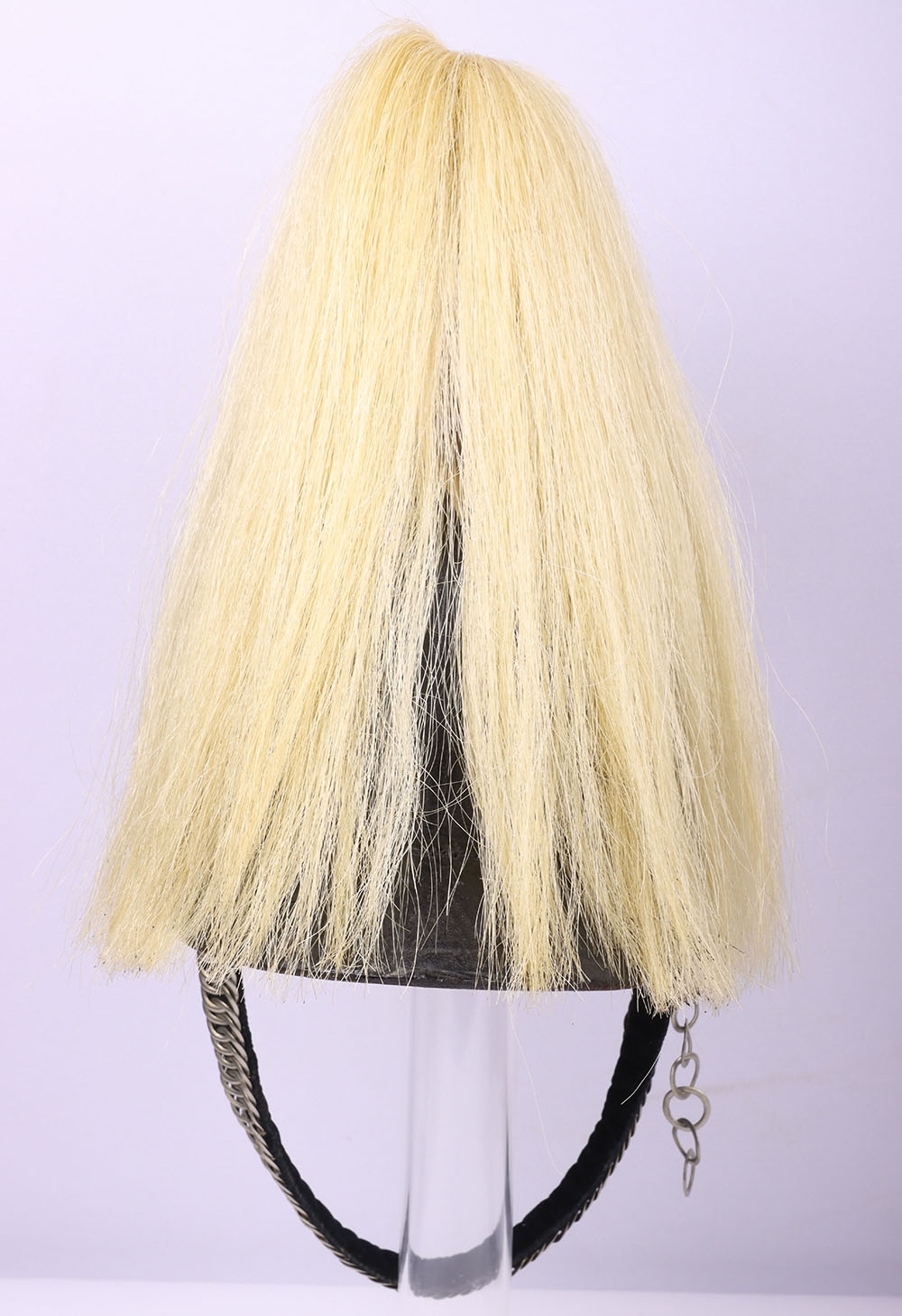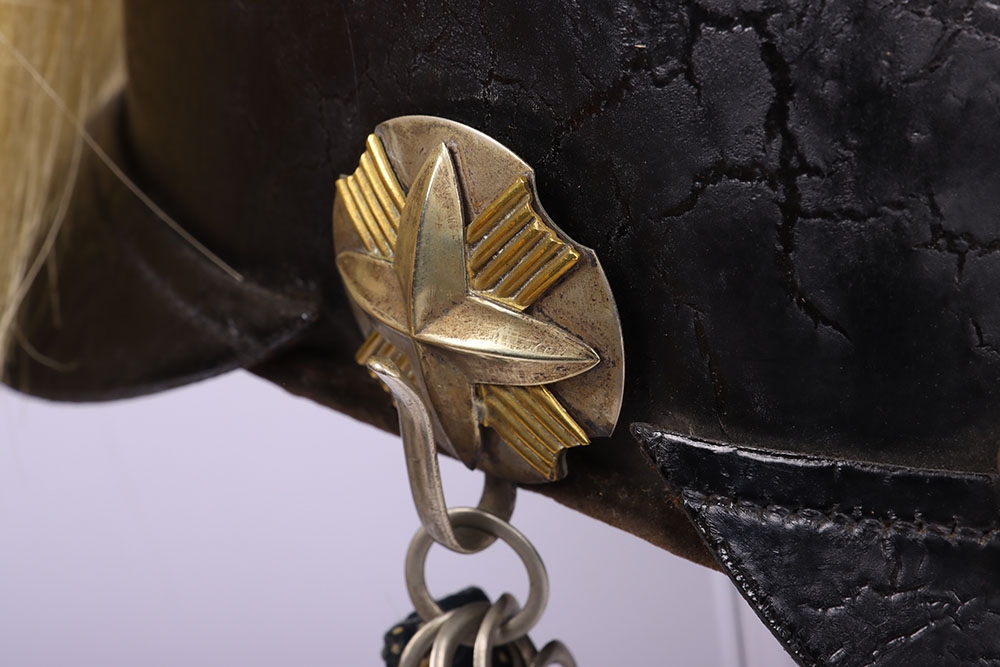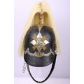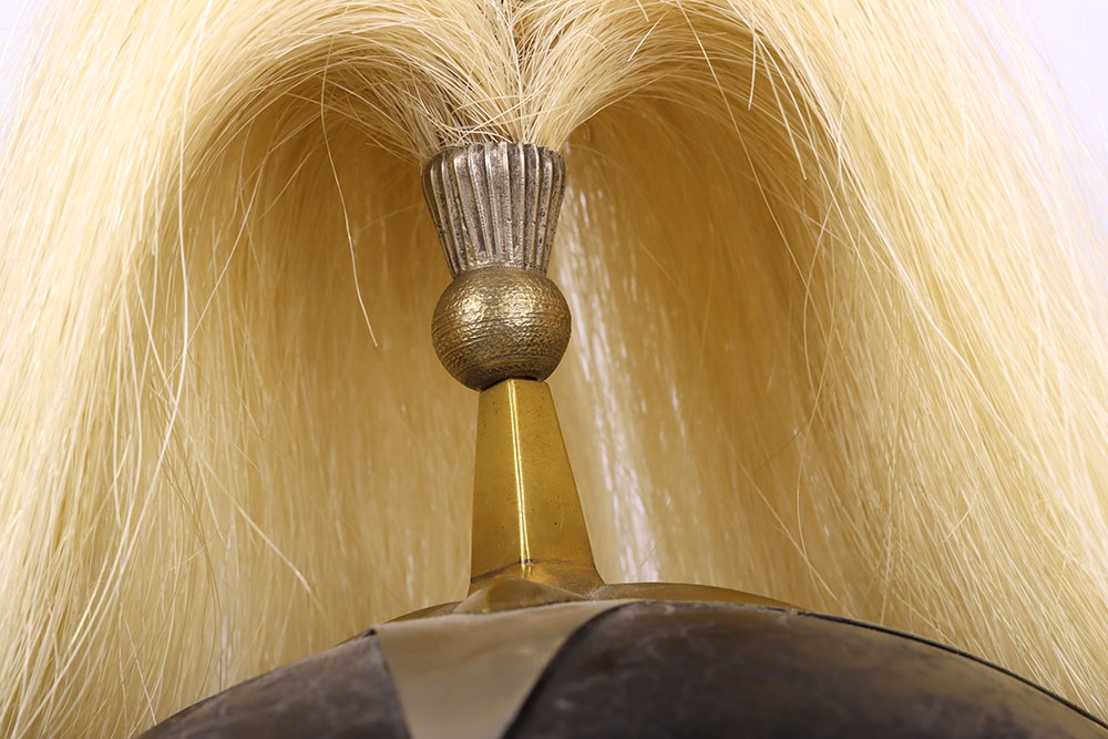 Victorian Fife Mounted Rifles Helmet, good example of the leather bodied dress helmet with white metal and brass regimental helmet plate to the centre. Regimental pattern side bosses with linked chinstrap. Plume socket with white horse hair plume intact. Quilted cloth lining to the interior of the helmet. Generally a good example.