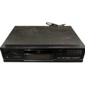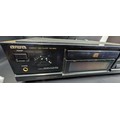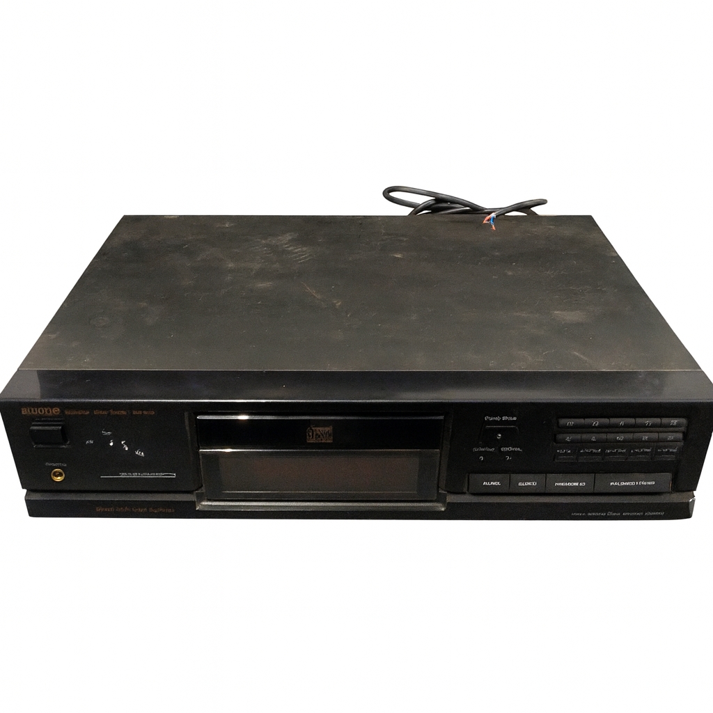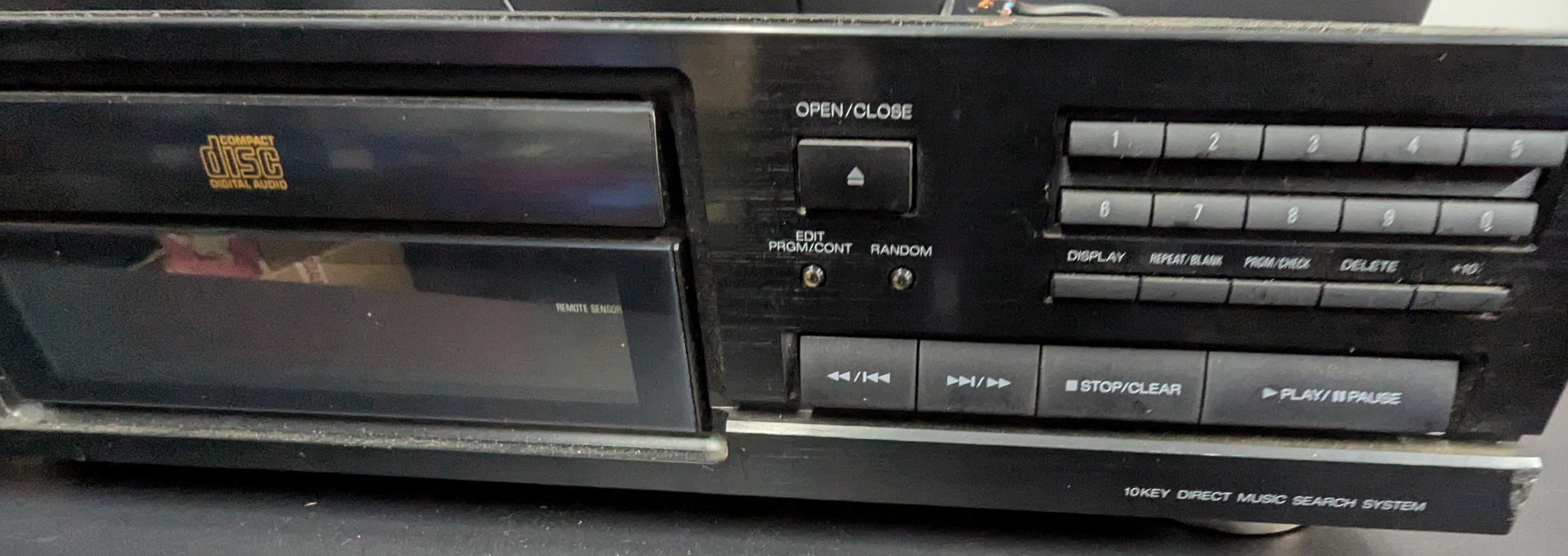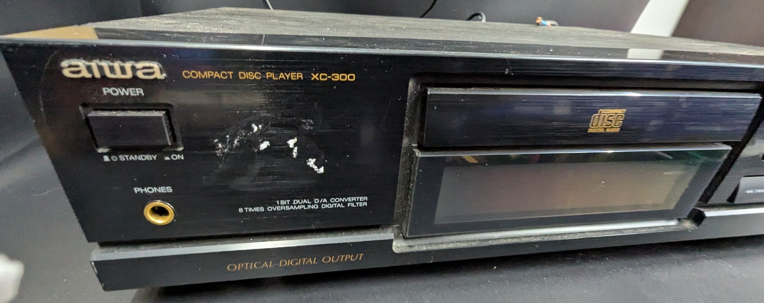 Aiwa XC-300 Compact Disc Player, a late-1980s/early-1990s single-tray Hi-Fi CD deck featuring 1-bit dual D/A converter, 8× oversampling digital filter, optical digital output, and Aiwa’s 10-Key Direct Music Search System. The unit shows heavy cosmetic wear including scratches, scuffs, and residue on the fascia, with dust throughout. Power cord present; untested