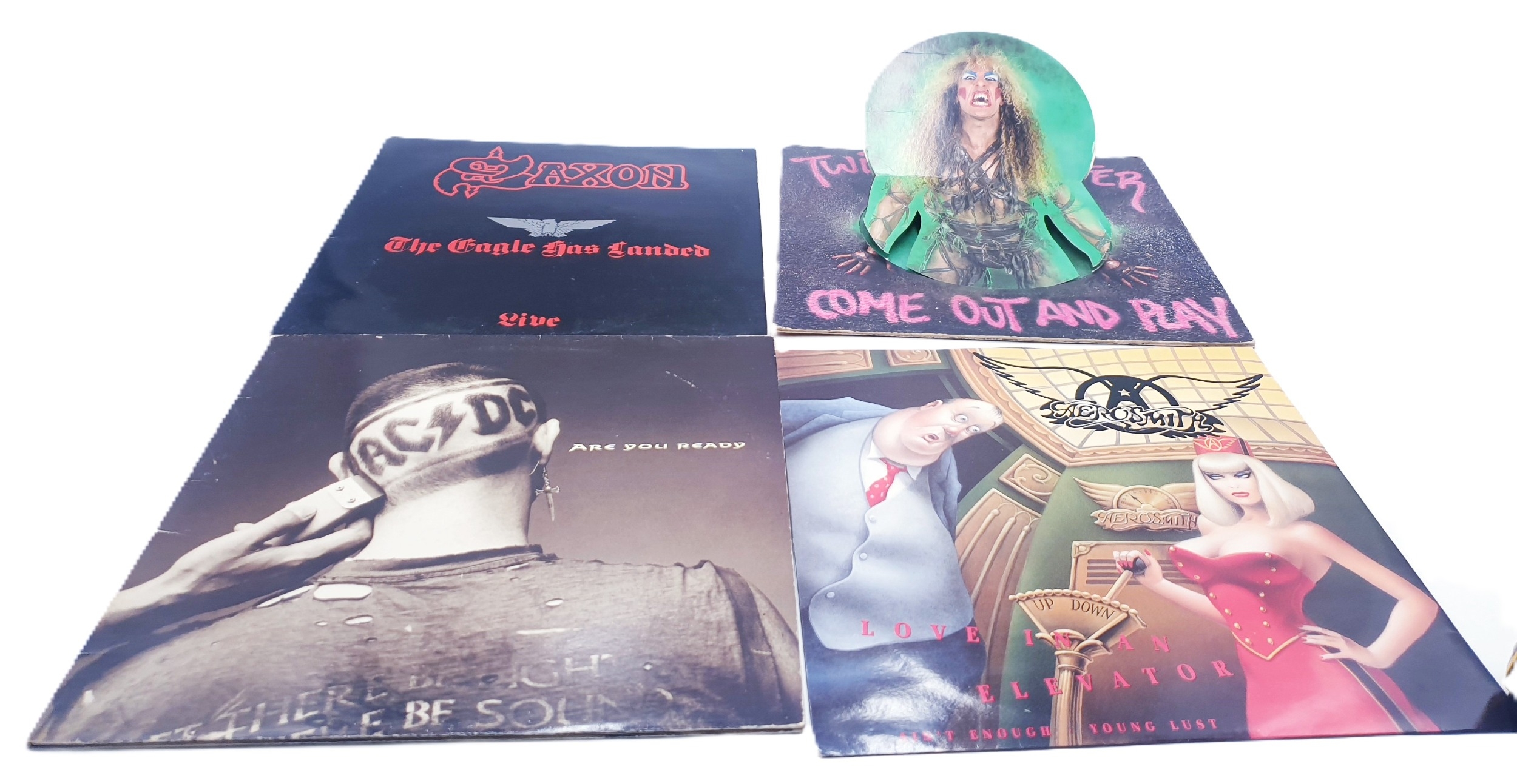 SAXON THE EAGLE HAS LANDED LP WITH EMBOSSED SLEEVE. TWISTED SISTER COME OUT AND PLAY LP WITH THE INNER AND FLIP-UP FRONT SLEEVE USA ISSUE. AC/DC ARE YOU READY GATEFOLD NUMBERED 12 INCH (NUMBERED 12071). AEROSMITH LOVE IN AN ELEVATOR 12 INCH. THE VINYL RANGES FROM VG+ TO EXCELLENT. THE SLEEVES RANGE FROM GOOD+ TO EXCELLENT.(Photographed On 28/08)