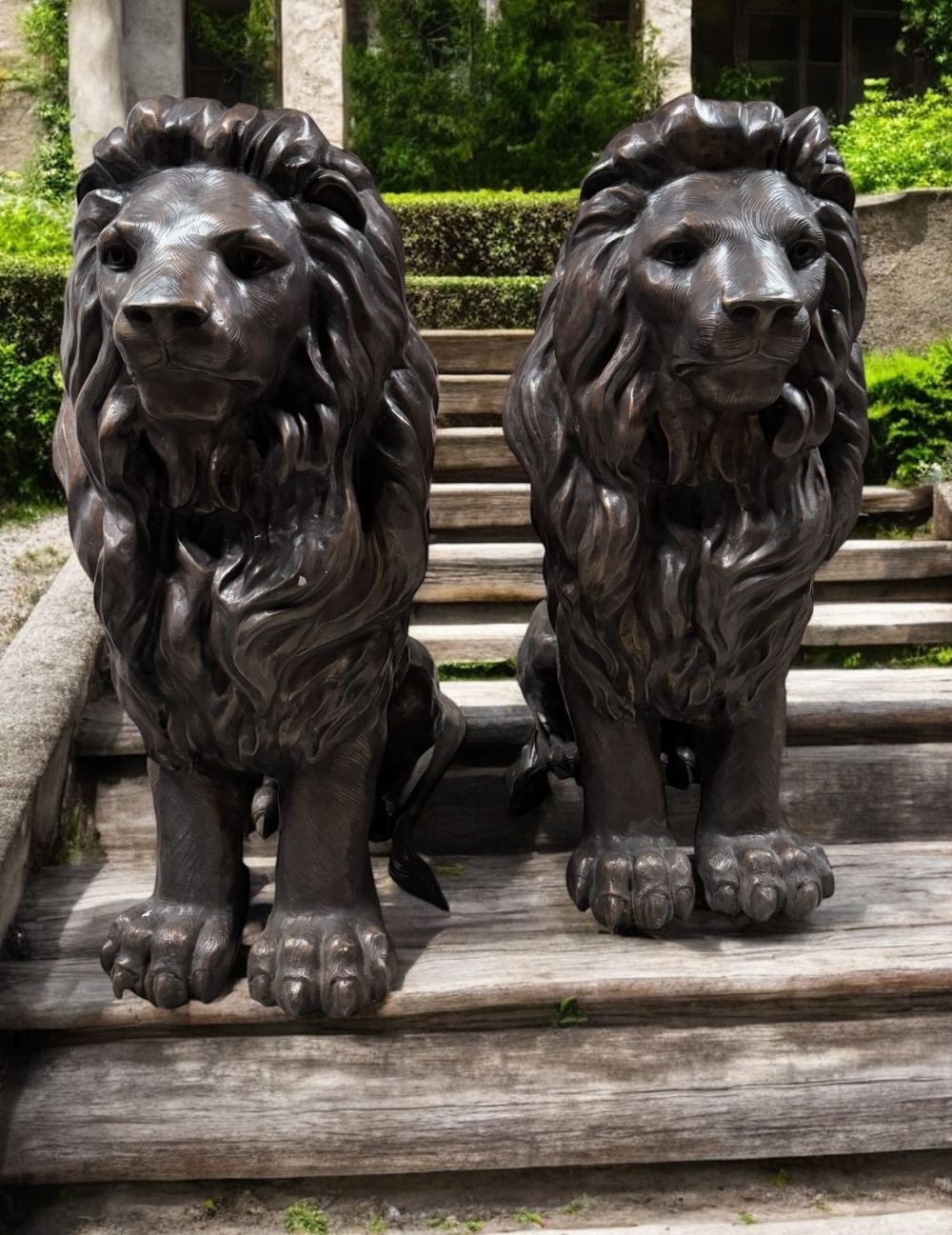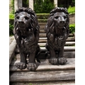 A PAIR OF BRONZE GARDEN ORNAMENTS, in the form of seated lions. Dimensions: 36 inches high approx. **PLEASE NOTE** This lot is DELIVERY ONLY – the bidder cannot collect the lot. Please contact our in-house recommended delivery services in Lot 1 for a quotation prior to bidding