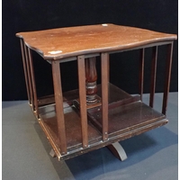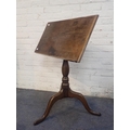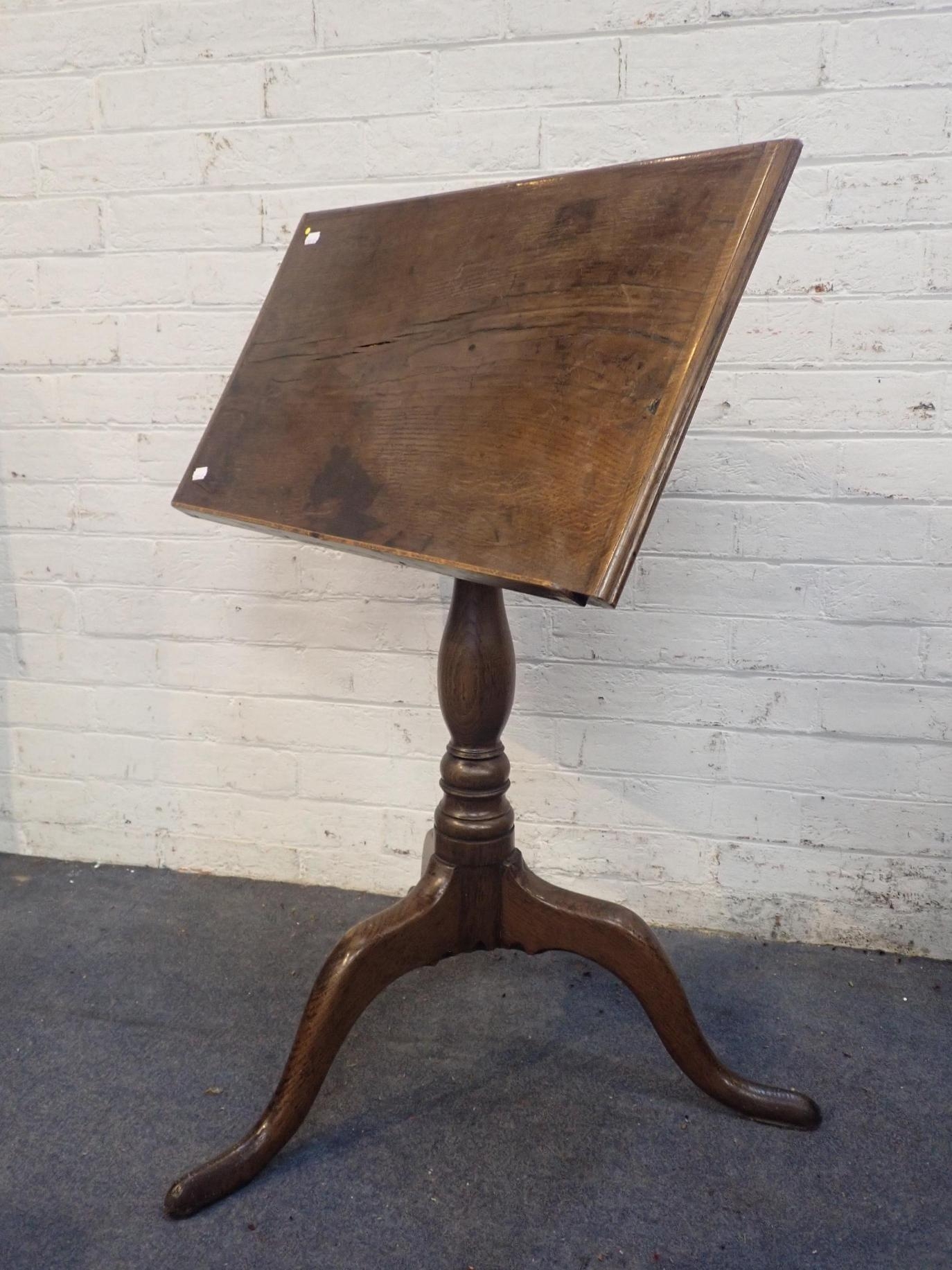 A 19th CENTURY OAK ADJUSTABLE SLOPE READING STANDwith turned stem and tripod base, 65cm wide (later brass fittings)