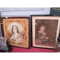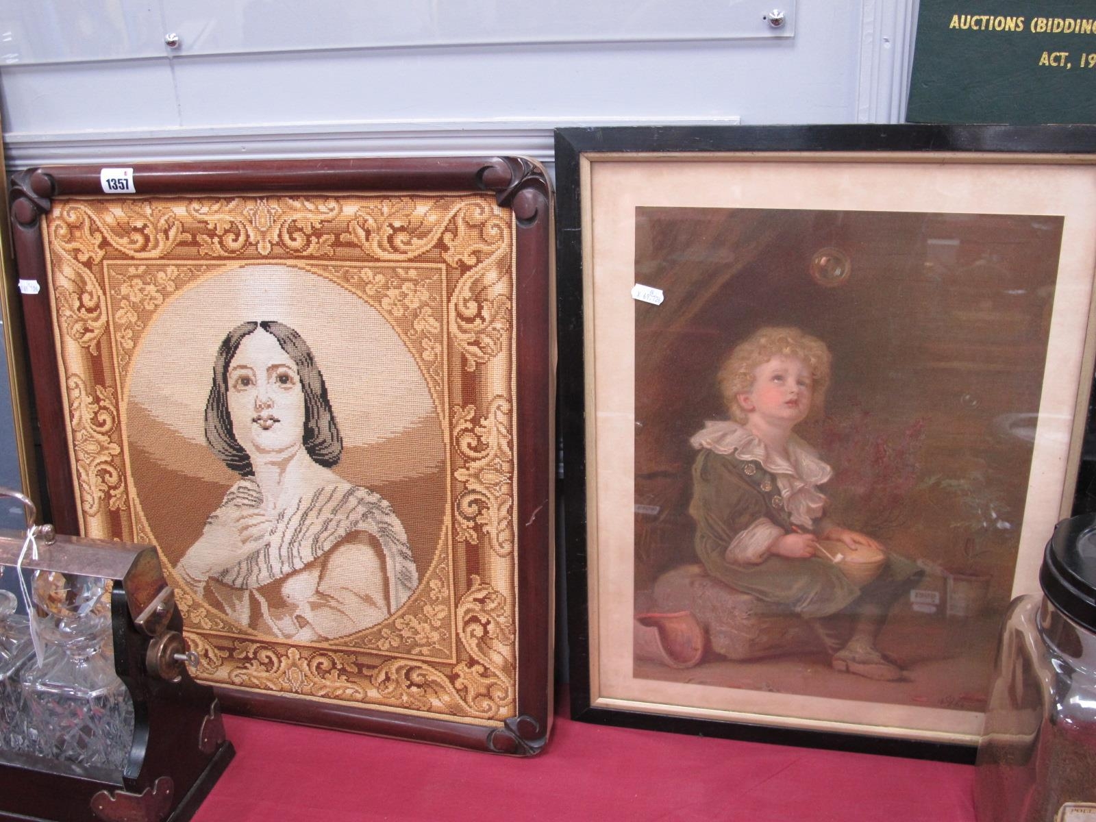 XIX Century Needlework Panel Featuring Lady, in mahogany frame, overall 52 x 49cm, 'Bubbles' Pears print 42.5 x 33cm. (2).