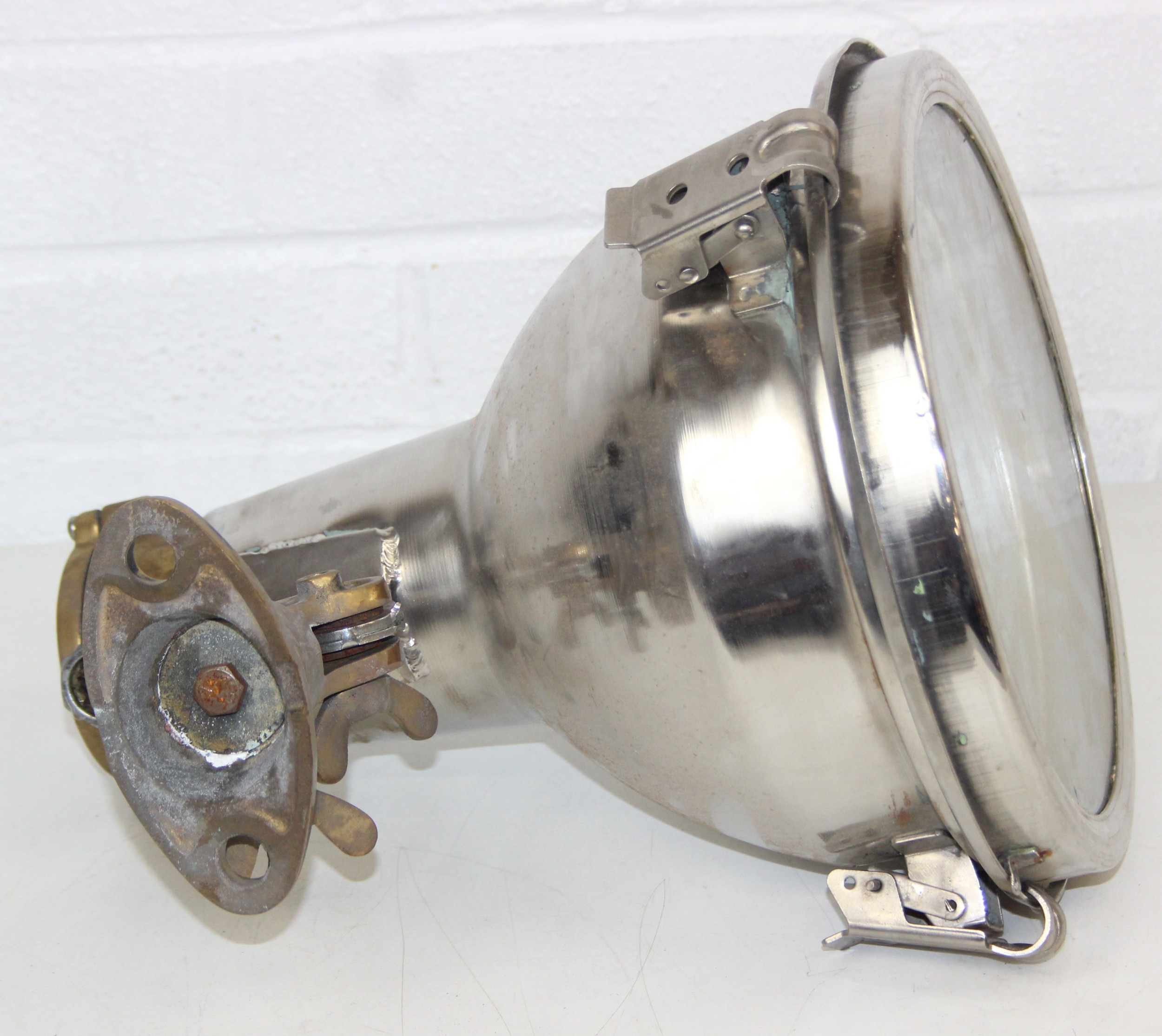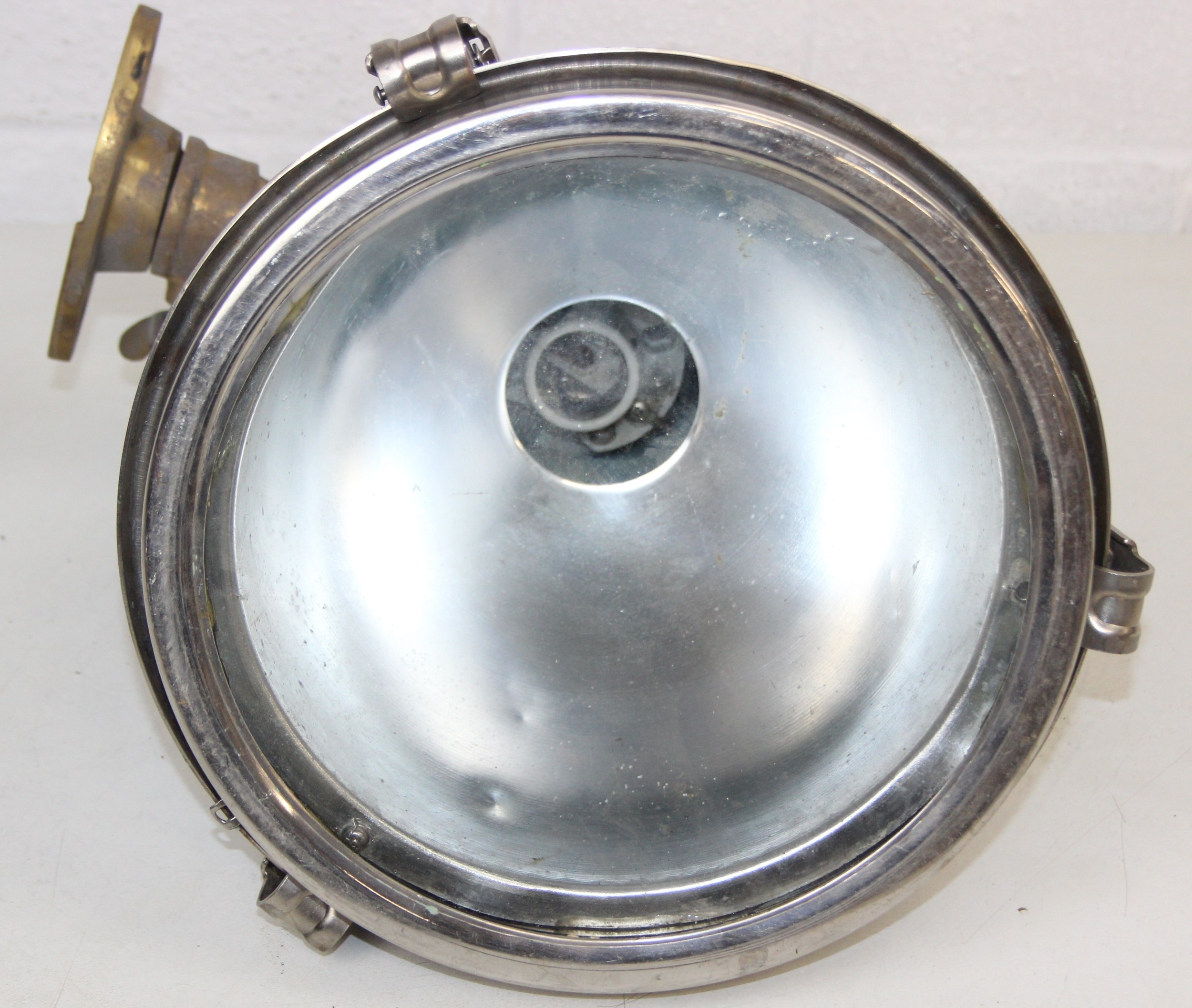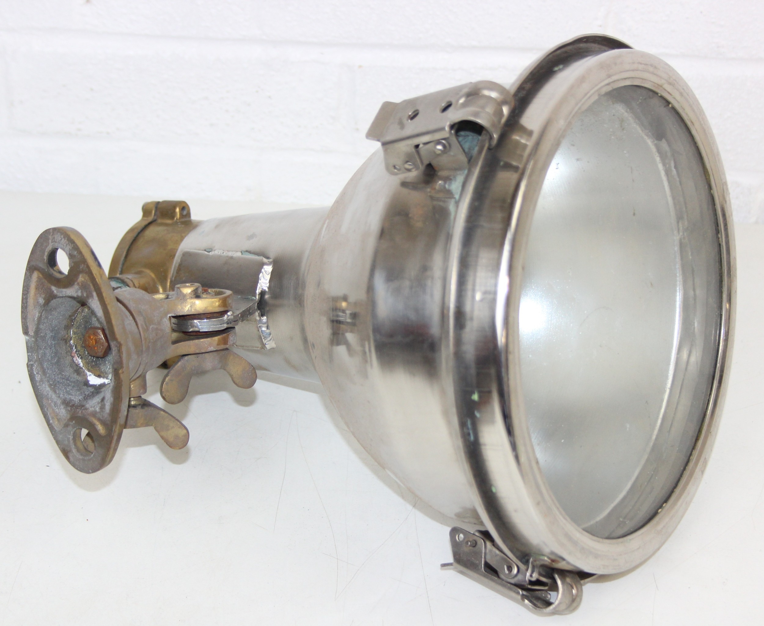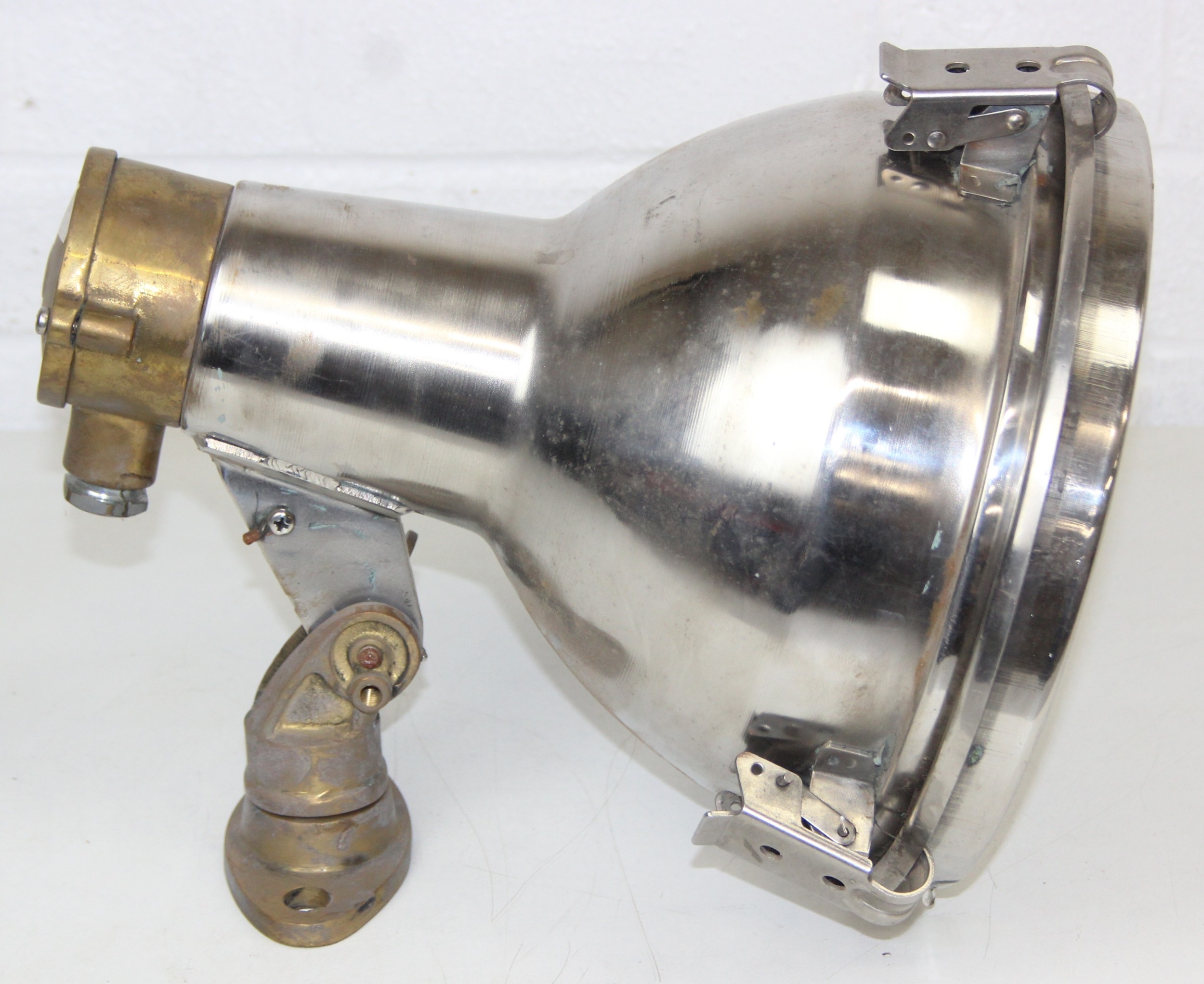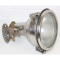 Marine lamps - chrome and brass spot lamp with three snap fastenings to lens, marked Dae Yang, diameter 26cm depth 30cm excluding bracket