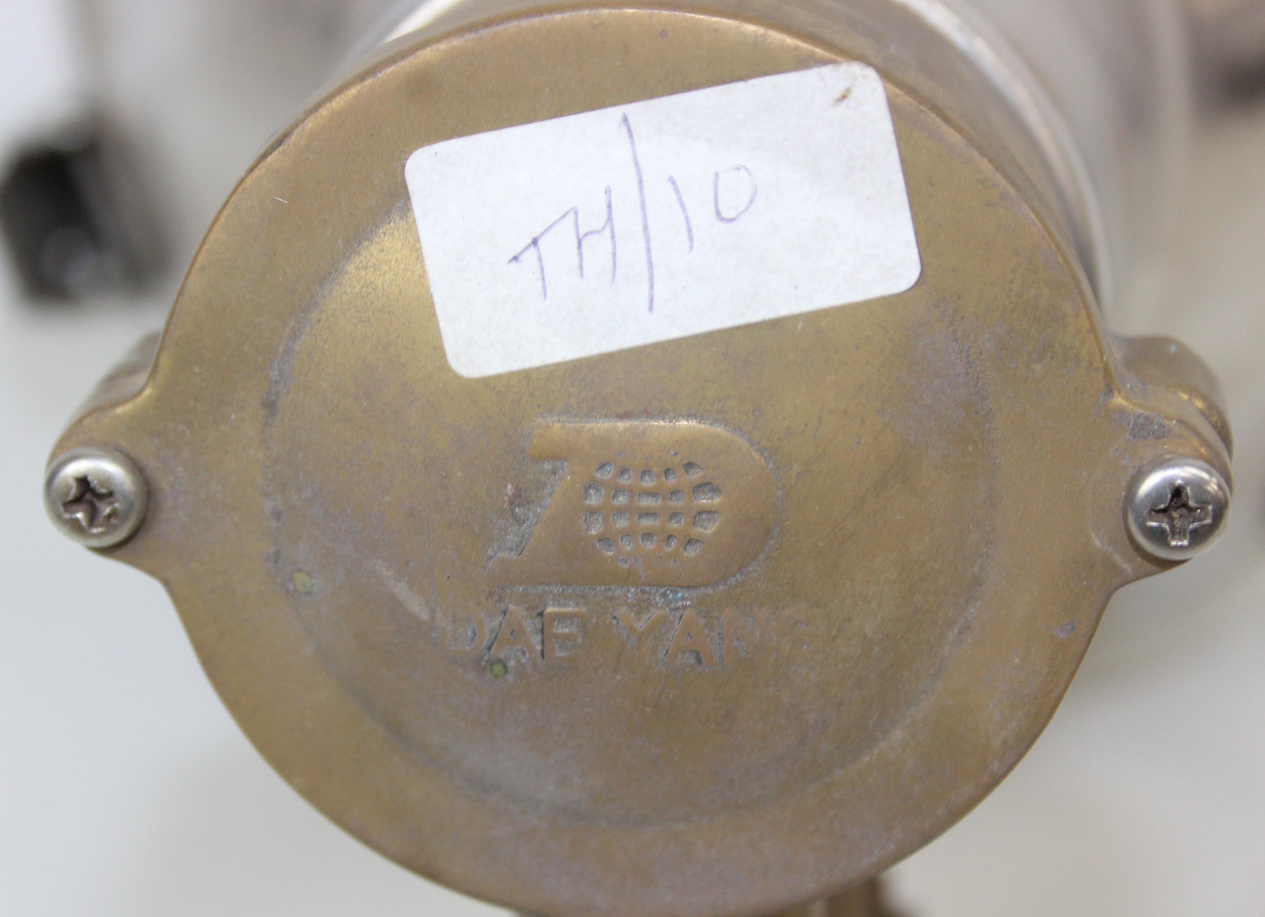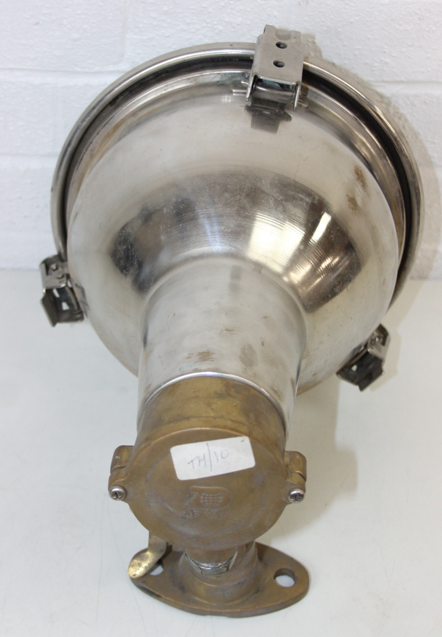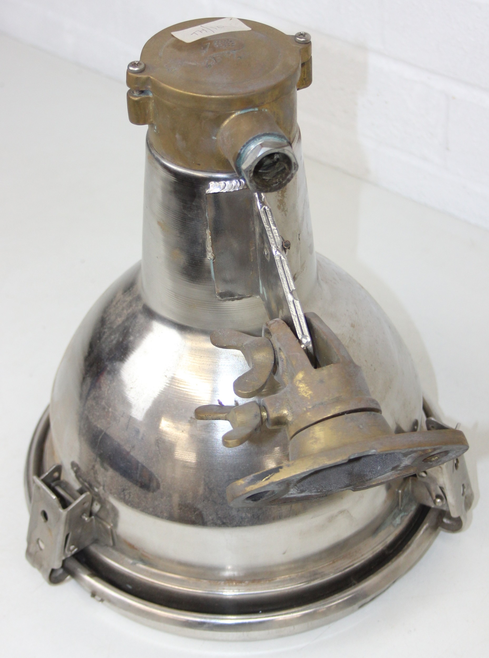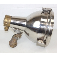 Marine lamps - chrome and brass spot lamp with three snap fastenings to lens, marked Dae Yang, diameter 26cm depth 30cm excluding bracket