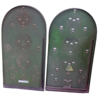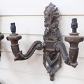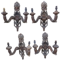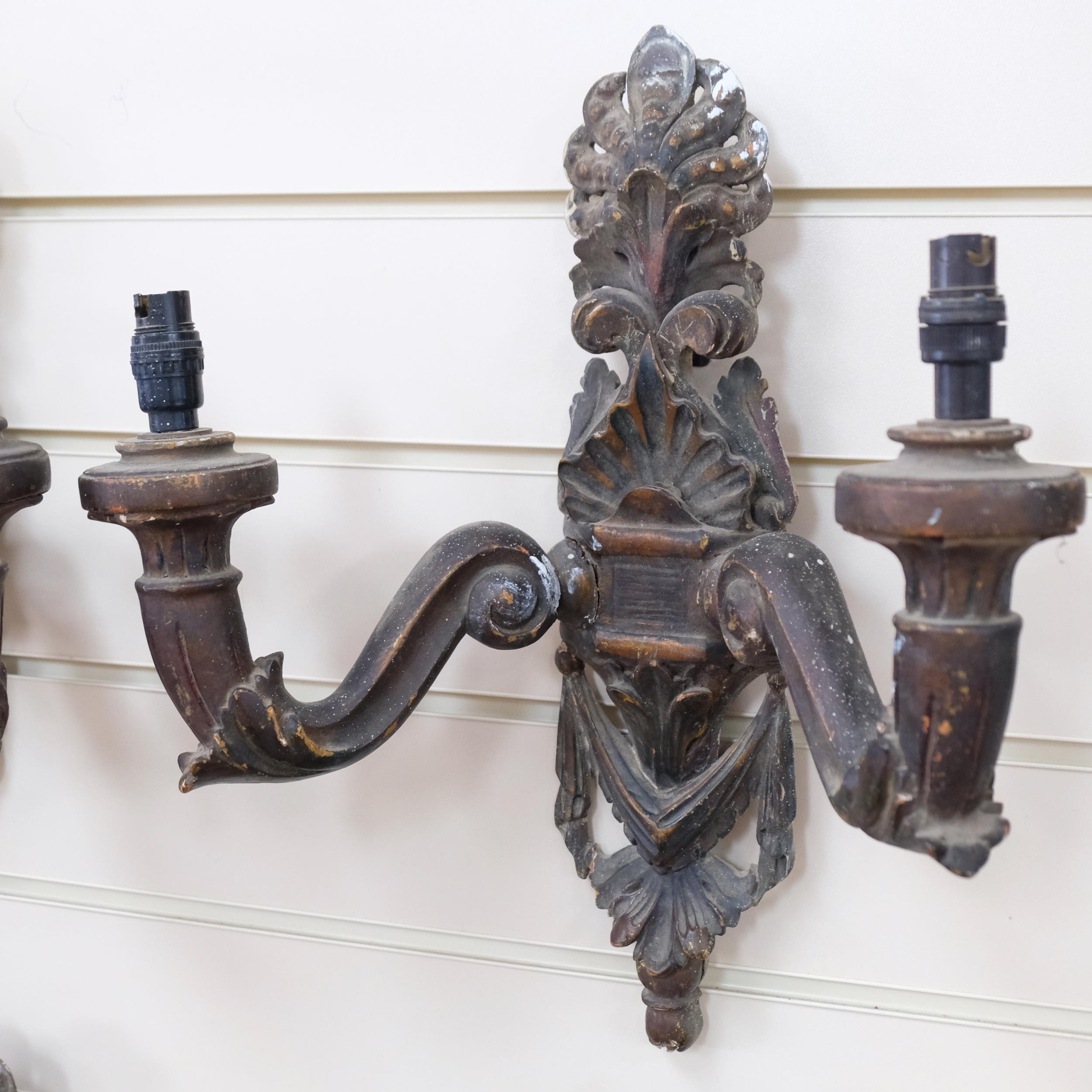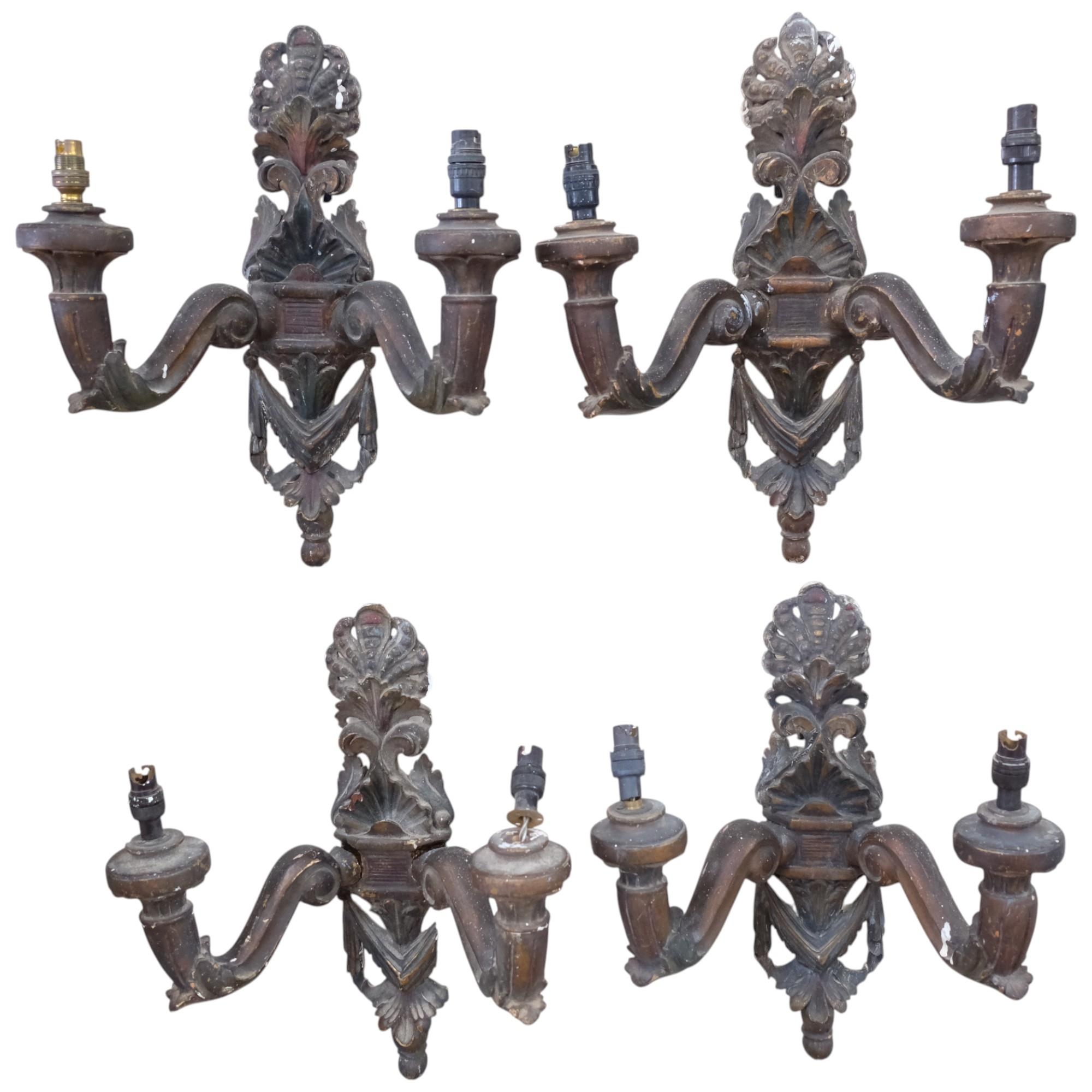 A set of 4 Italian Antique carved wood polychrome and gilded 2-branch wall sconces, a swag and acanthus leaf decoration, L40cm