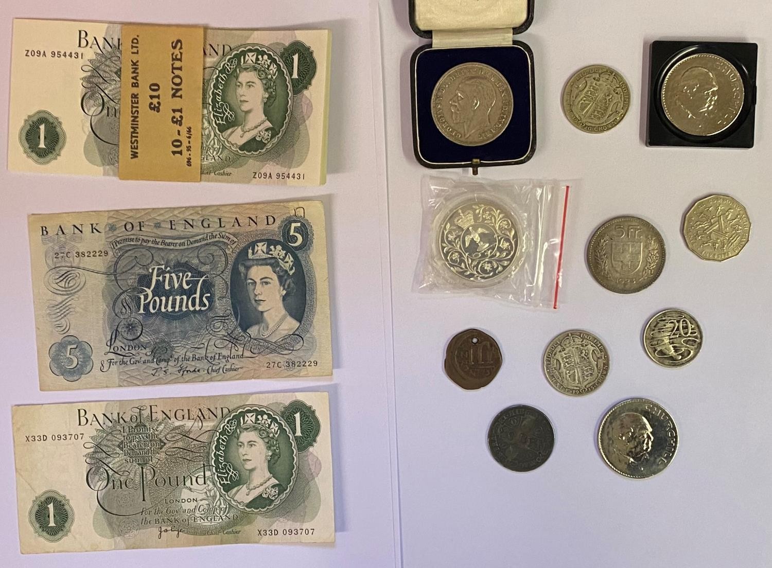 A group of assorted commemorative and other coins, and a group of banknotes including a run of ten £1 and an £5 banknote AK47 655253 (qty)