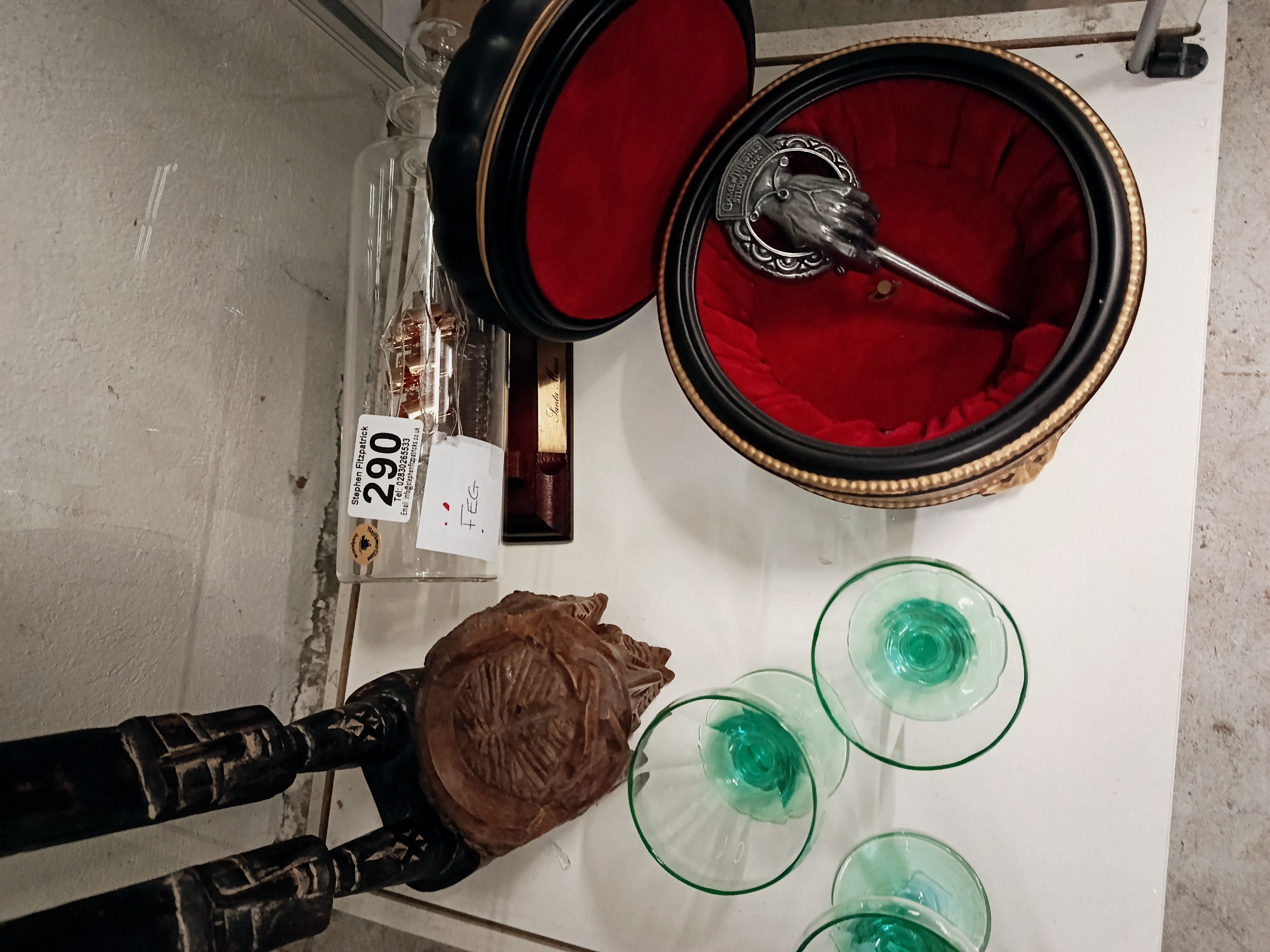 Ship in a bottle & Glasses & Carvings