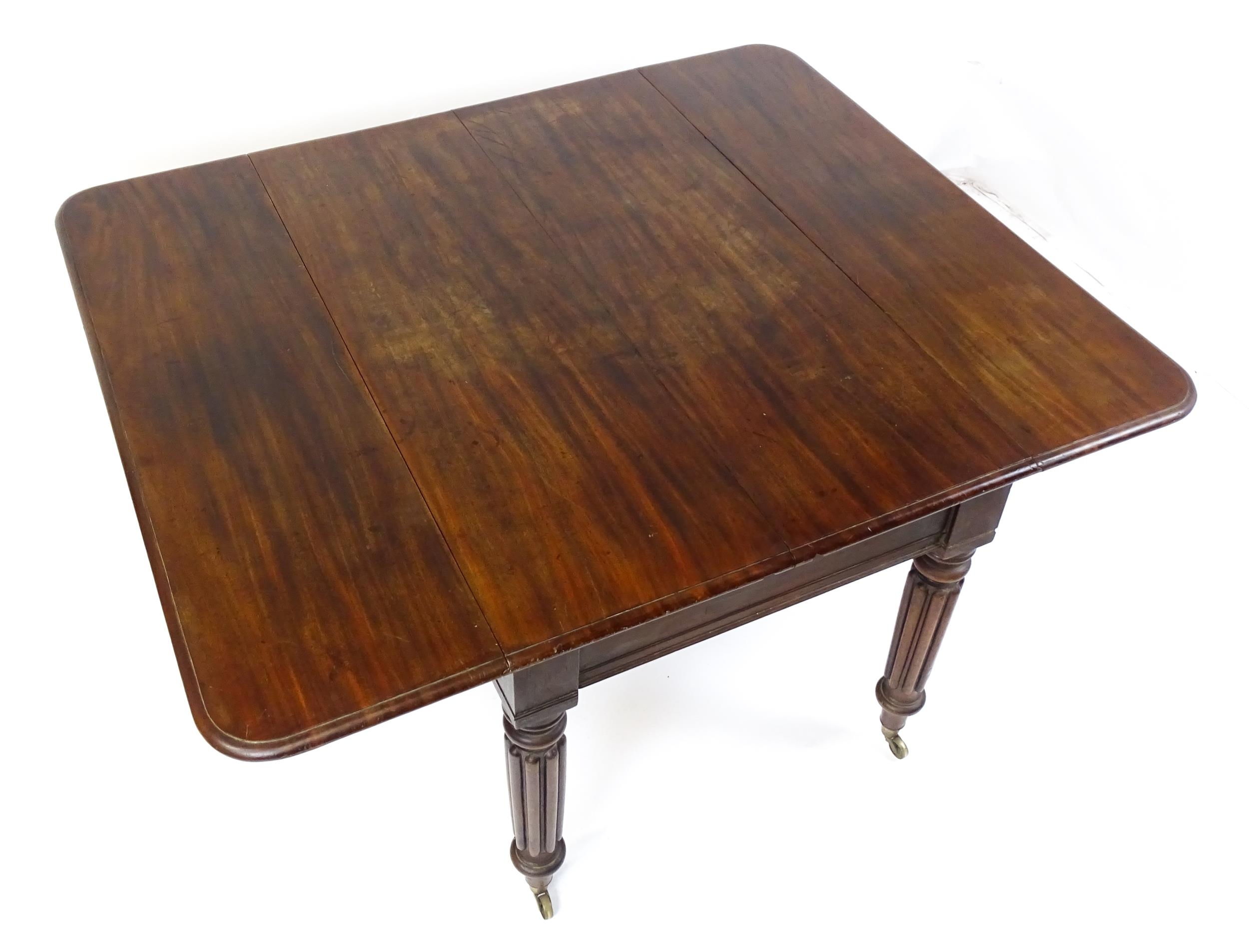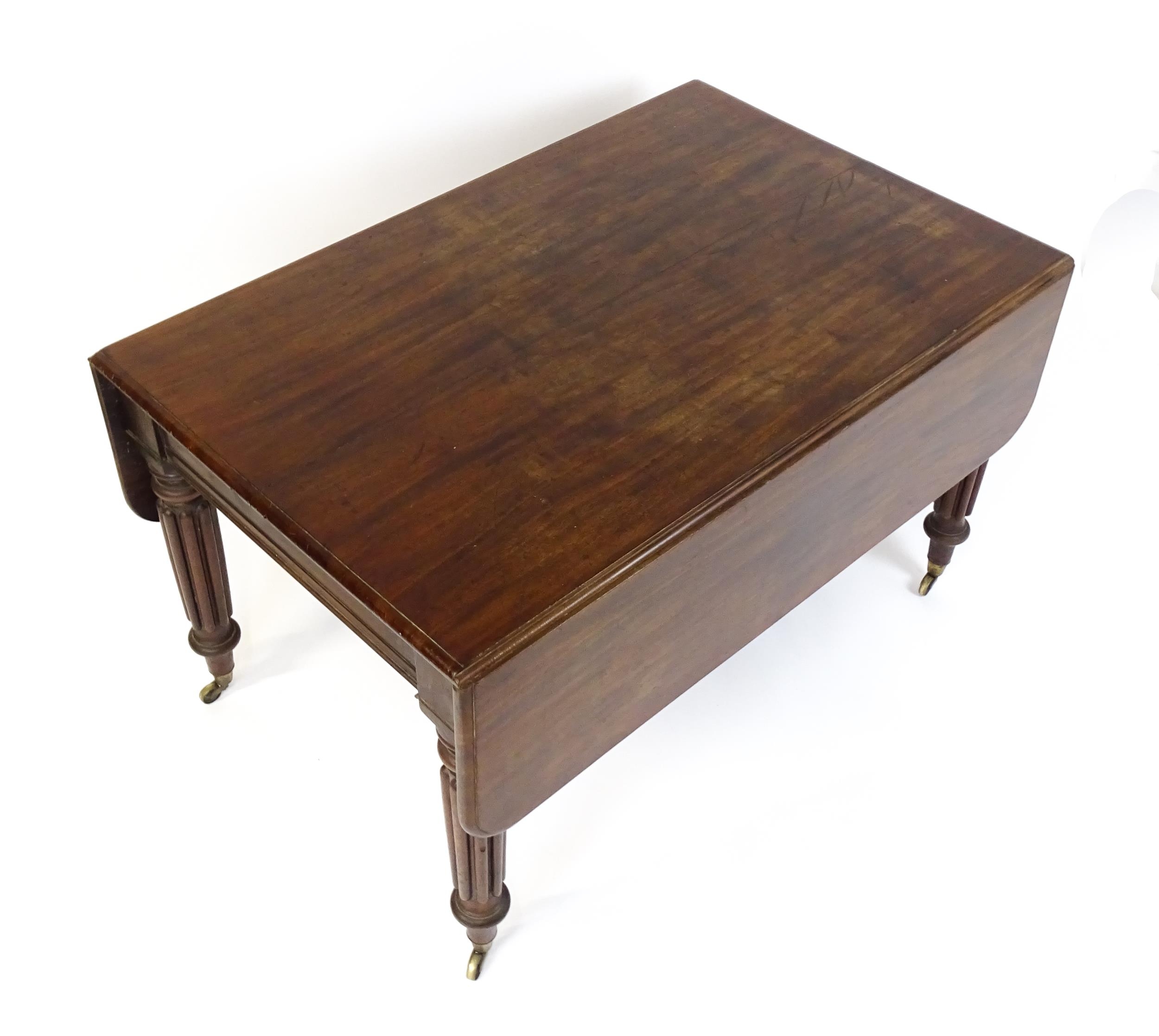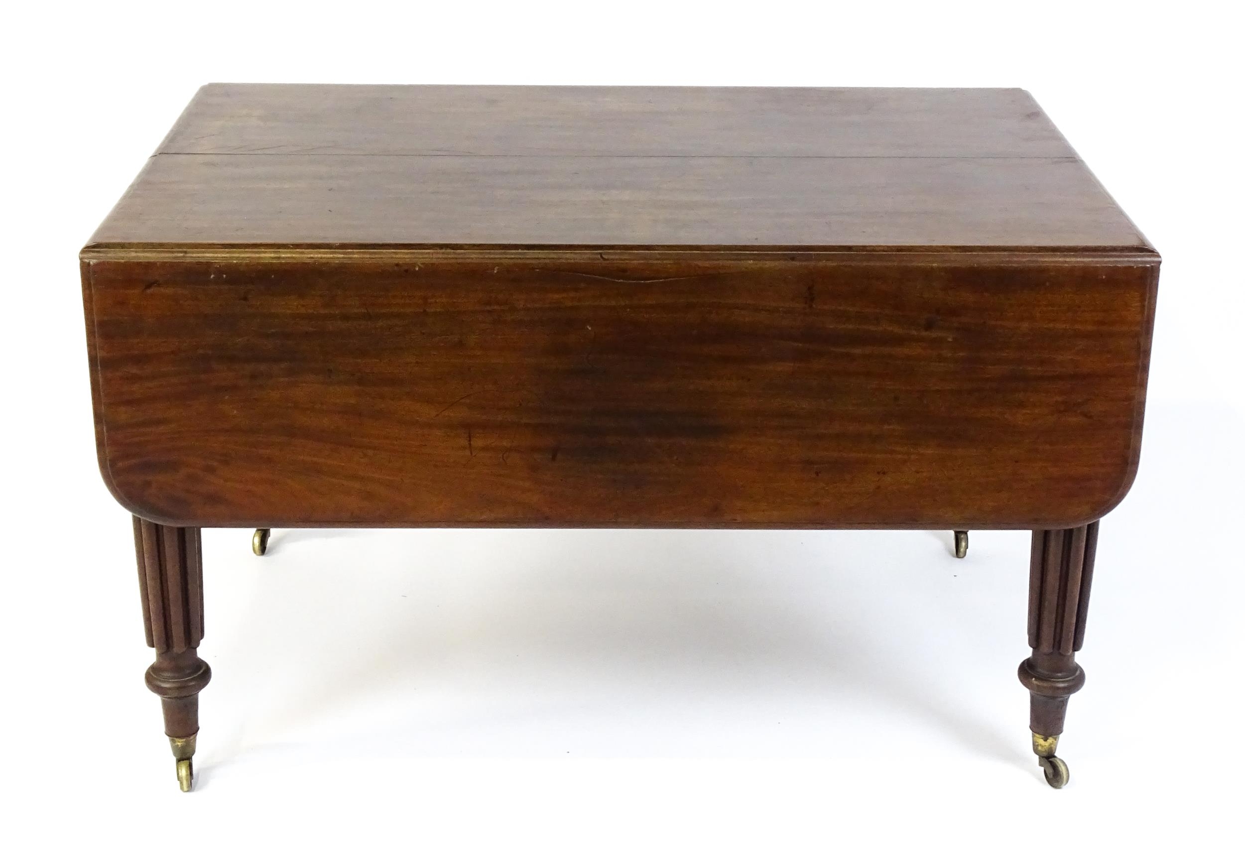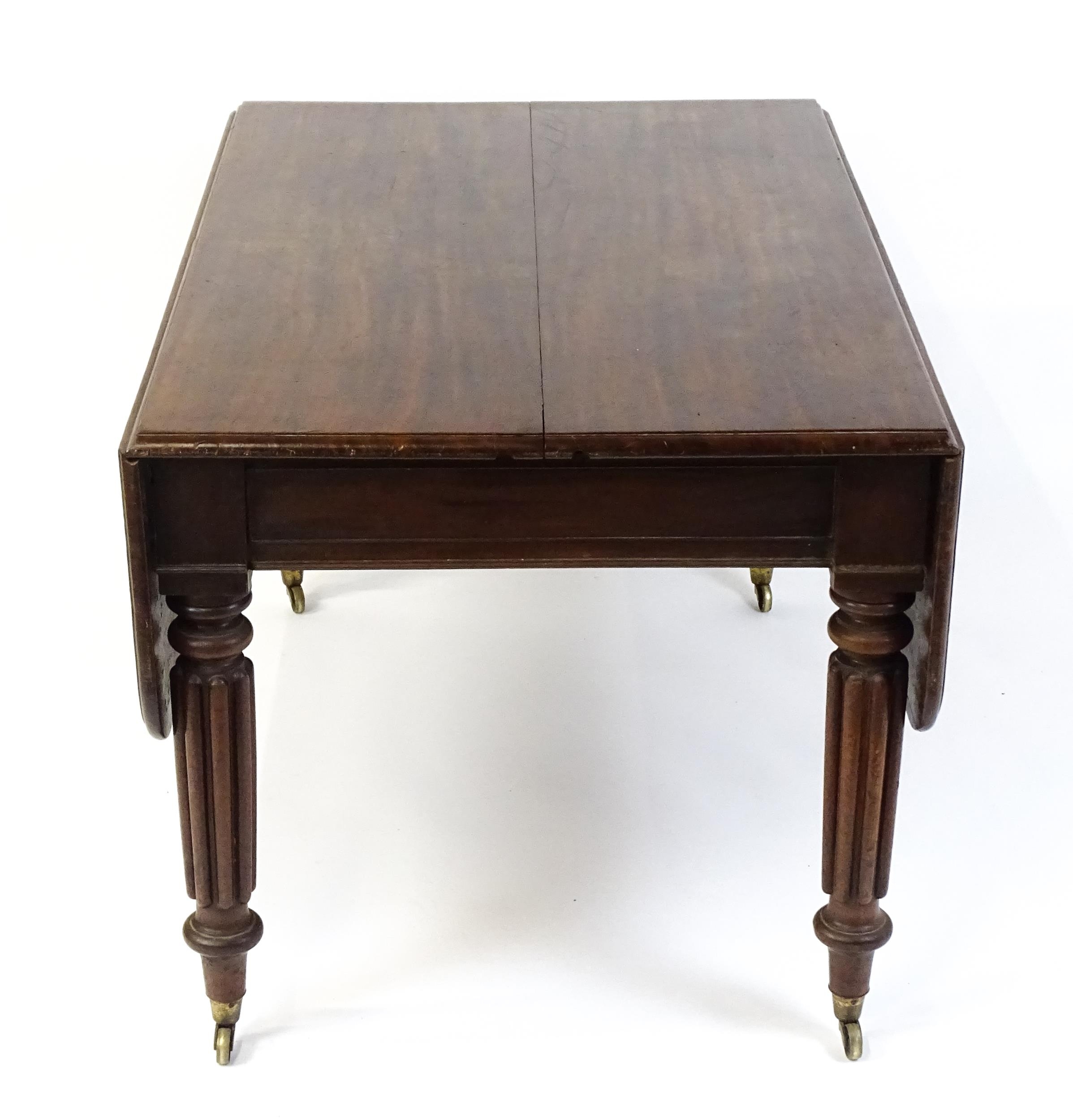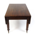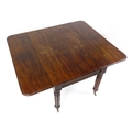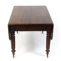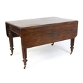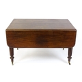 A 19thC Gillows style table raised on turned tapering legs terminating in brass caps and castors. 48" wide x 32" deep x 29" high.
