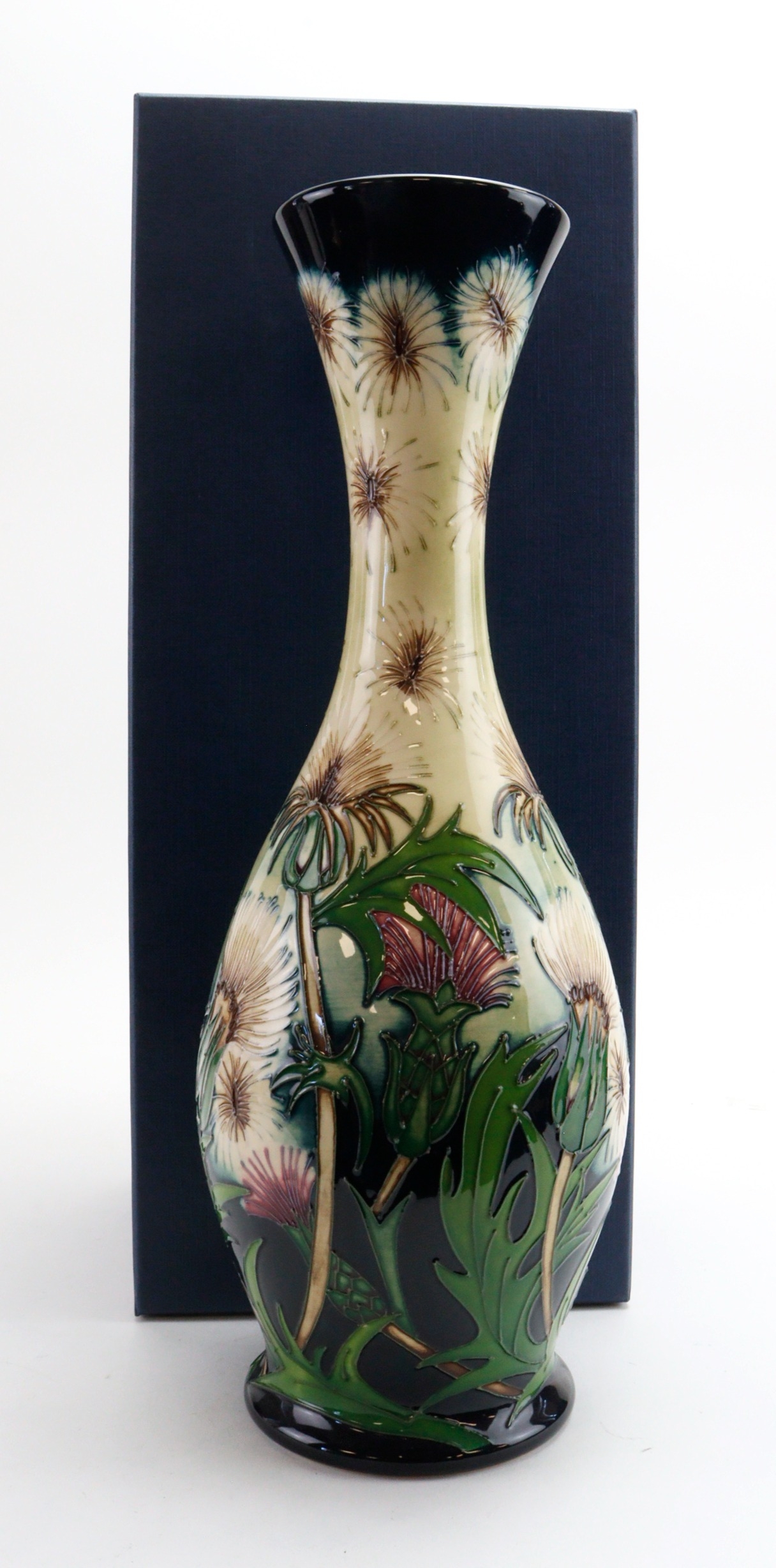 Moorcroft limited edition 'Thistledown' pattern vase, designed by Rachael Bishop, dated 2009, limited edition 100/100, signed by artist and makers marks to base, height 37cm approx., contained in a Moorcroft box