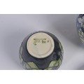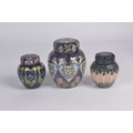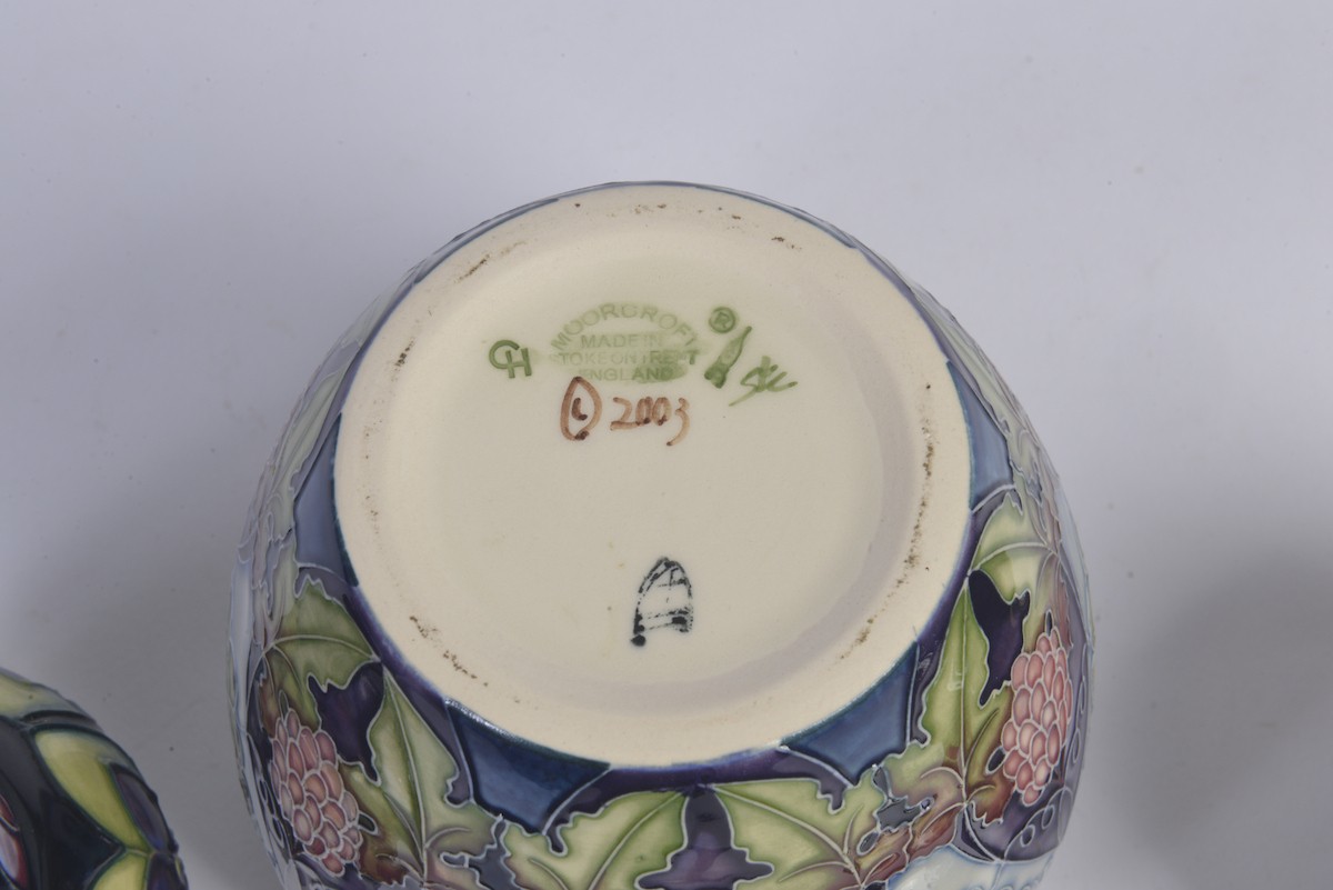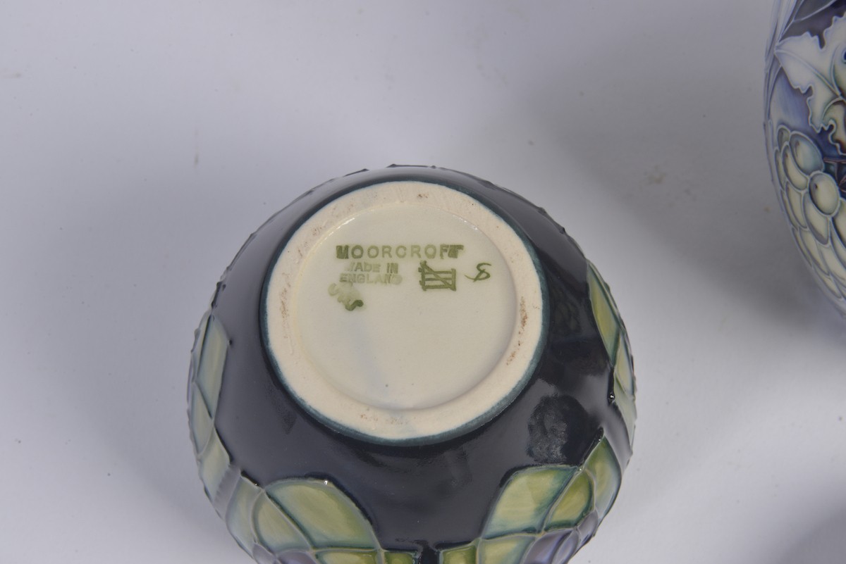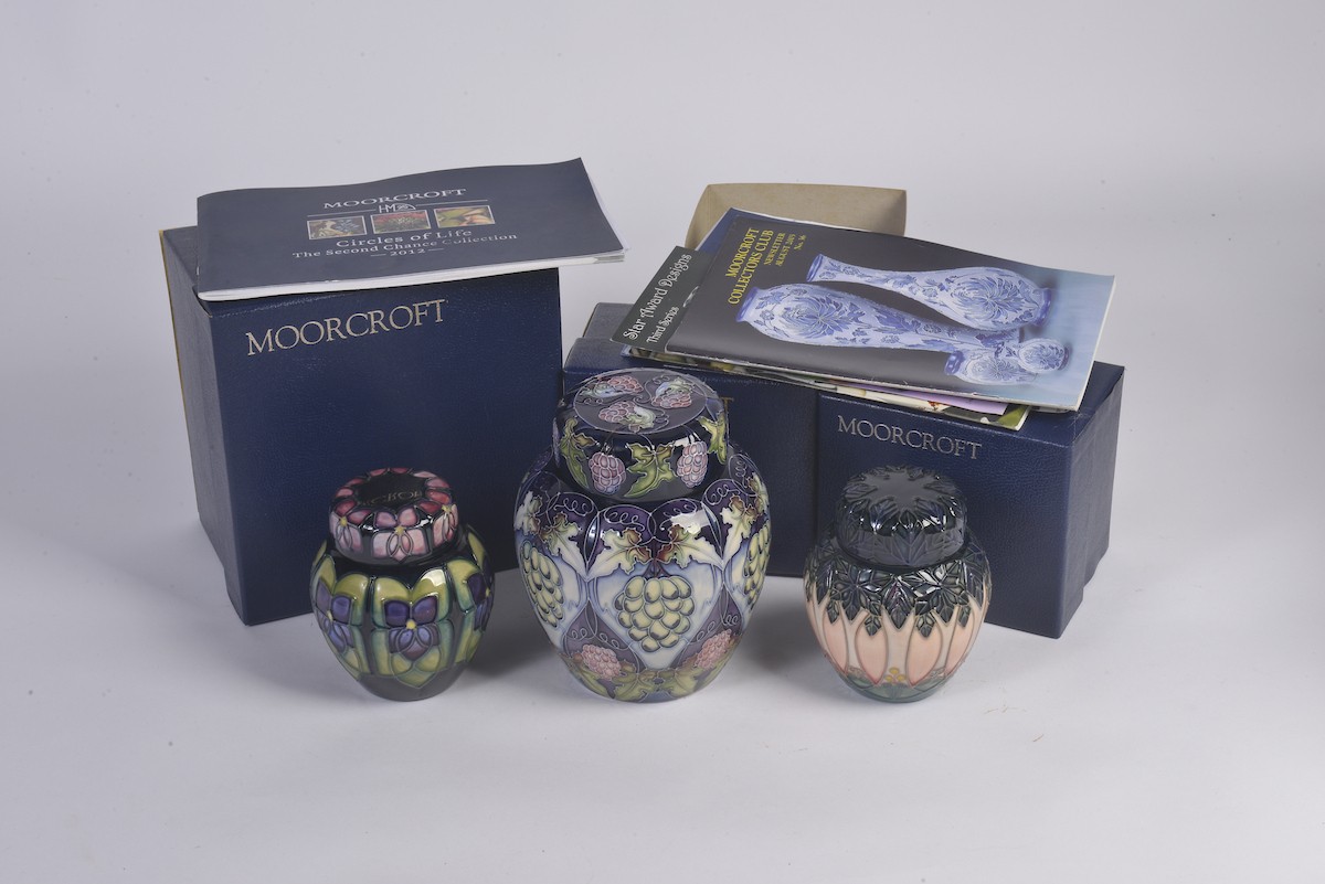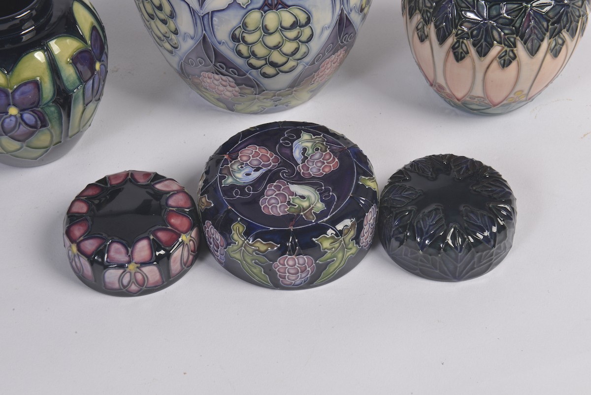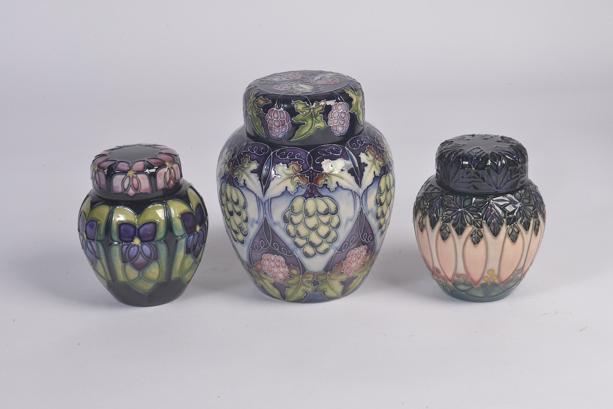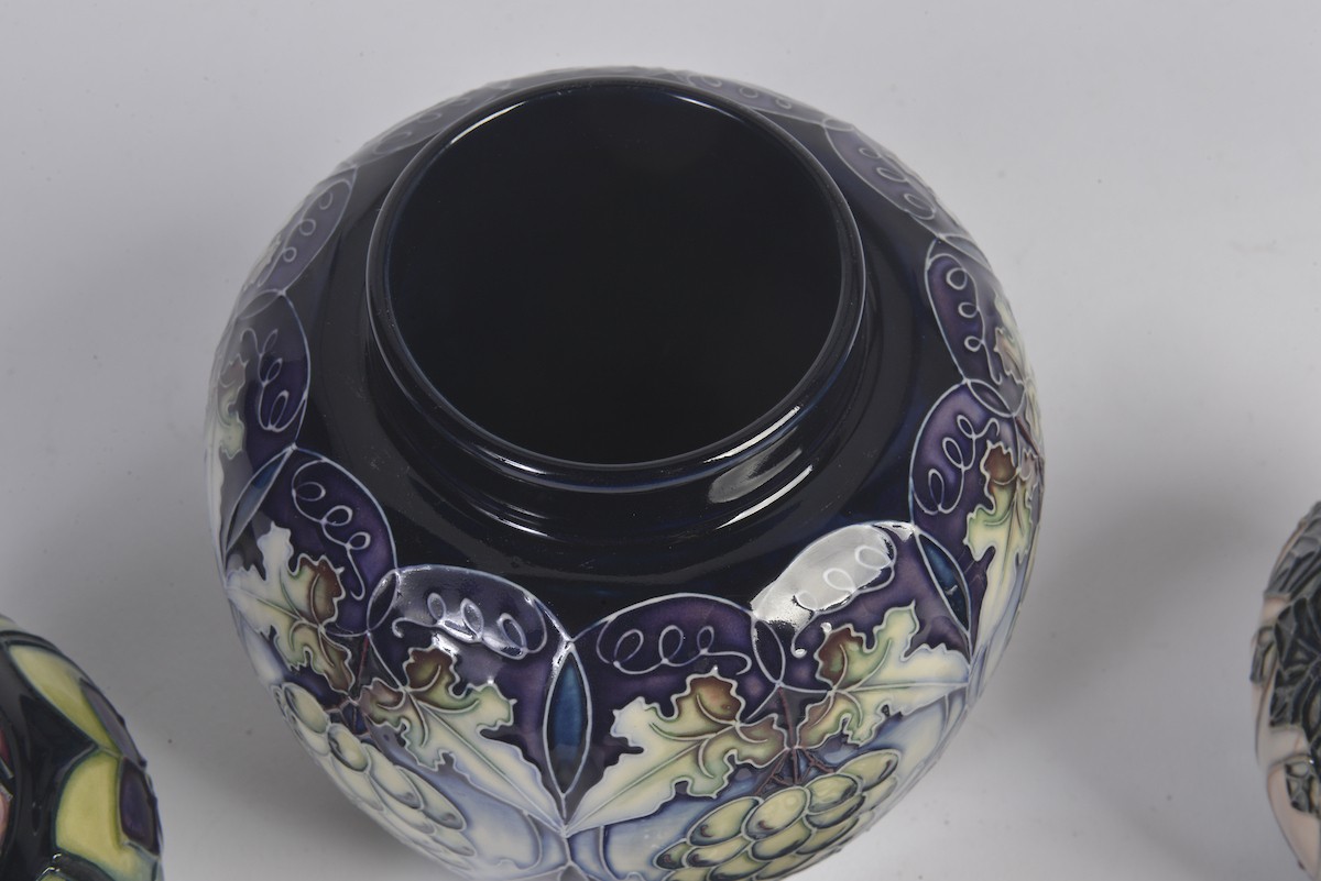 A Grape decorated Moorcroft Ginger Jar & Cover along with Two Smaller Moorcroft Ginger Jars & Covers Complete with Original Boxes & Paperwork. Measuring: 15cms. (Highest).