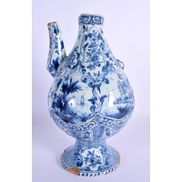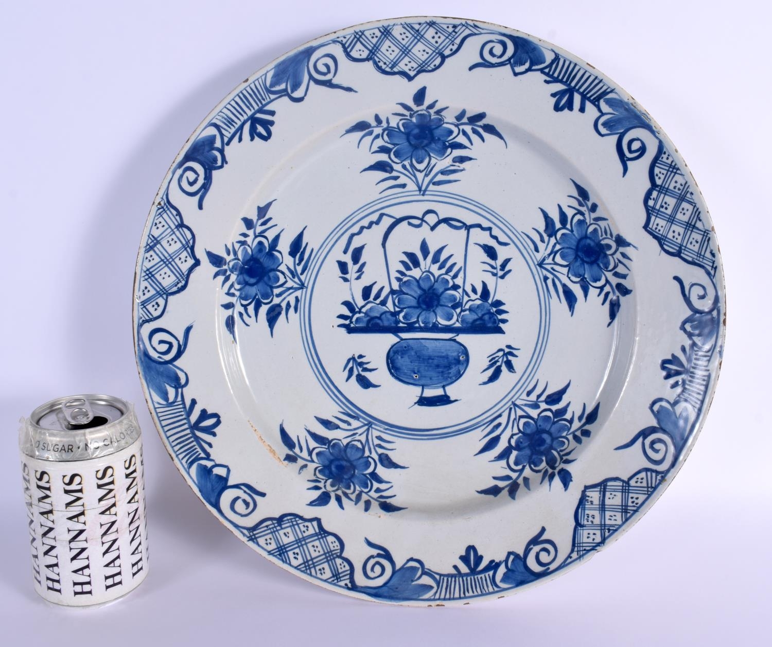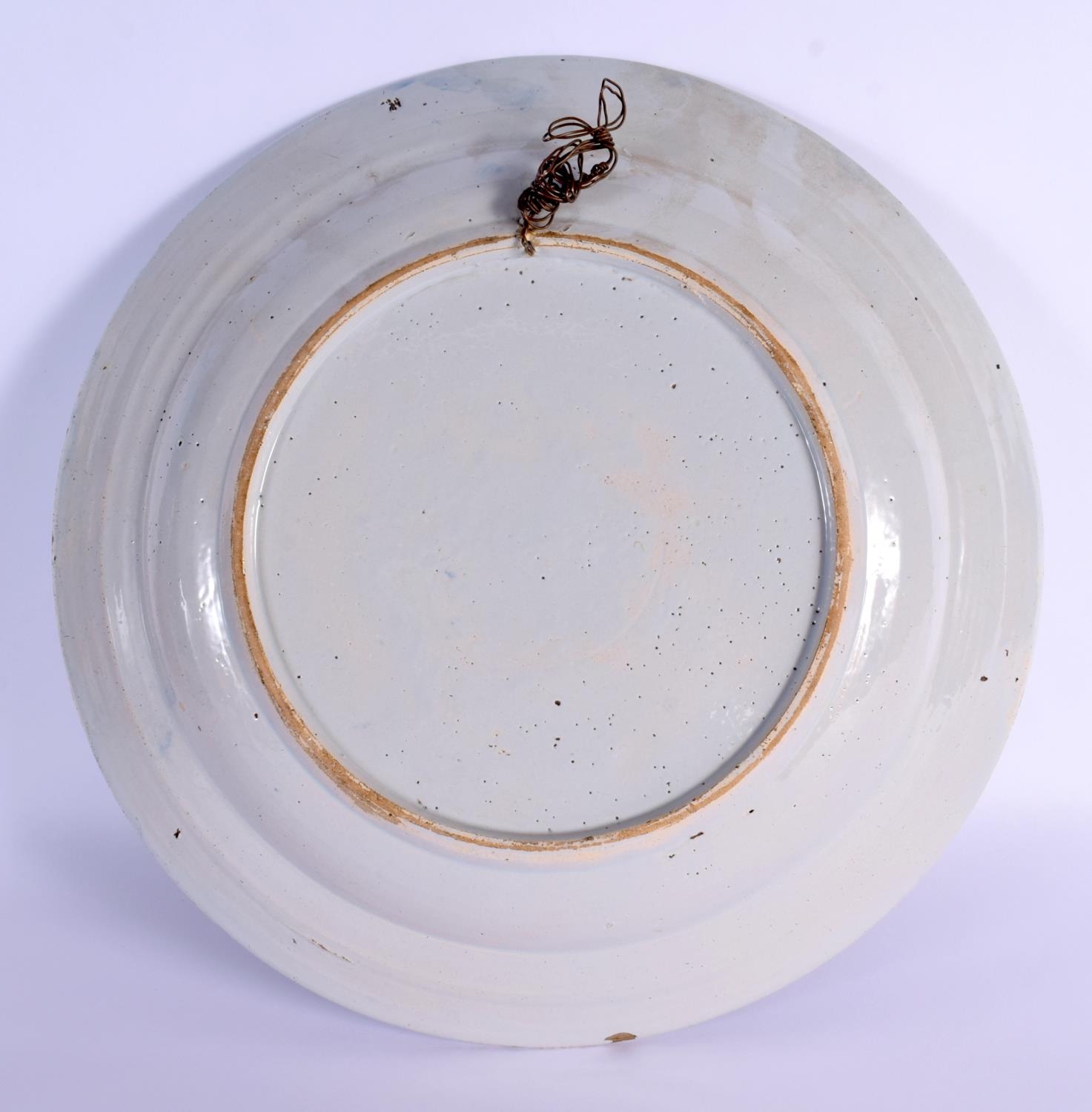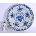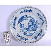 A LARGE 18TH CENTURY DELFT BLUE AND WHITE TIN GLAZED CHARGER painted with flowers. 34 cm diameter.