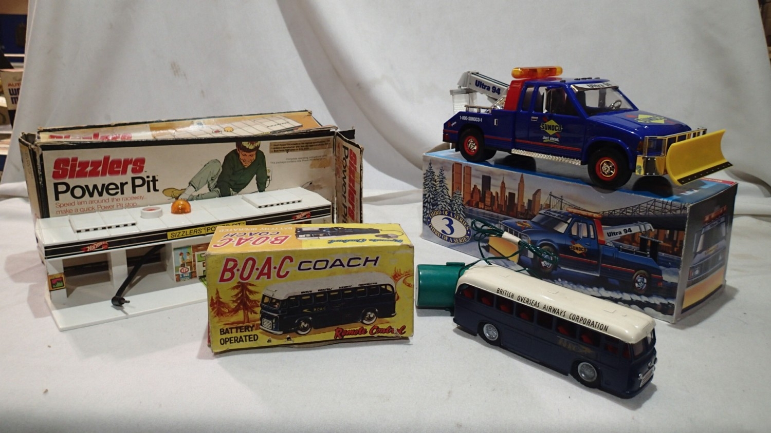 Sizzlers Hot Wheels 'Power Pit', remote control, battery operated, B.O.A.C coach, also 'Sunoco' breakdown truck. UK P&P Group 2 (£24+VAT for the first lot and £5+VAT for subsequent lots)