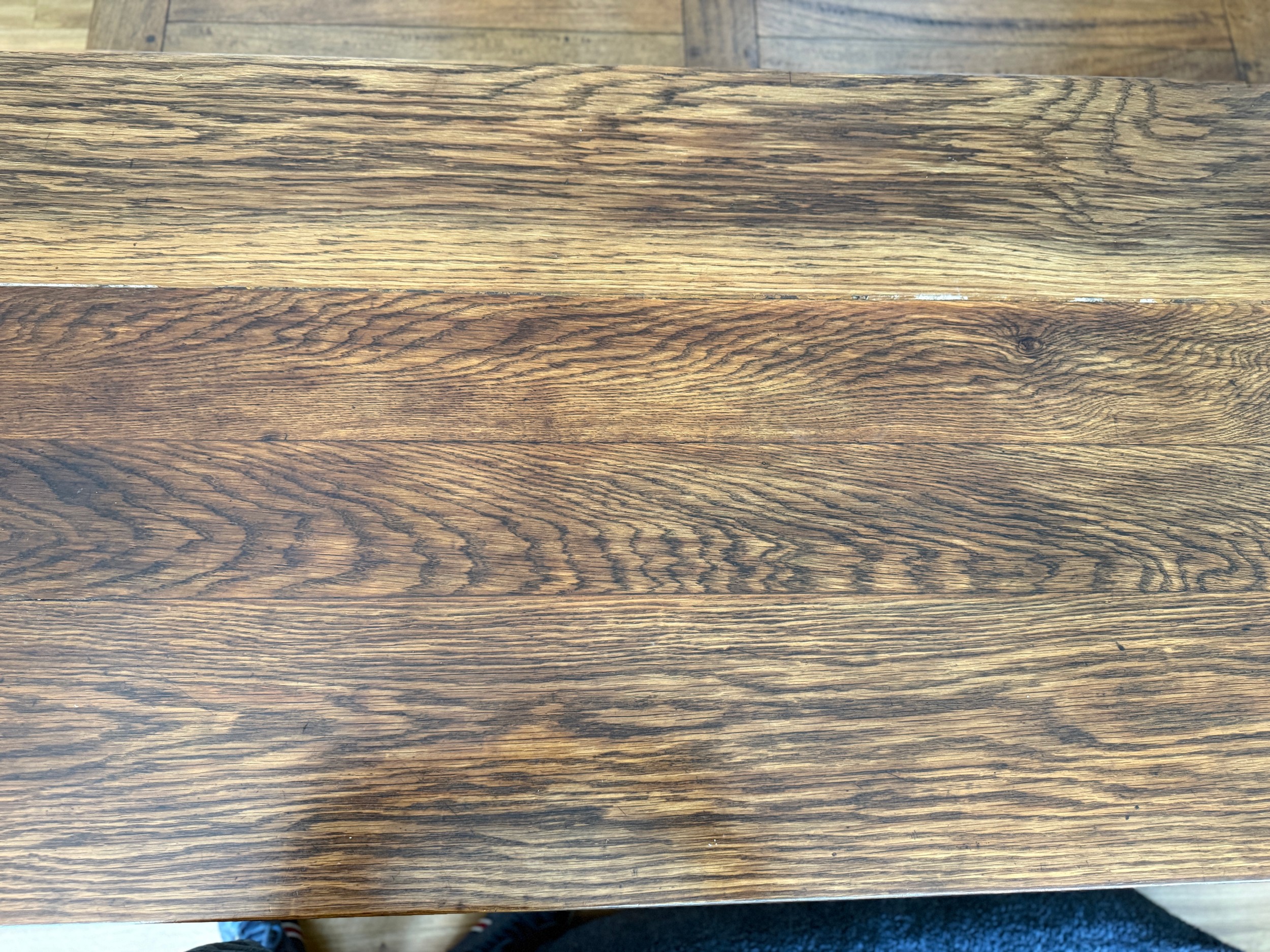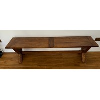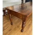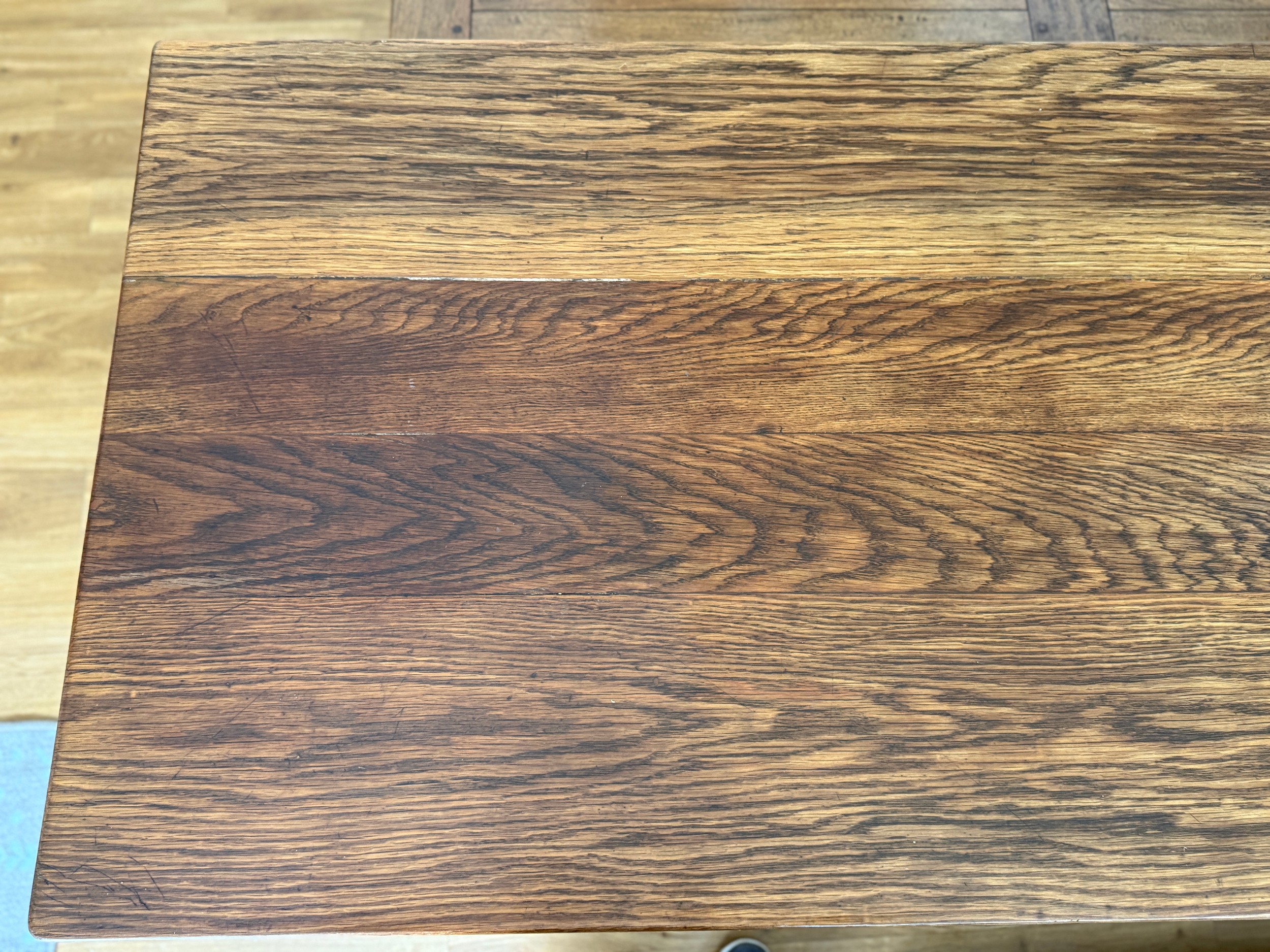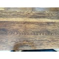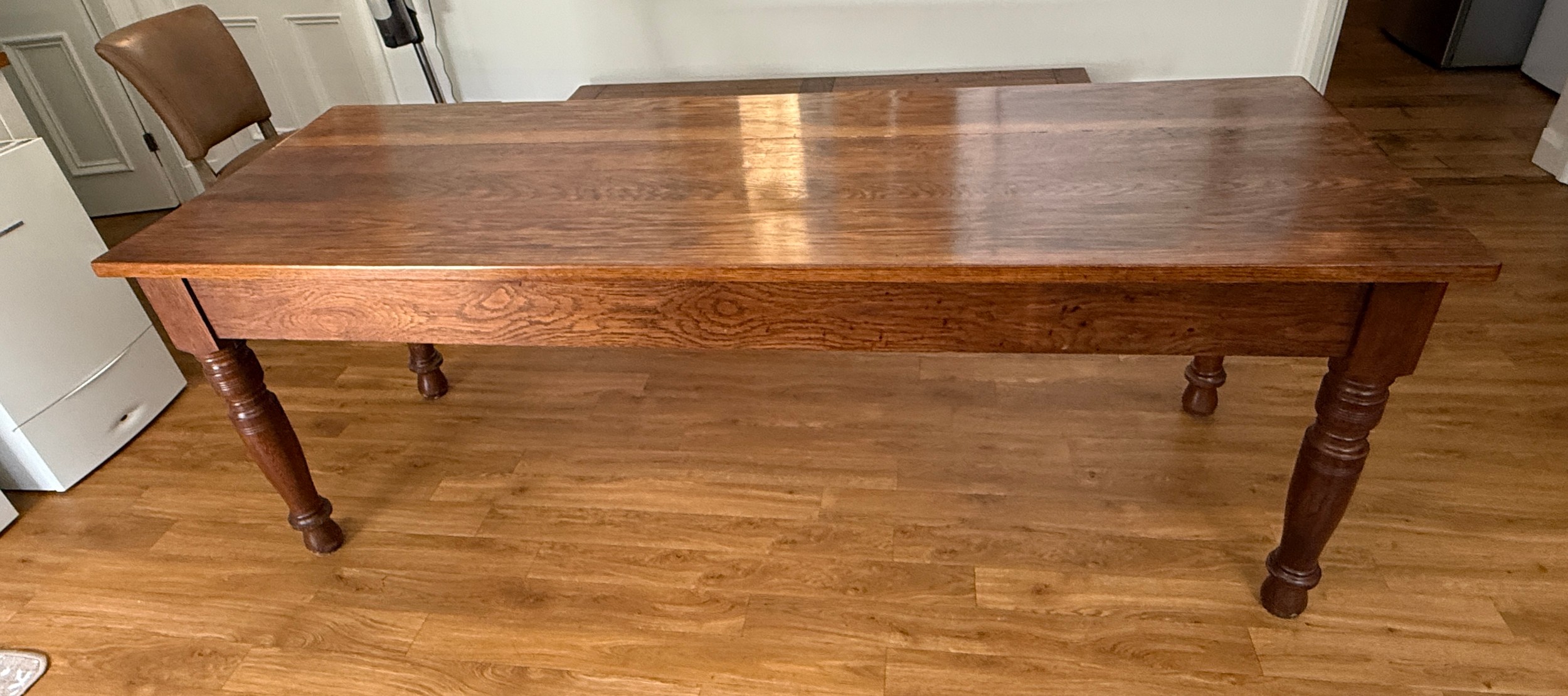 An oak farmhouse kitchen table. 214 l x 75 w x 77.5cm h.