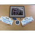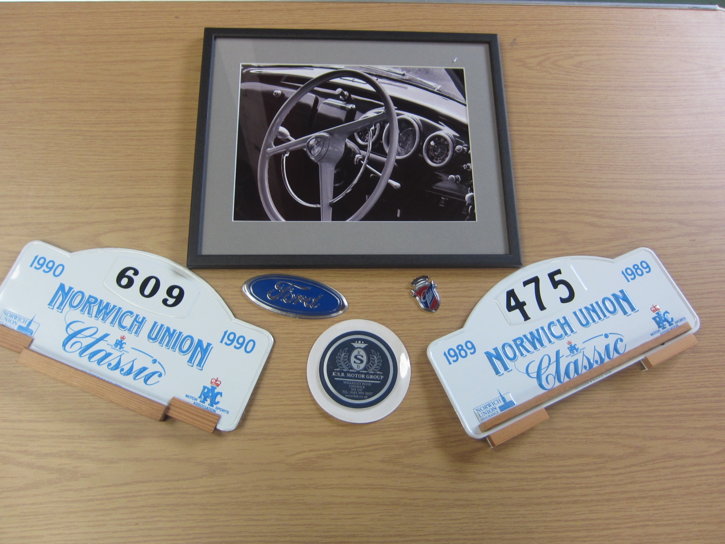 A quantity of information cards covering various Marques, a tax disc holder, a Ford Ghia badge and a Ford badge, Two Norwich Union Classics plates and a framed and glazed photograph of a Ford Anglia Dash