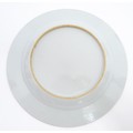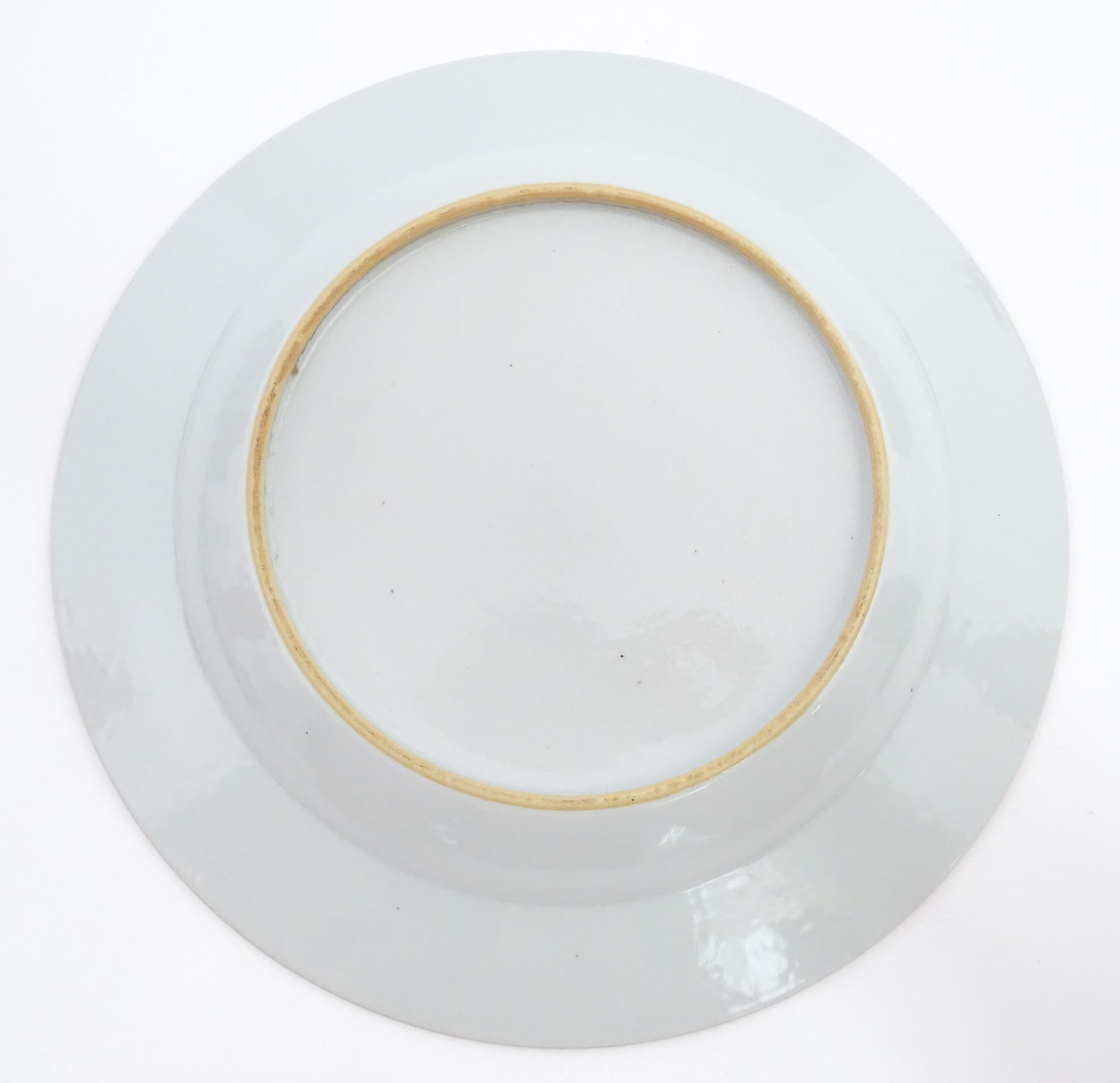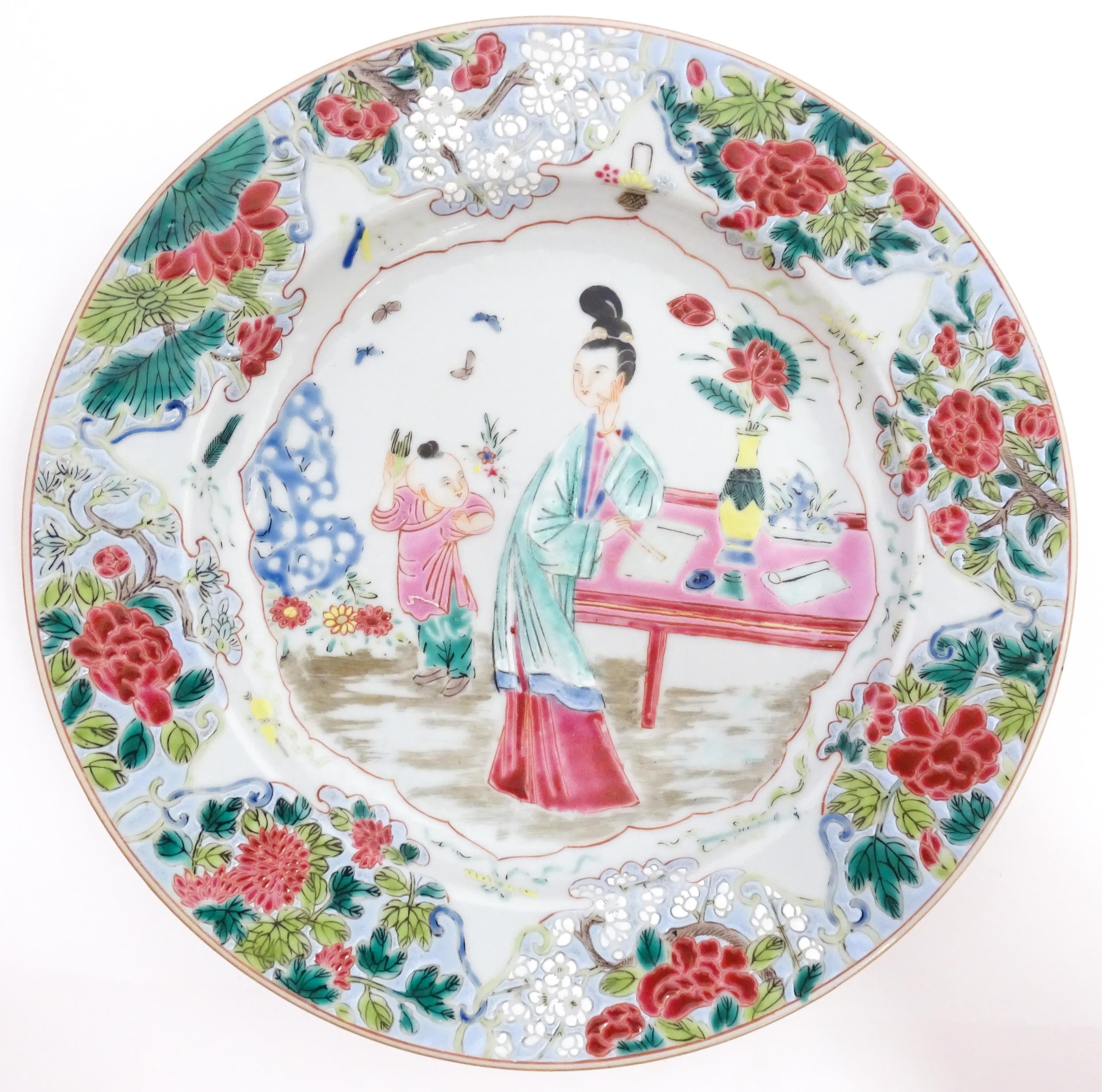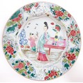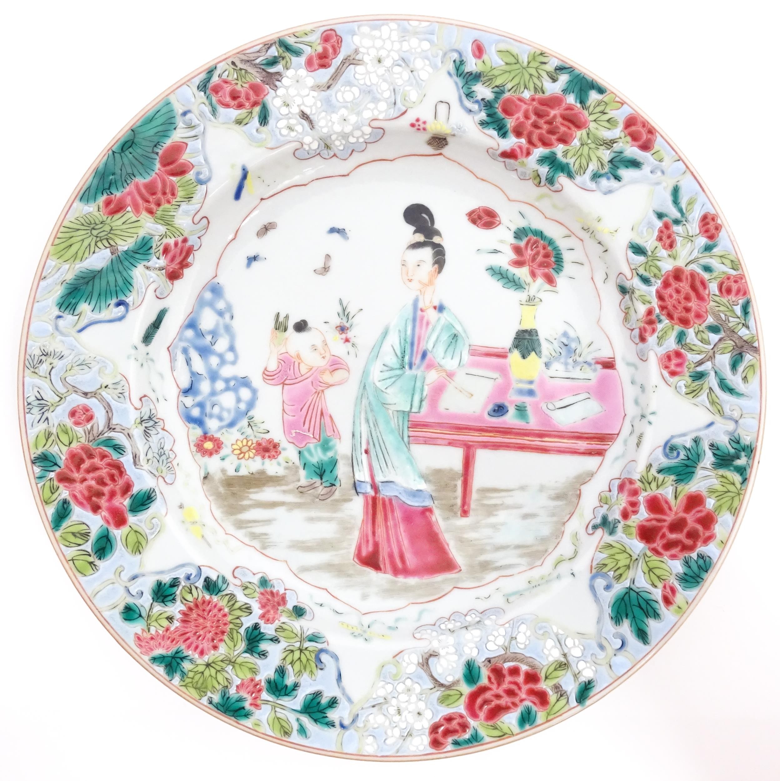 A Chinese famille rose plate decorated with figures by a table with a vase of flowers, having a floral and foliate border. Approx. 8 3/4" wide