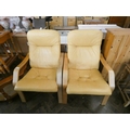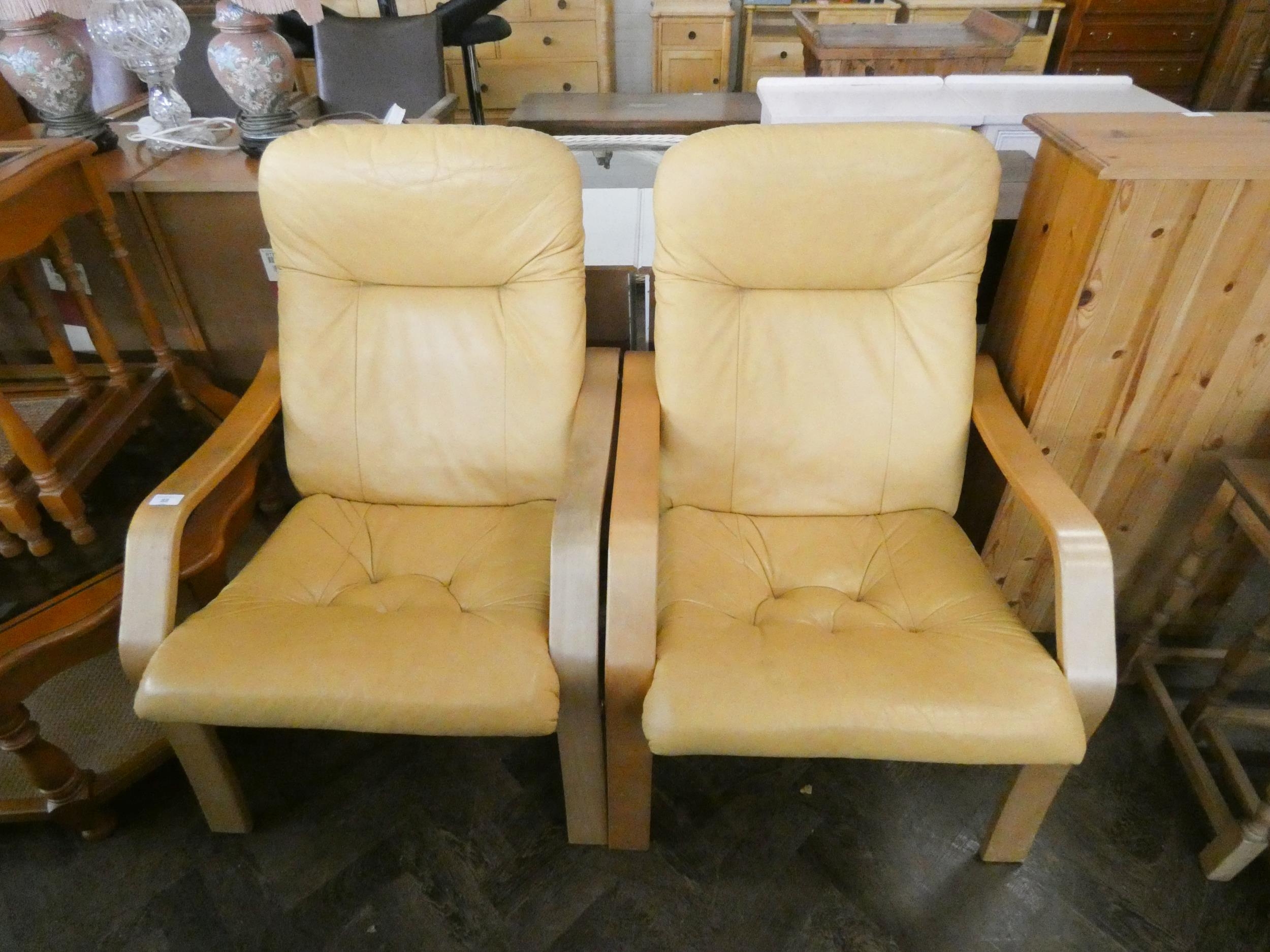 A pair of modern wood armed chairs with leather seats and backs