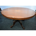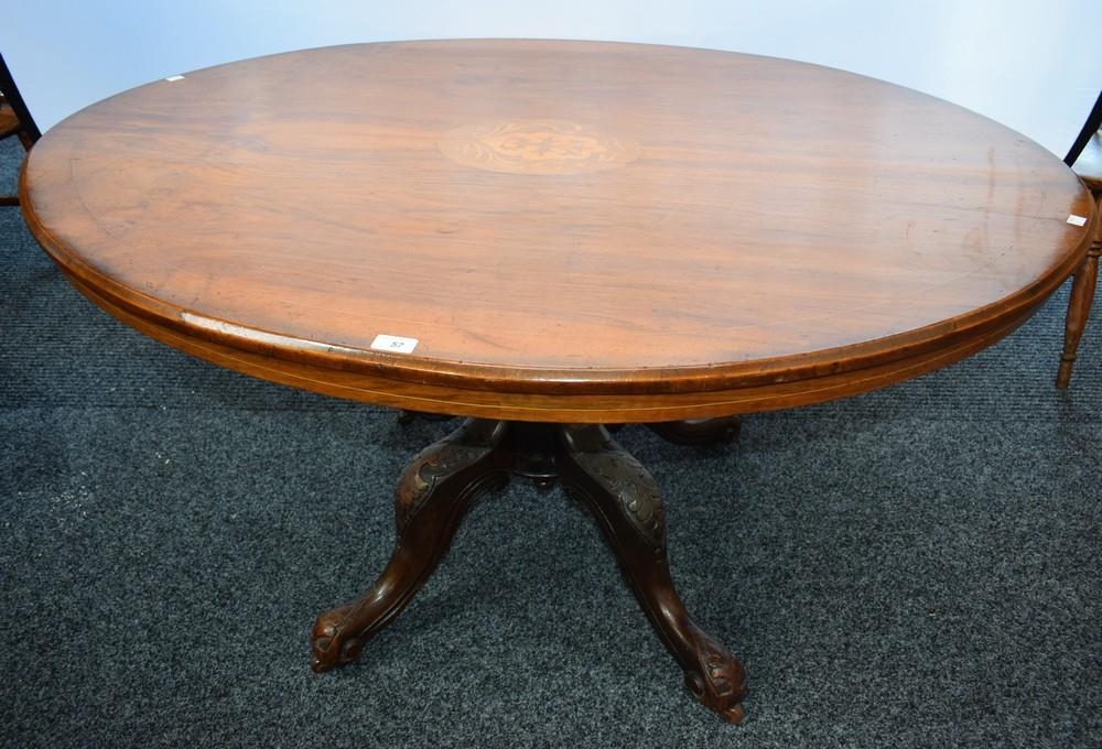 A Victorian mahogany breakfast table, elliptical top inlaid with stylised foliage, turned column, cabriole legs applied to the knees with acanthus, 134.5cm wide