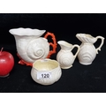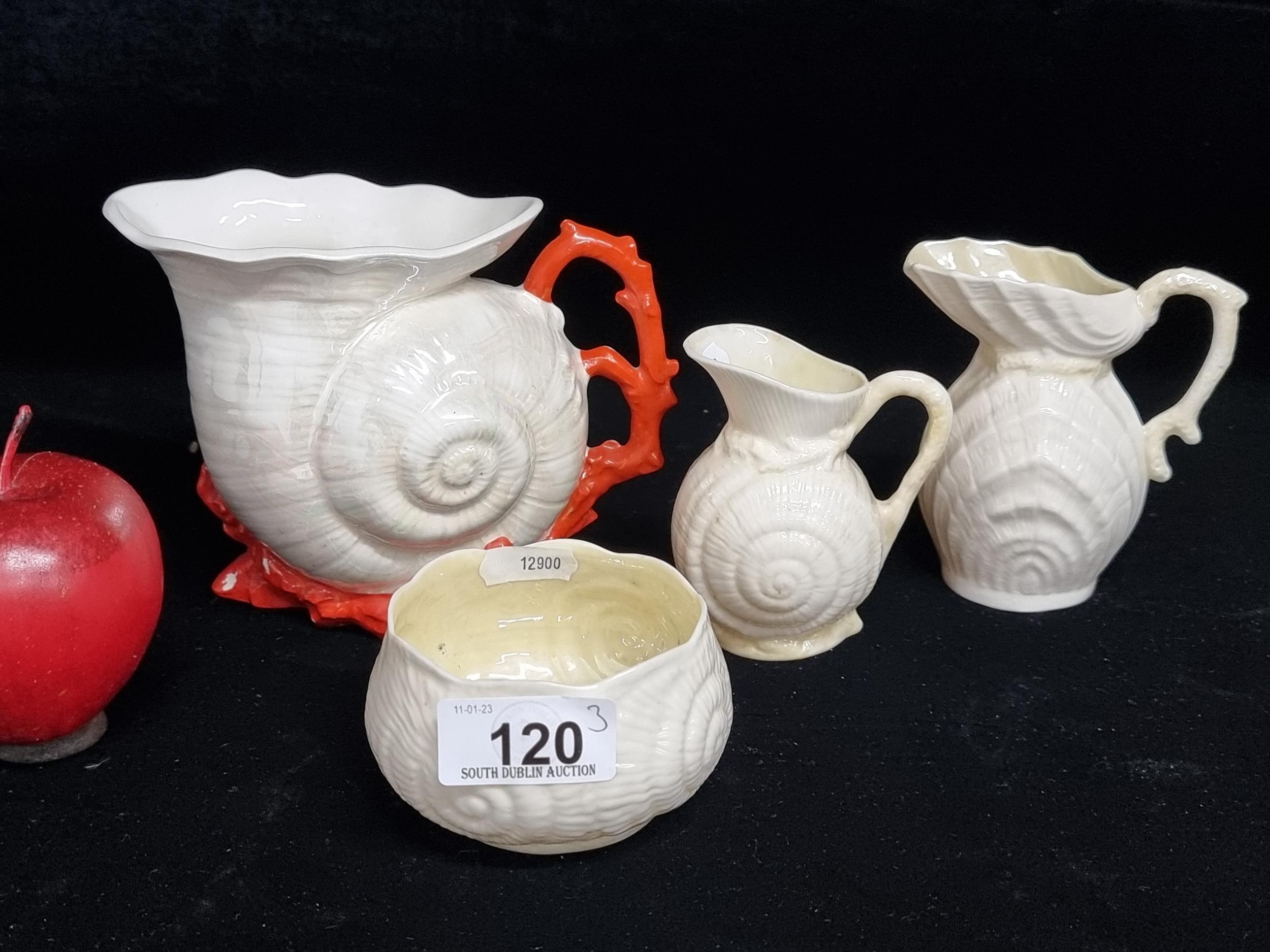 Four beautiful ceramic ornamental pieces including three Belleek porcelain examples including two creamers and a sugar bowl featuring shell design dated to c. 1960s. Along with a large jug in the form of a conch shell with a lovely luster finish and with a handle in the form of a coral. All in very good condition.