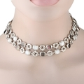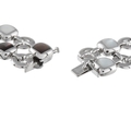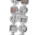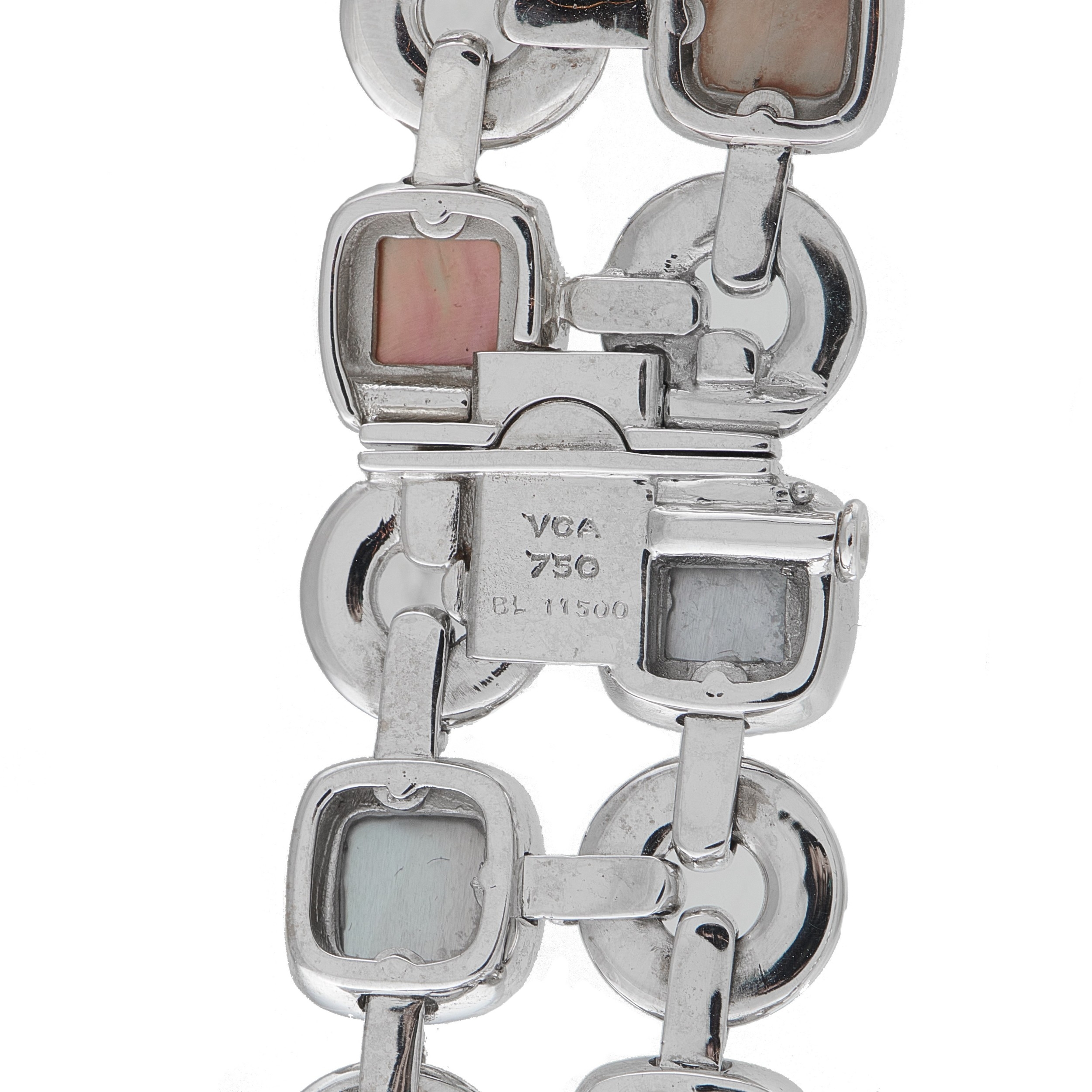 A Van Cleef & Arpels 18K White Gold Mother of Pearl Necklace. Circular links crafted from 18K White Gold are perfectly paired with square inset Mother of Pearl stones in an array of neutral colors. Measures 13.5 long and includes secure tab insert closure. In very good condition and includes a gift box. Total weight: 176.0 grams.*This item is held at Cadmore USA Office in Pennsylvania, USA and will be shipped from there. Buyers will be responsible for direct shipping payments.*