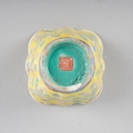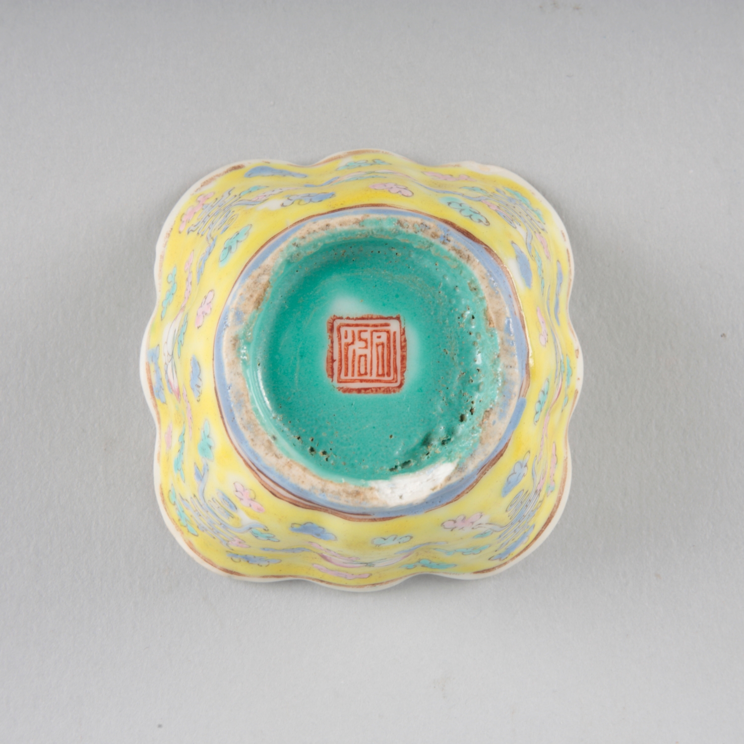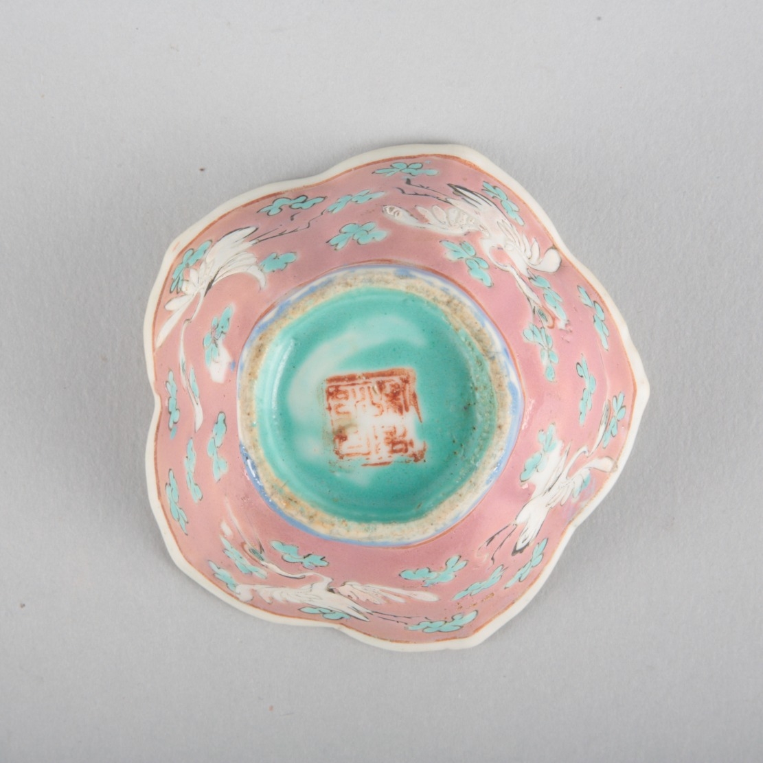 both with seal marks to the base, 19th century, one decorated with pomegranates against a yellow ground, 4cm high; the other with cranes against a pink ground, 4cm high (2)