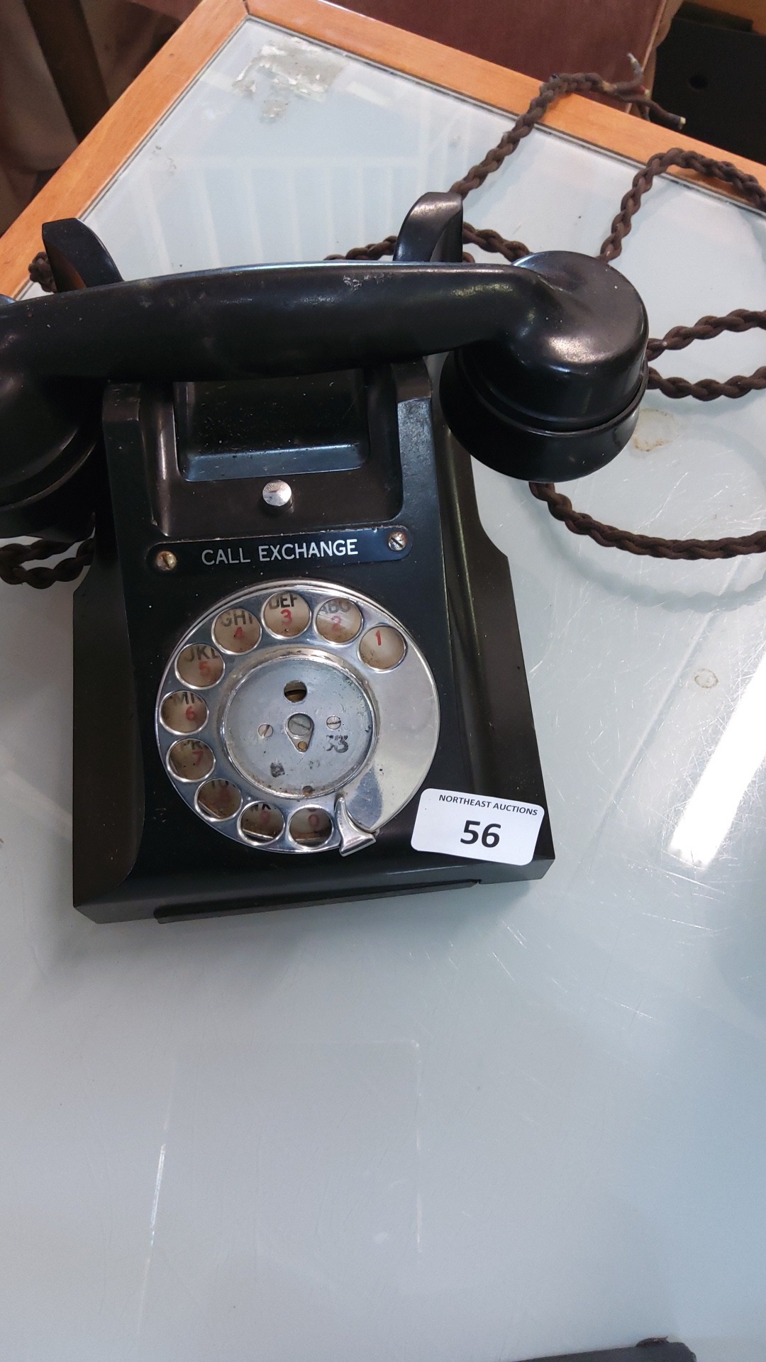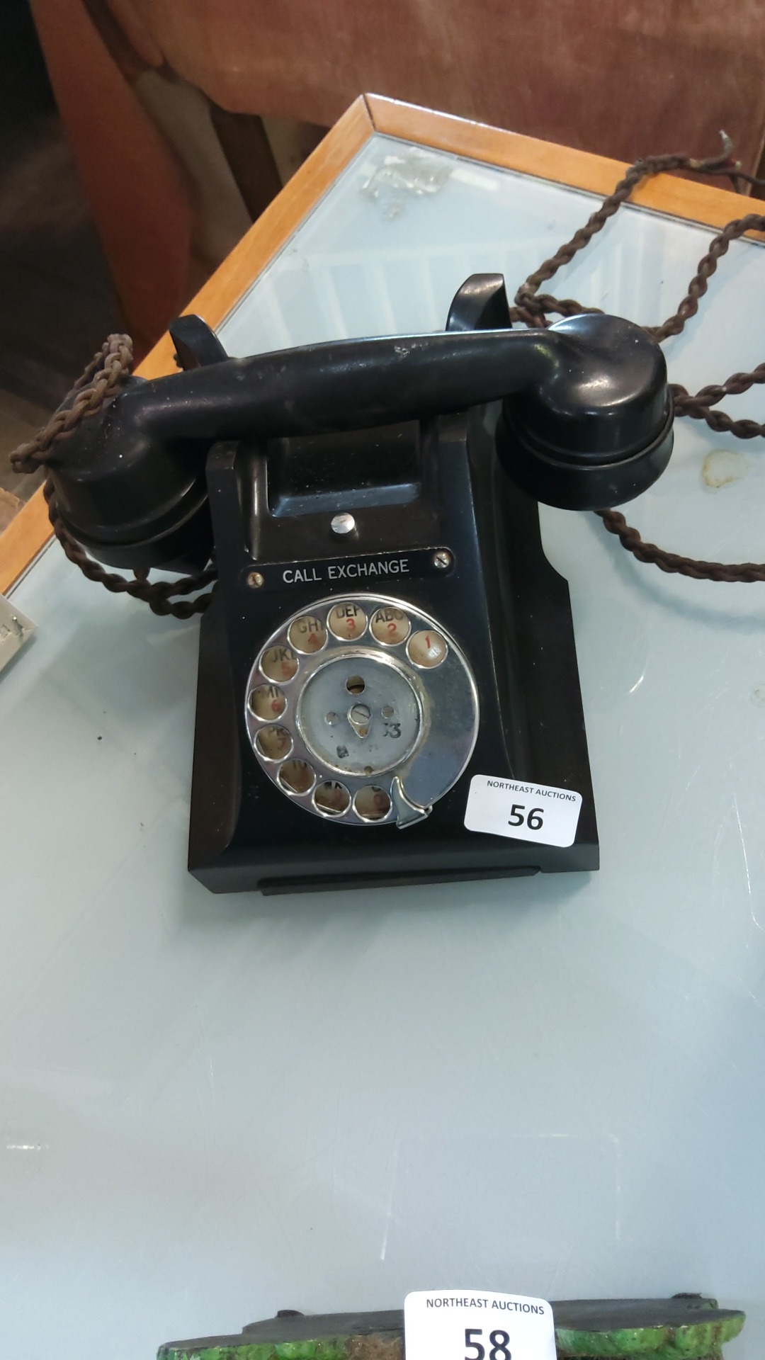 Bakelite rotary dial telephone, model 232-style, with “CALL EXCHANGE” label, braided cloth handset cord and alpha-numeric dial, British GPO style, mid-20th century.