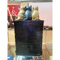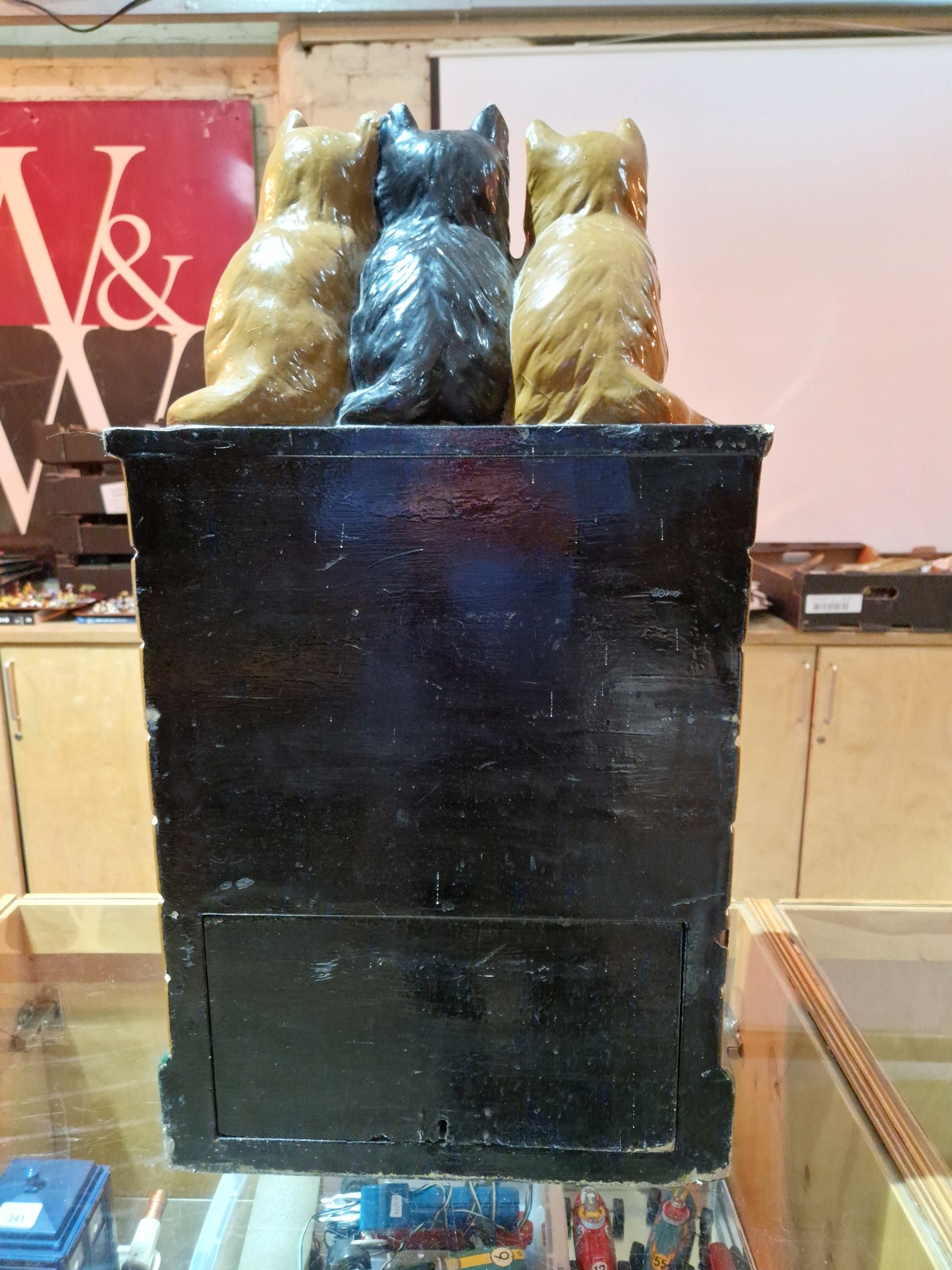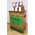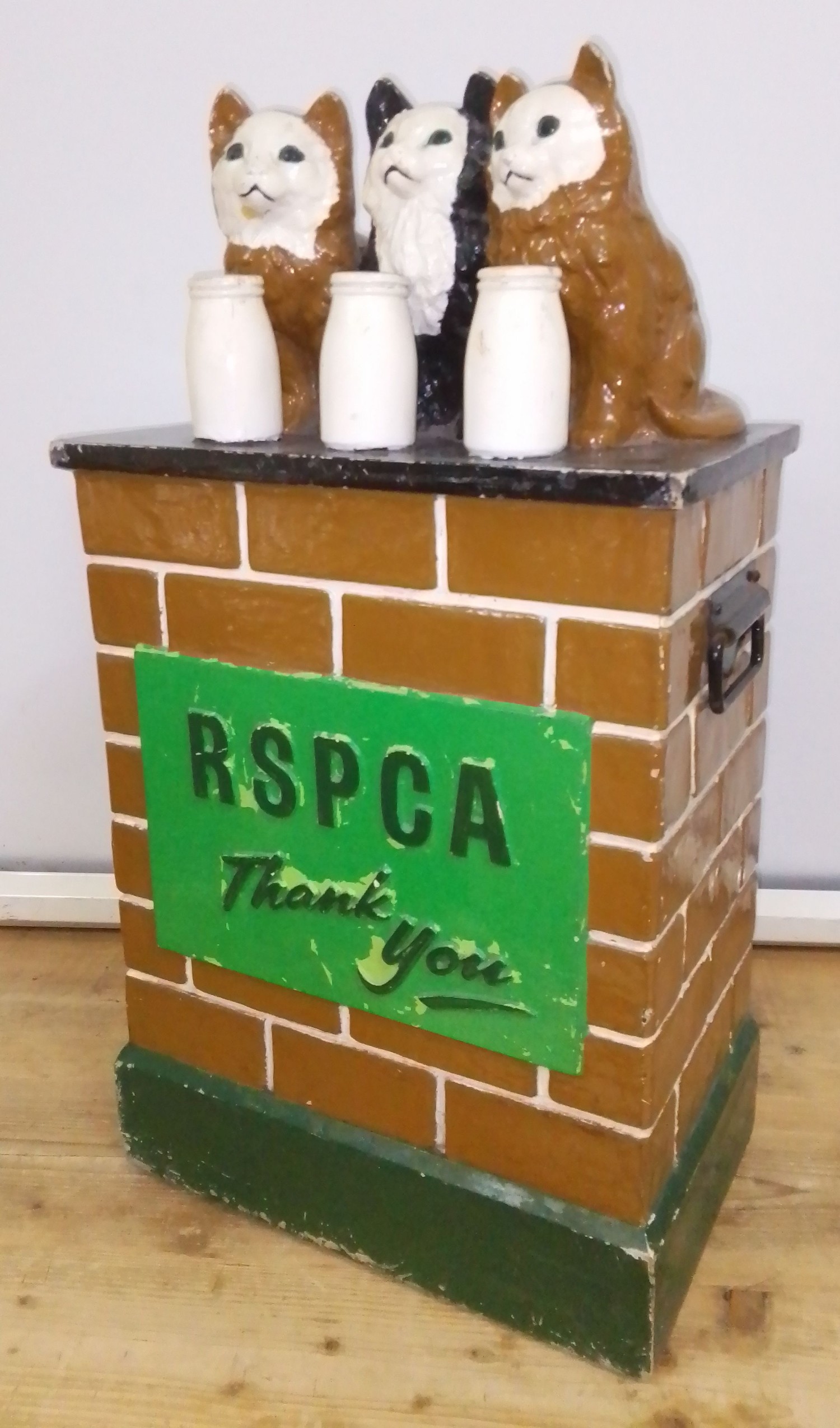 An RSPCA collection box modelled as three cats, each for a milk bottle and sat on a wall, height 74cm.