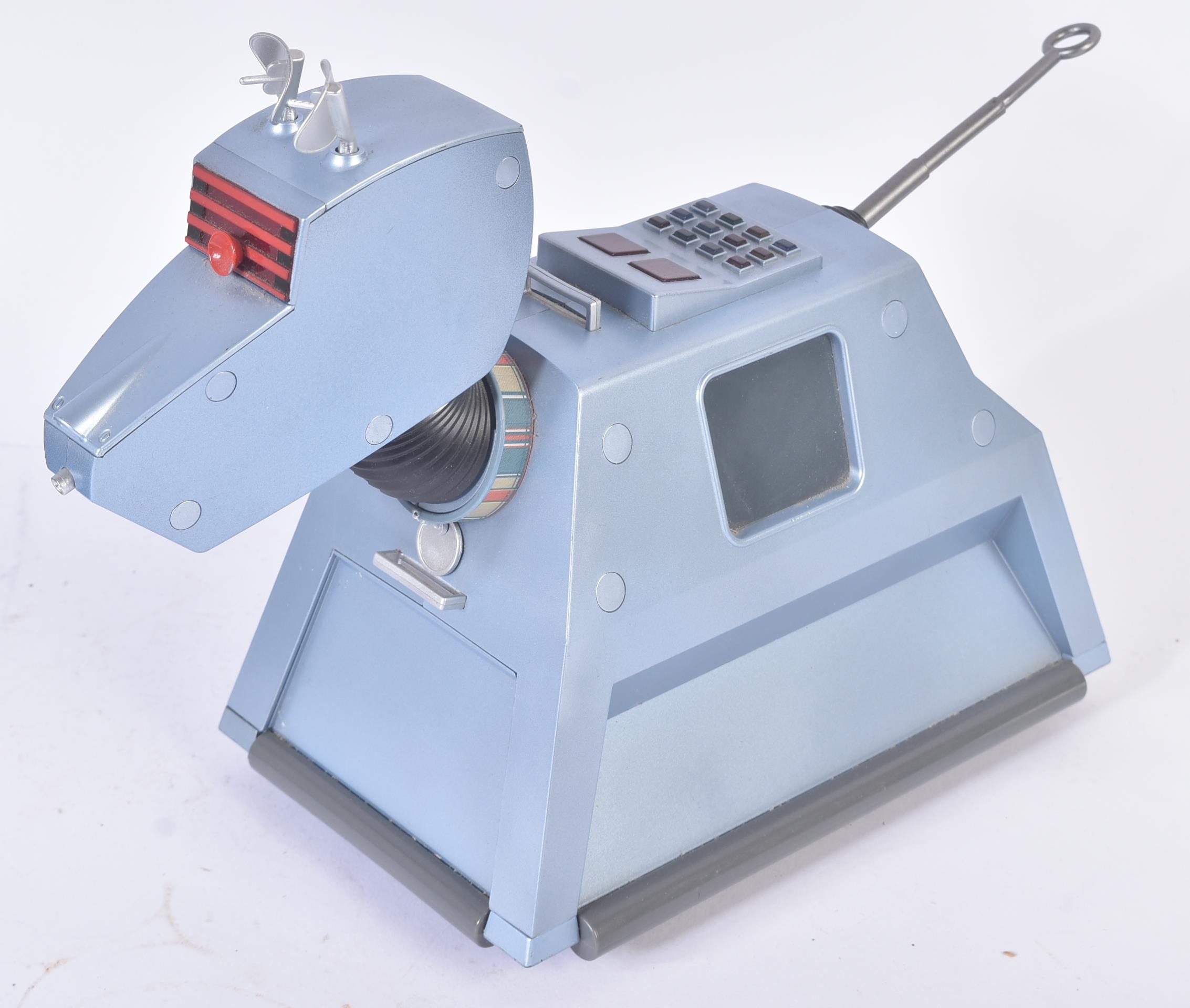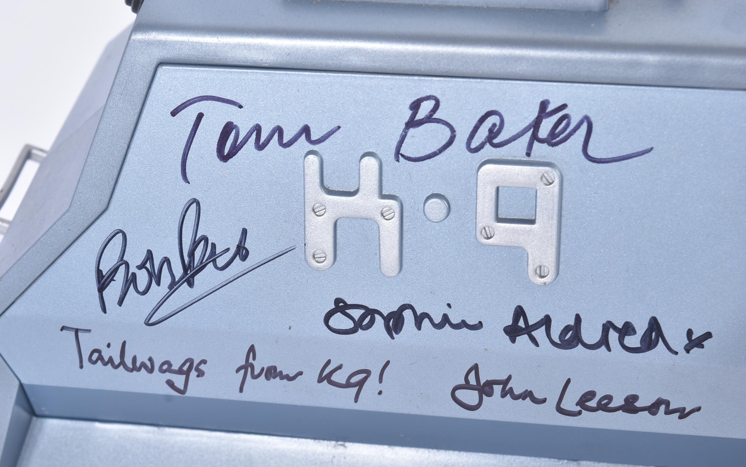 Doctor Who - Tom Baker (Fourth Doctor), John Leeson (Voice Of K9) ,Bob Baker (D.2021 - K9 Creator) & Sophie Aldred (Ace) - a large 1/4 scale model of K9 from Dr Who. Autographed to the side by all four in black ink, Leeson adding the character name and catchphrase. Signed to the removable side panel. Autographs obtained personally by the vendor. Fantastic display piece. Supplied with certificate of authenticity. Approx 14" long.