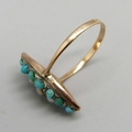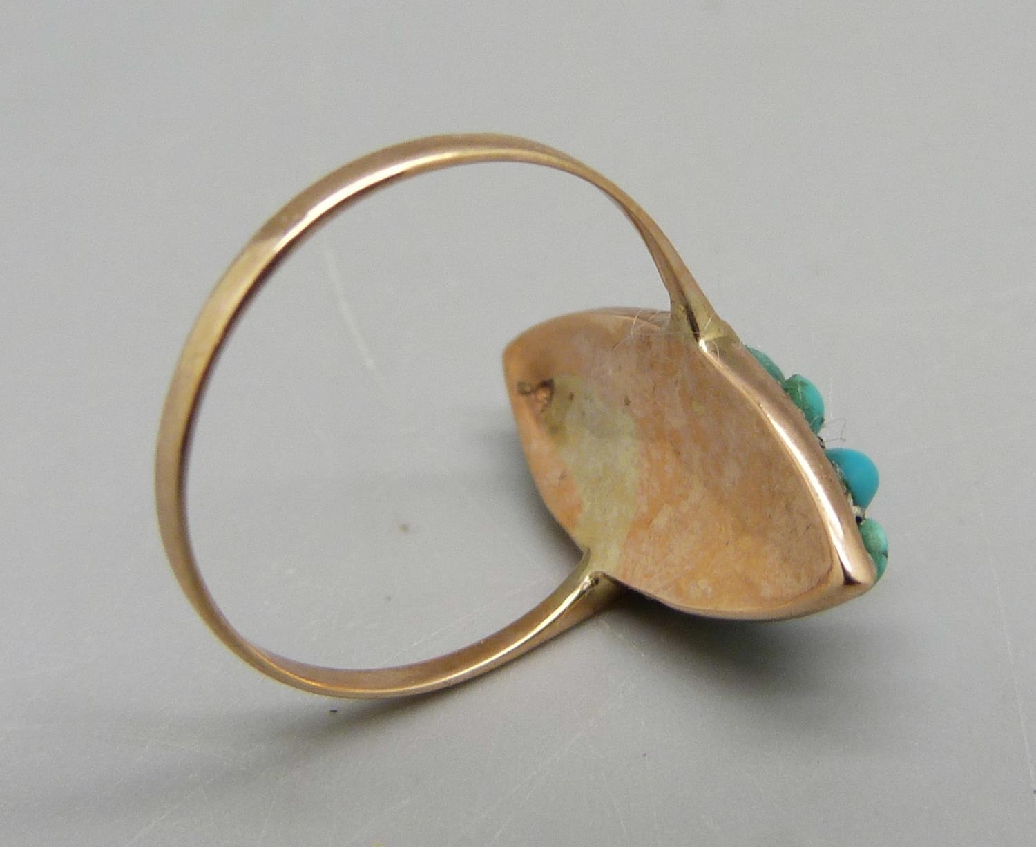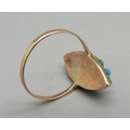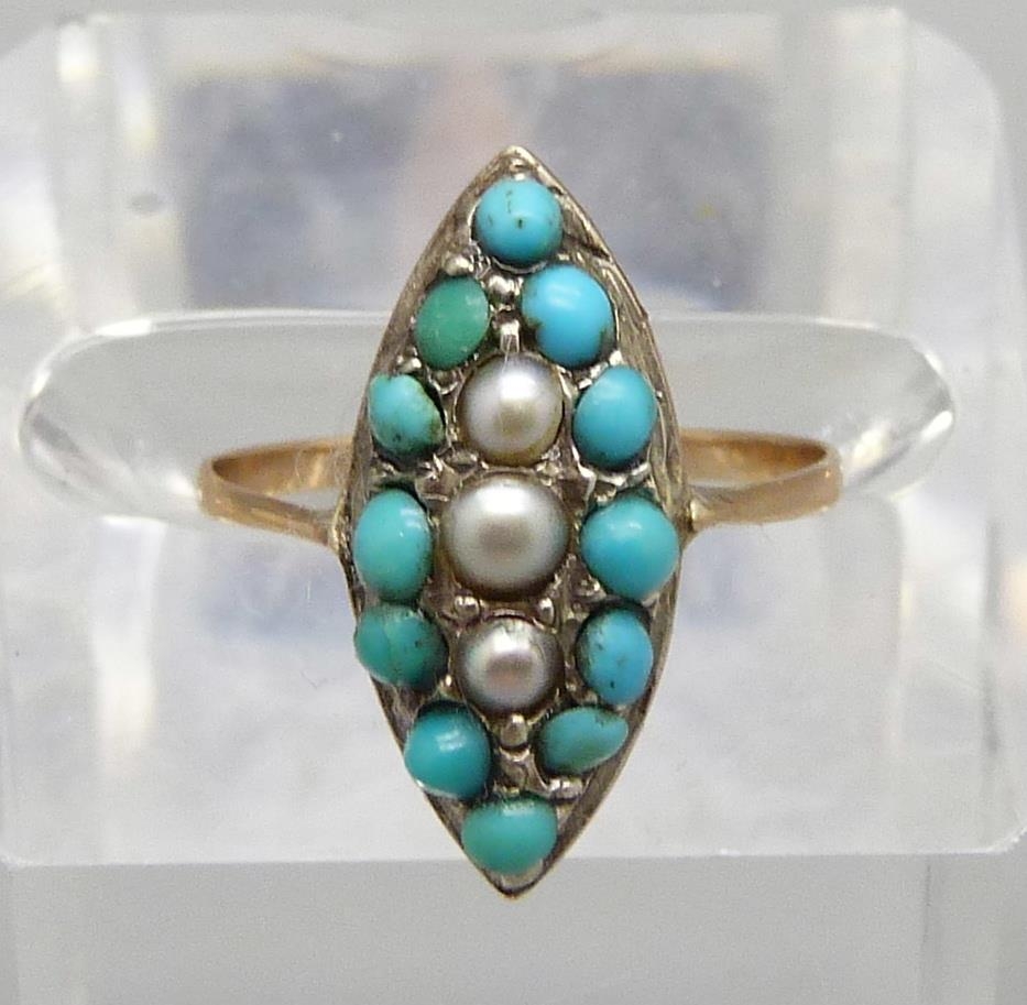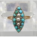 A Victorian turquoise and pearl marquise cluster ring, (gold shank, silver setting), 1.6g, L