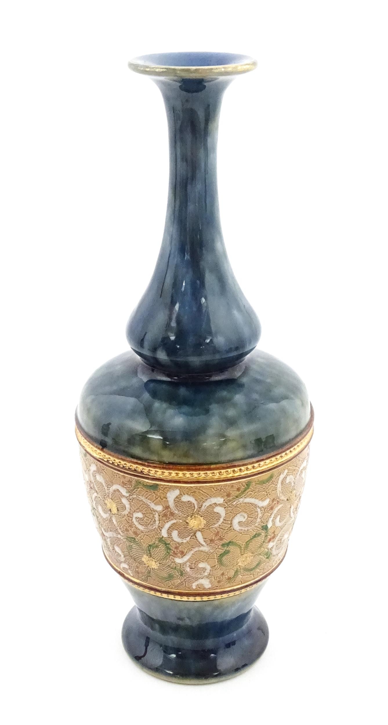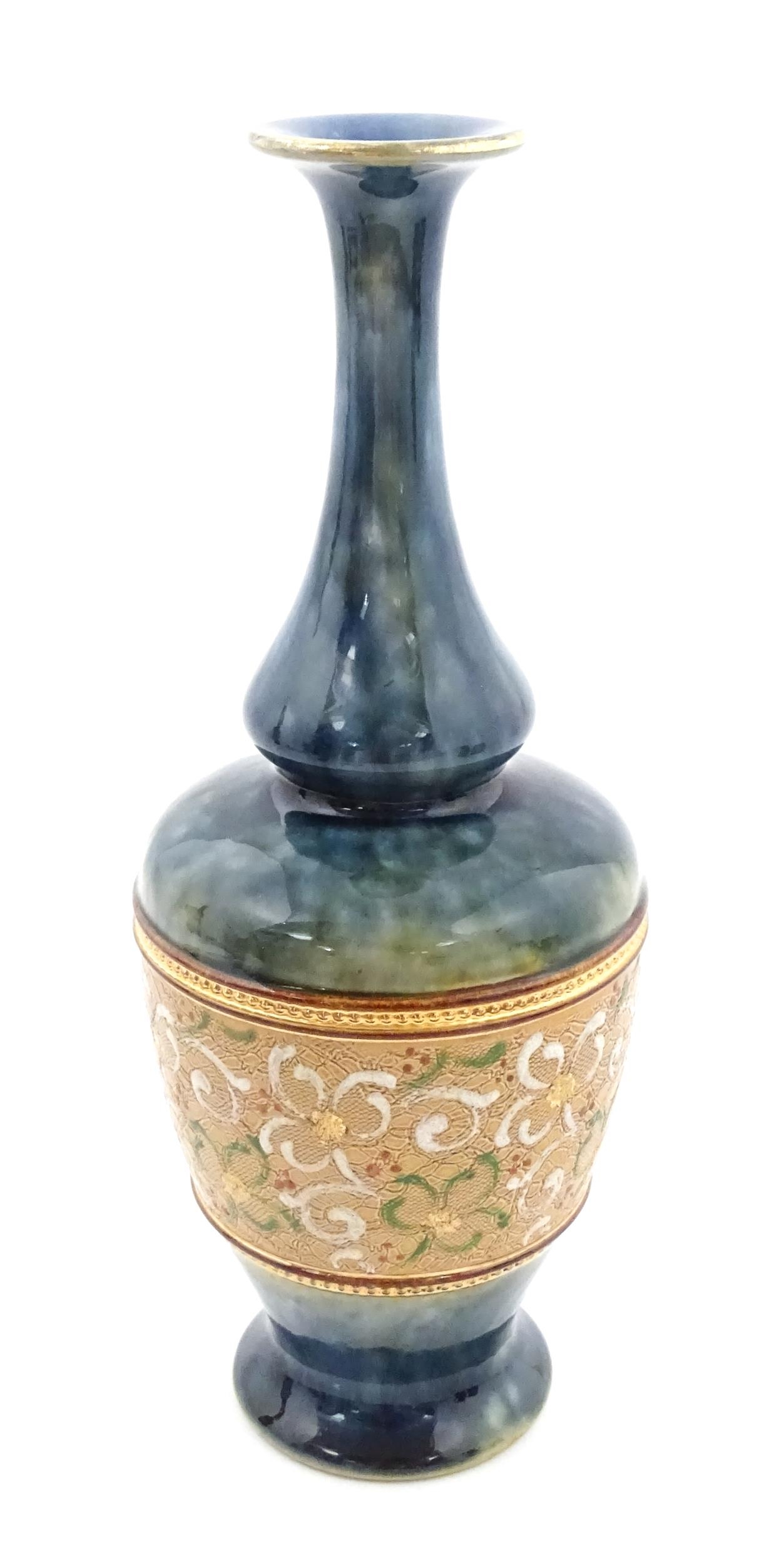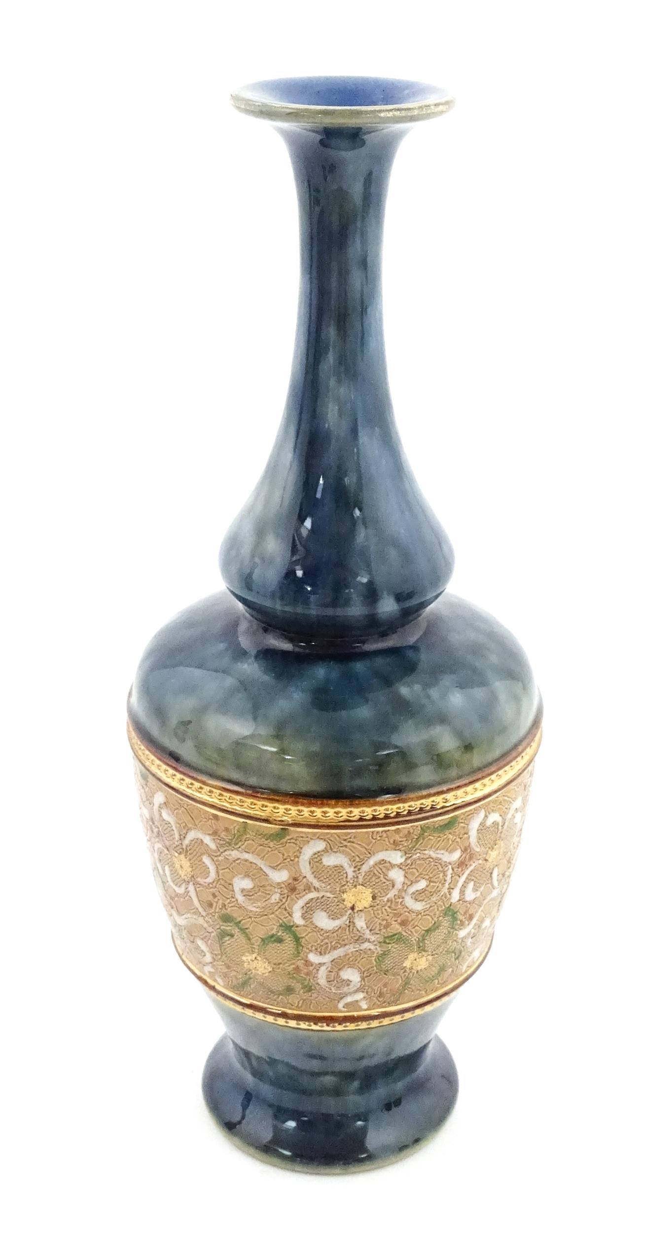 A Royal Doulton bottle vase the mottled blue glaze with banded floral and foliate decoration. Marked under, numbered 736 / 7827D and Doulton & Slater Patent. Approx. 9 3/4" high