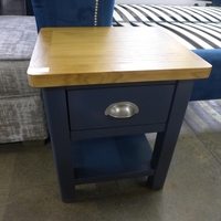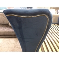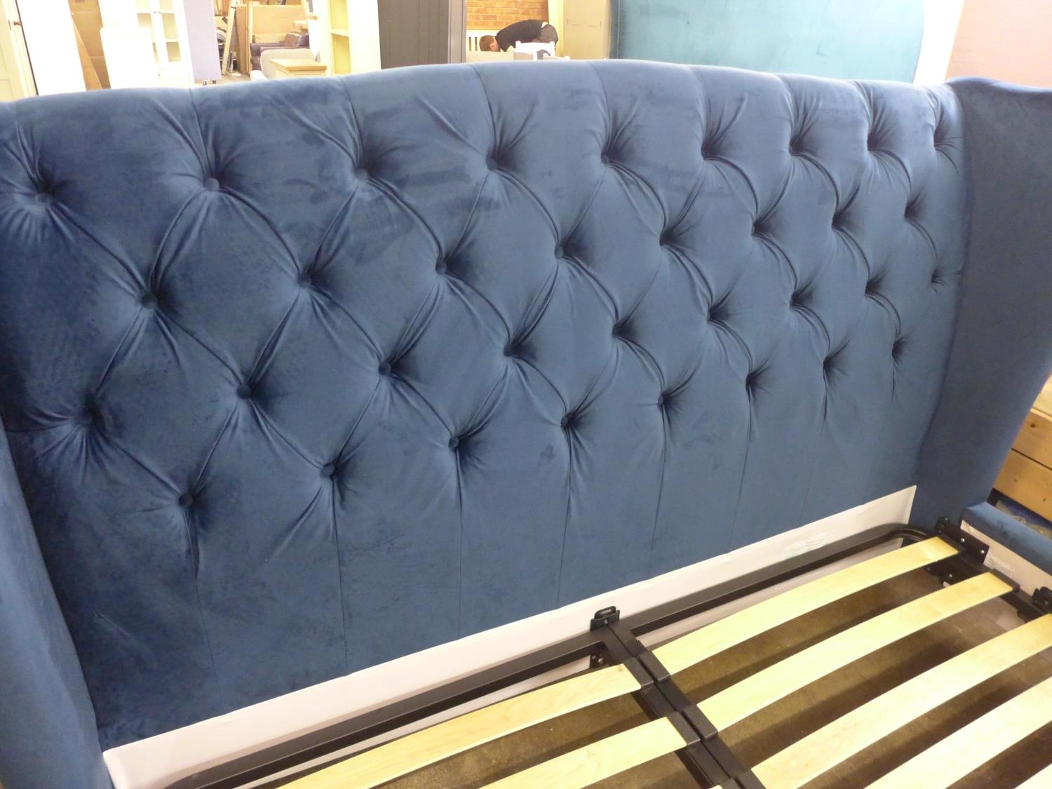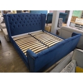 A superking blue velvet bedframe with buttoning and studwork