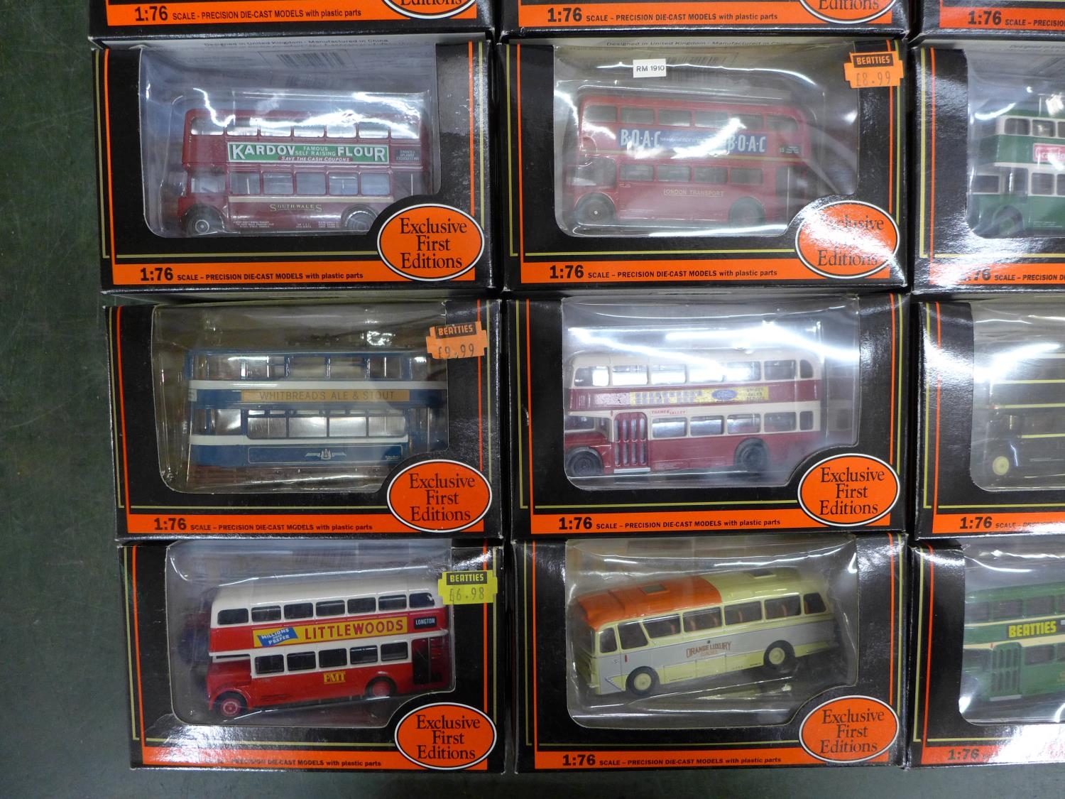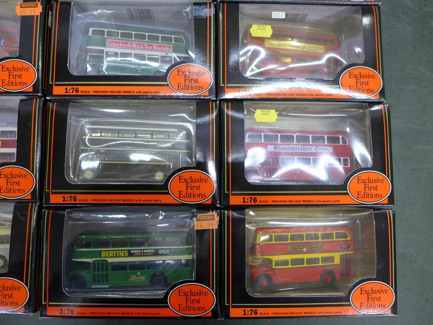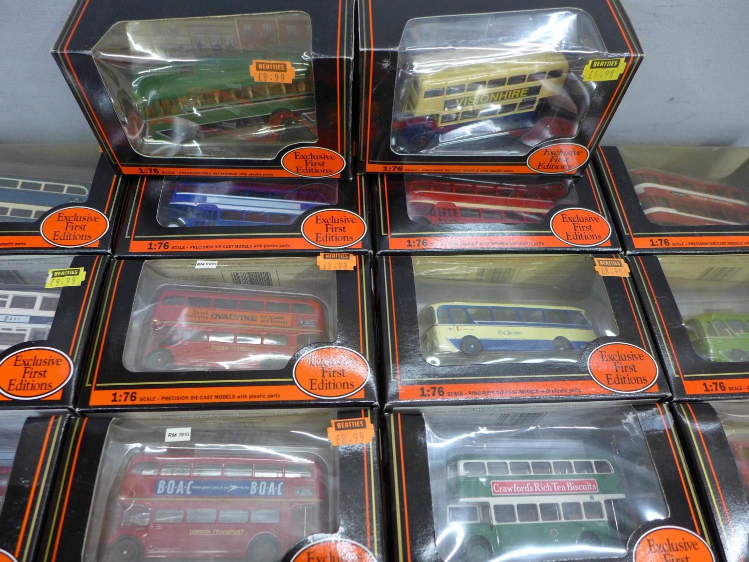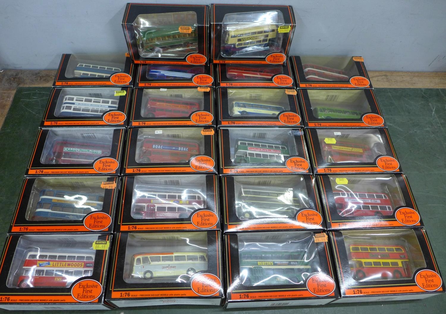 A box of twenty-two EFE die-cast model buses, boxed