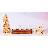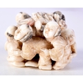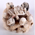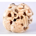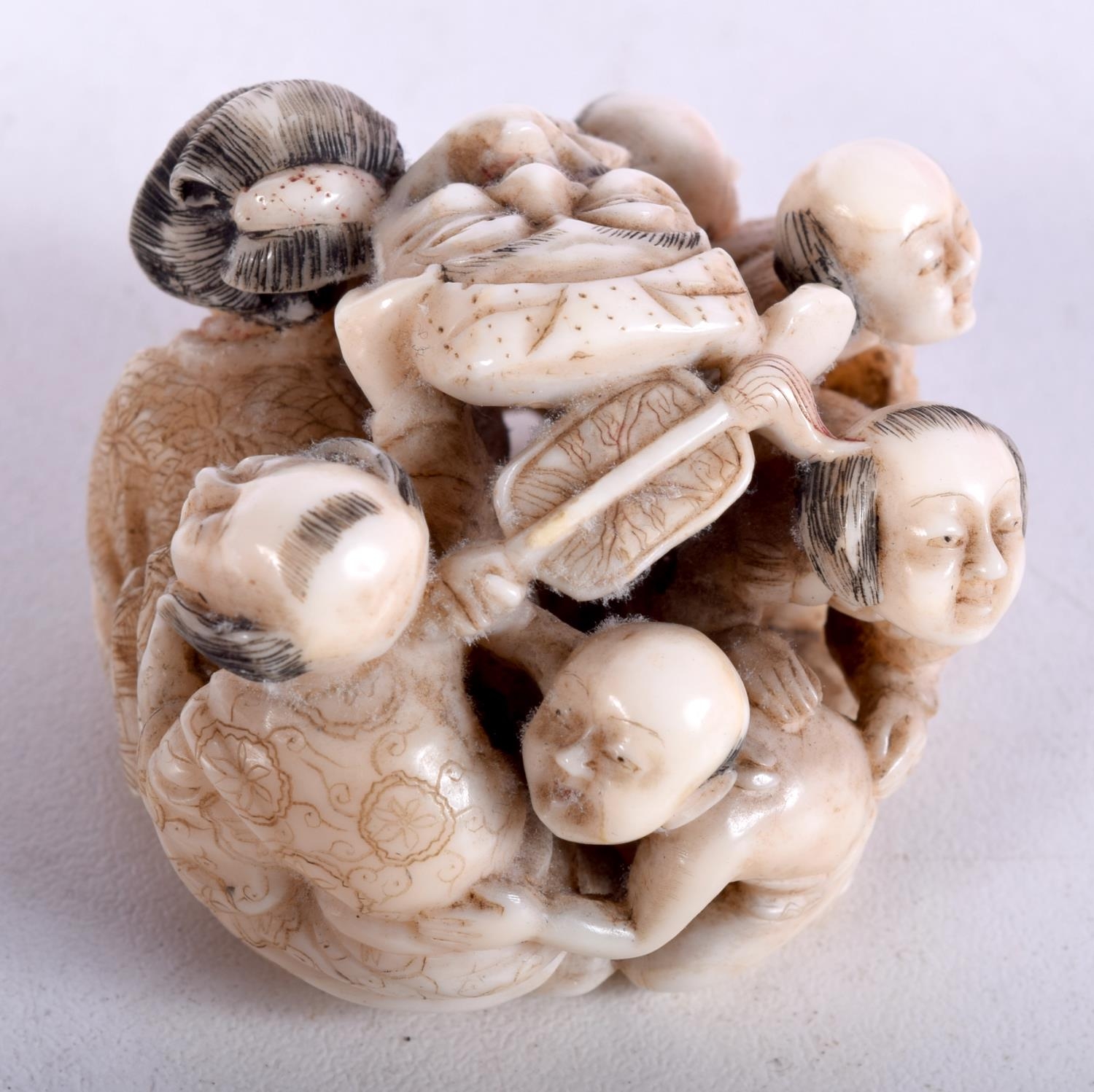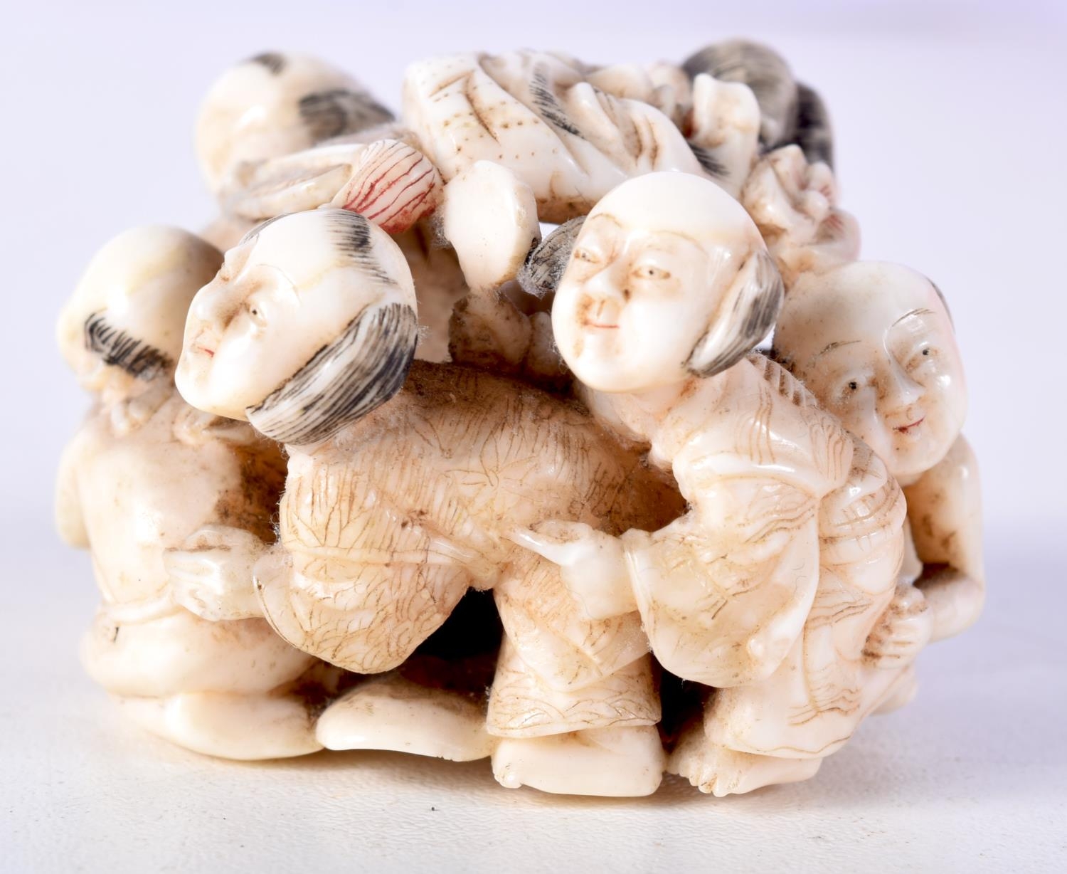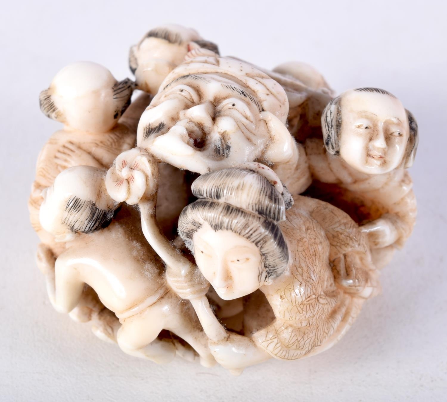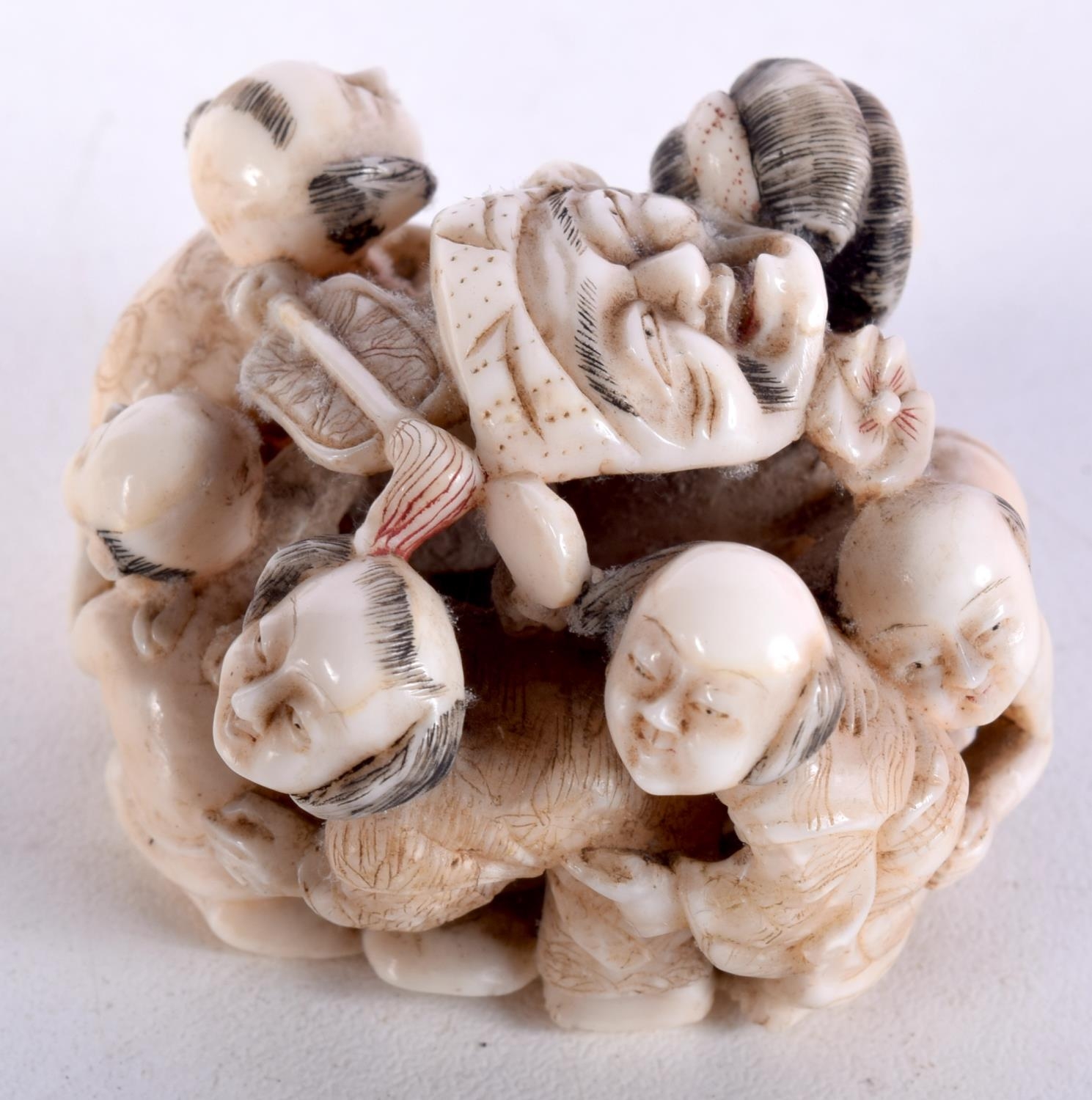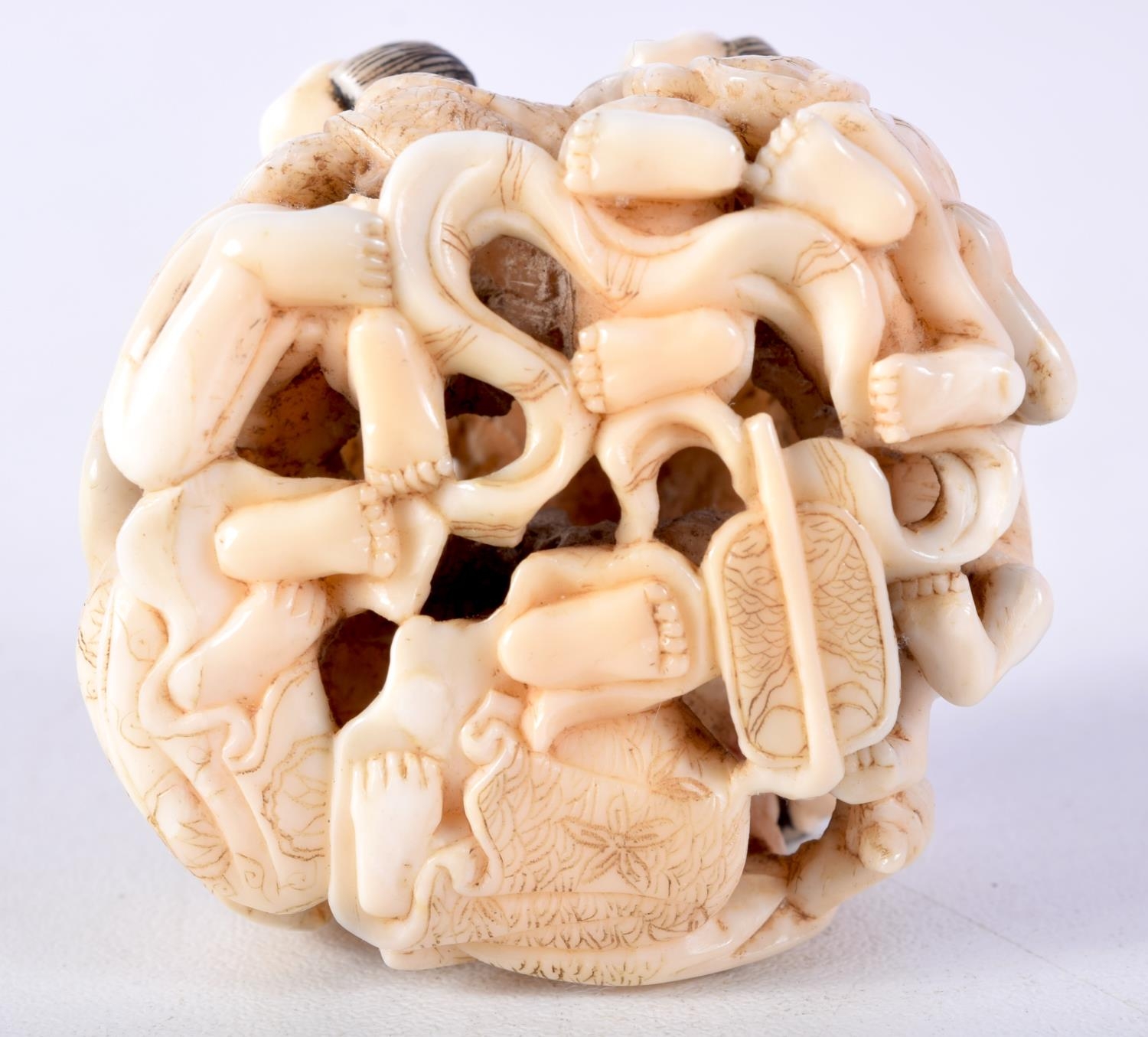 A 19TH CENTURY JAPANESE MEIJI PERIOD CARVED IVORY OKIMONO modelled as numerous figures holding masks. 4.5 cm x 4.5 cm.