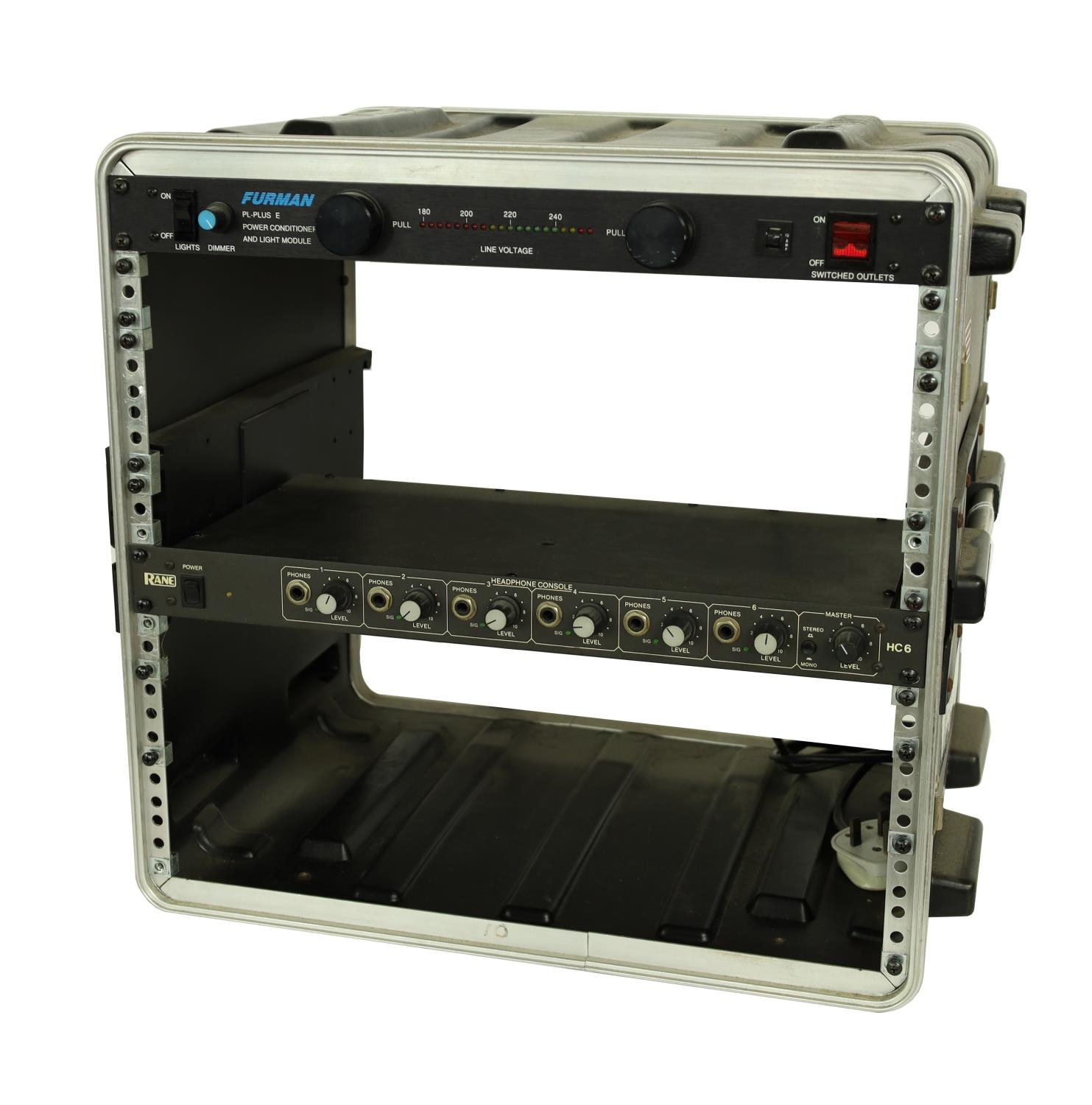 SKB flight case fitted with a Furman PL-Plus power conditioner and light module rack unit and a Rane HC6 headphone console rack unit