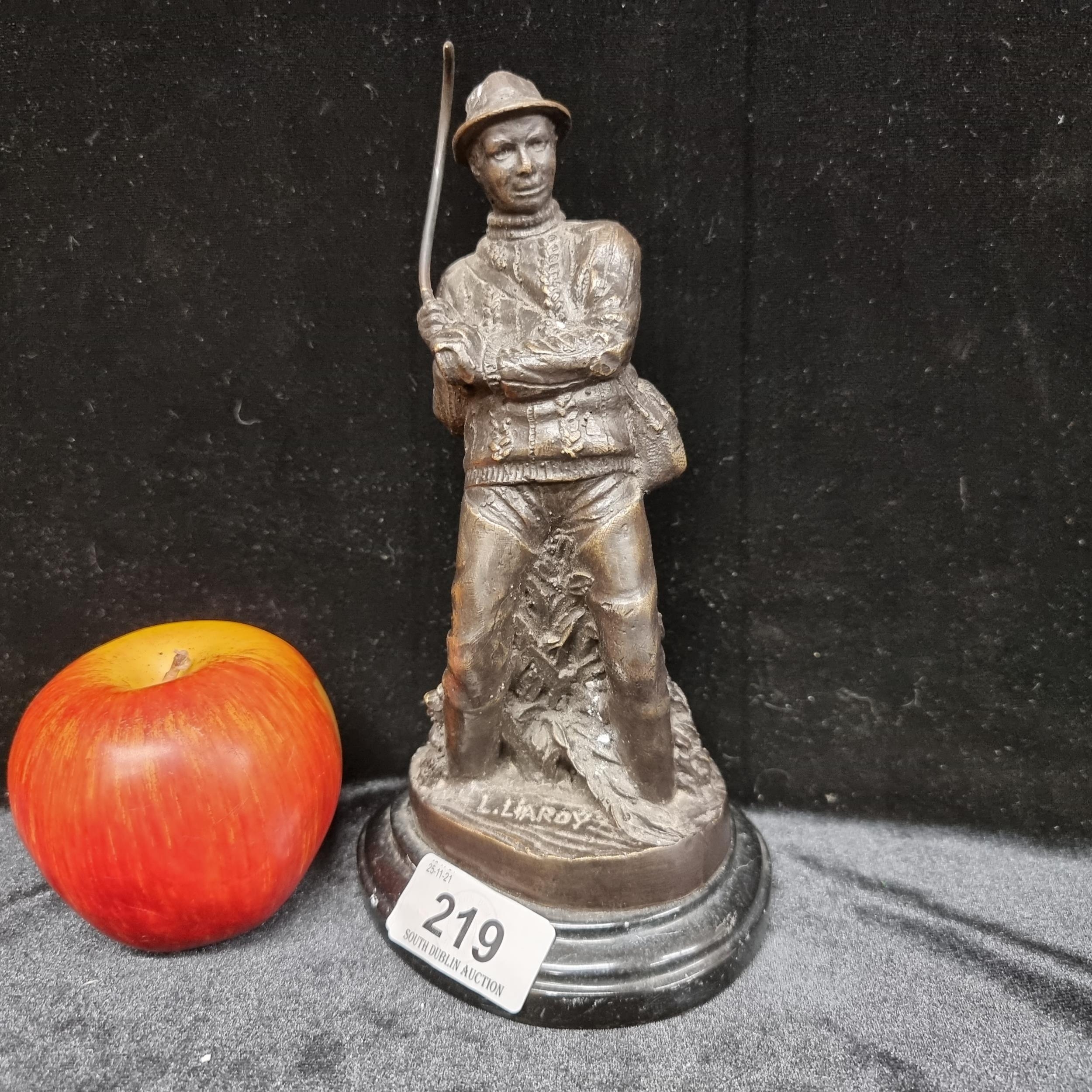 Star Lot : A bronze figure of a fisherman reeling in his line. With incredible detail to jumper and face. Mounted on a polished stone base. Signed by the artist L. Llardy