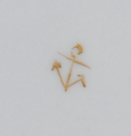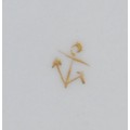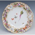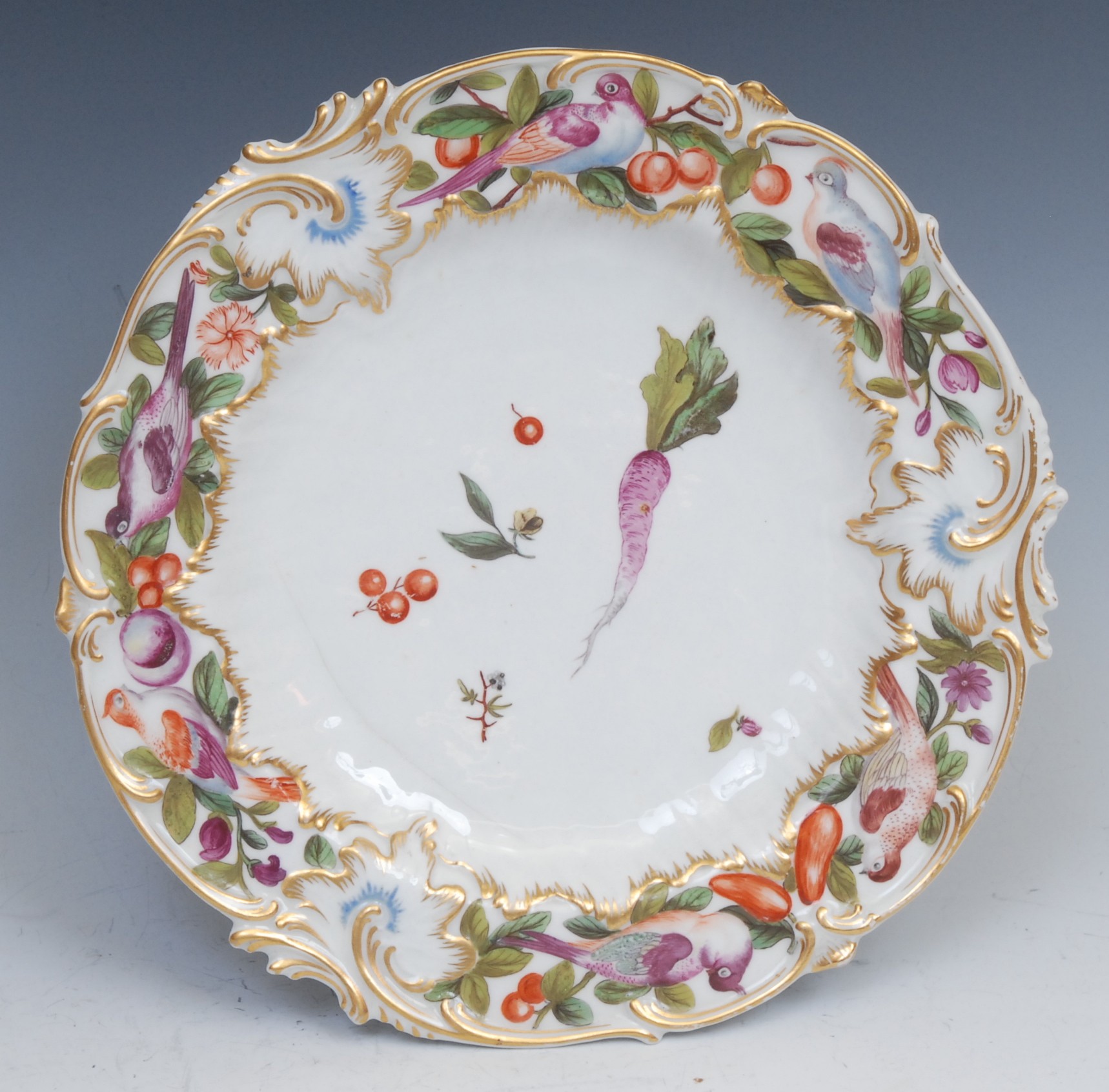 A shaped circular cabinet plate, painted with botanical and ornithological specimens, moulded and picked out in gilt, 22cm diam, Chelsea gold anchor mark