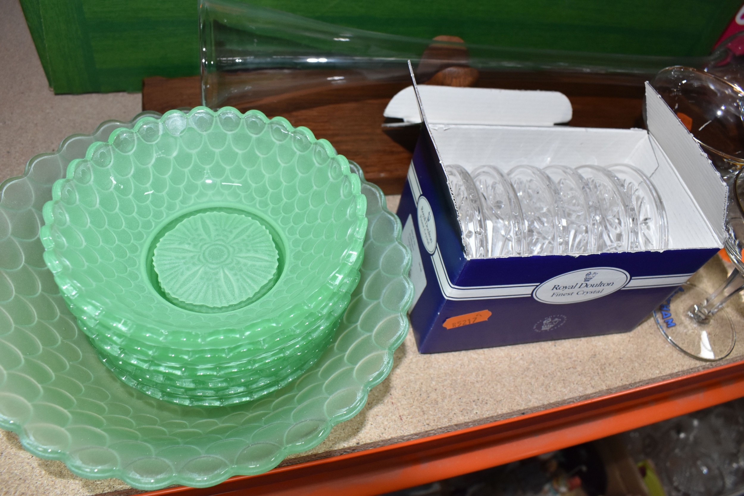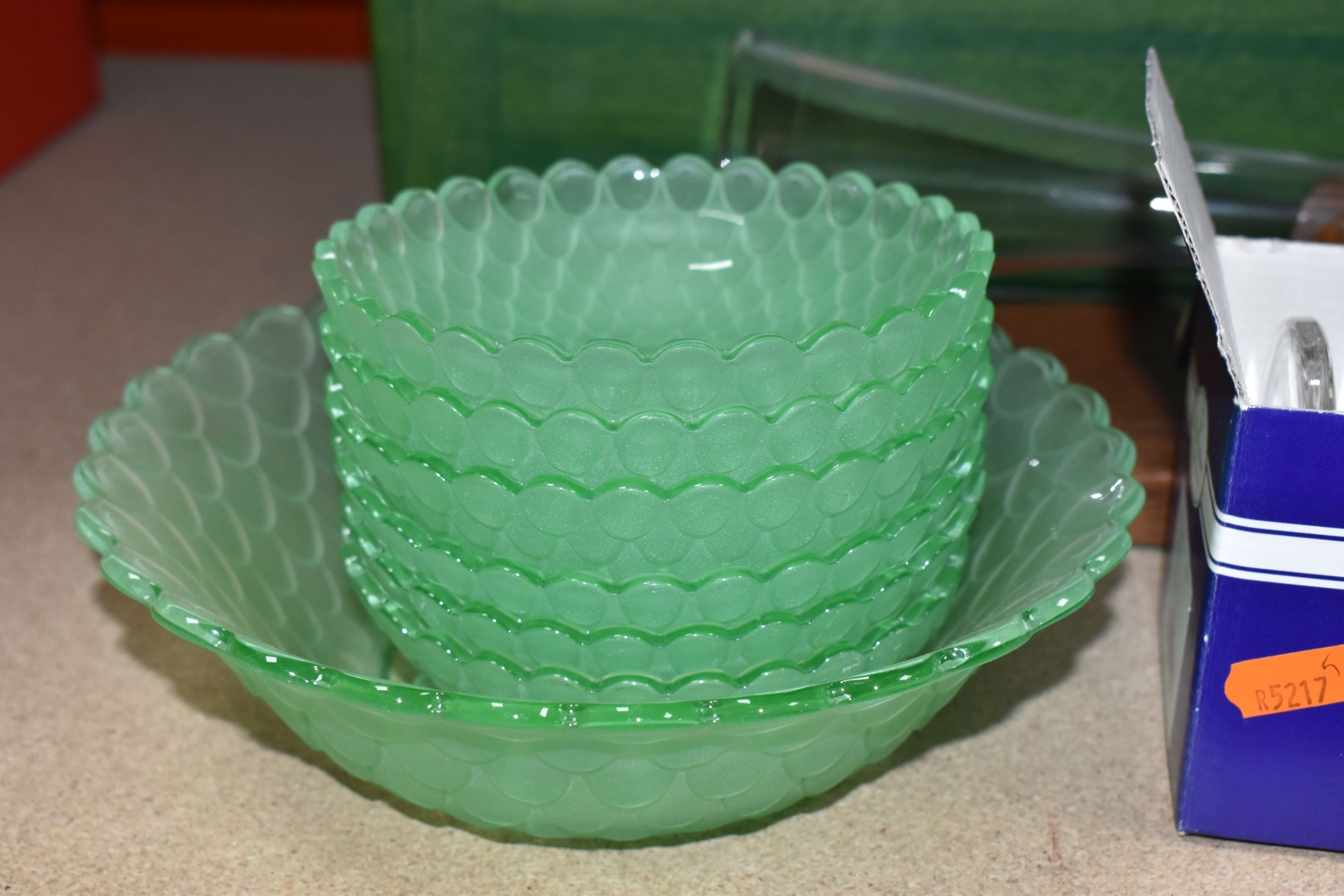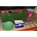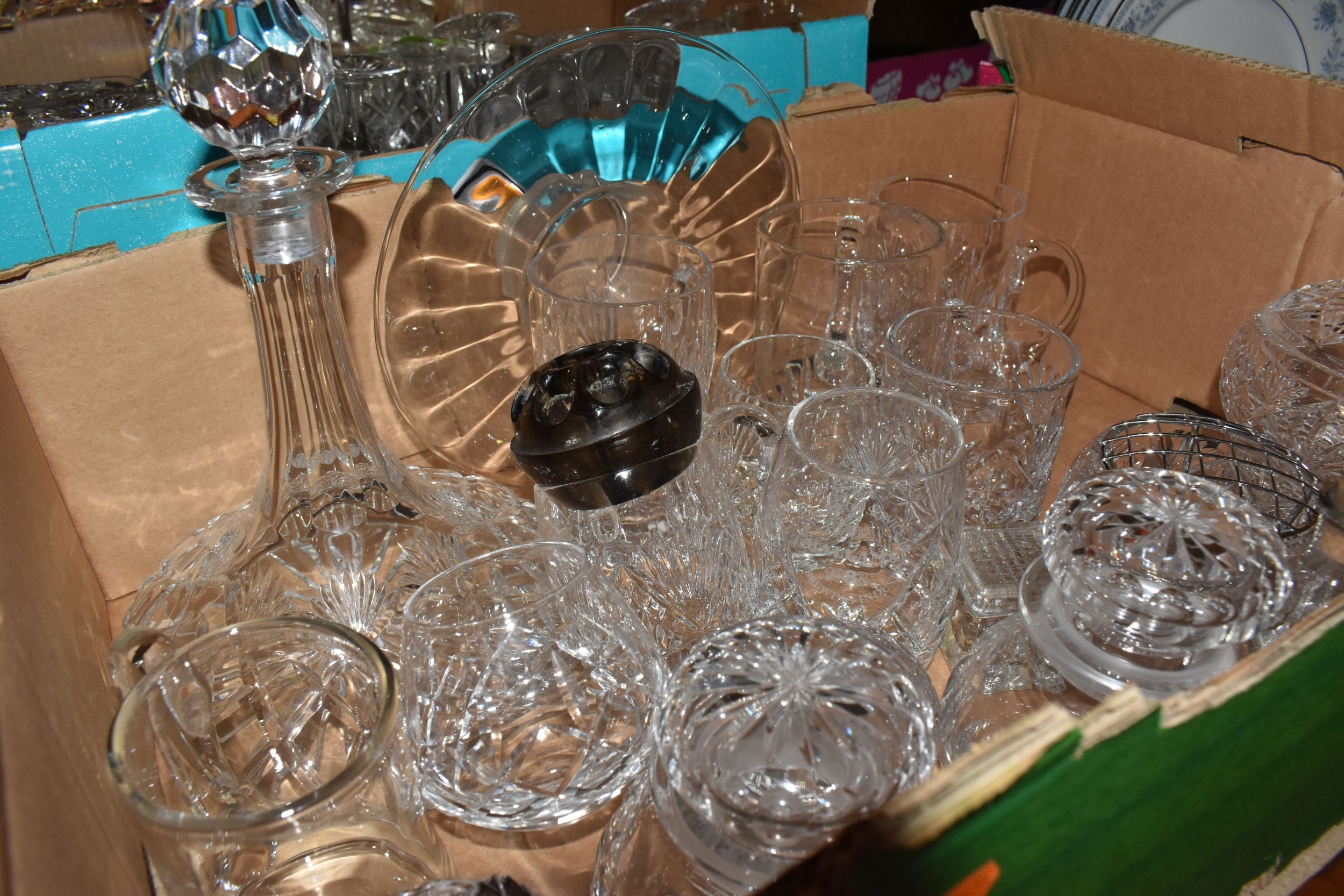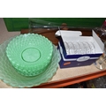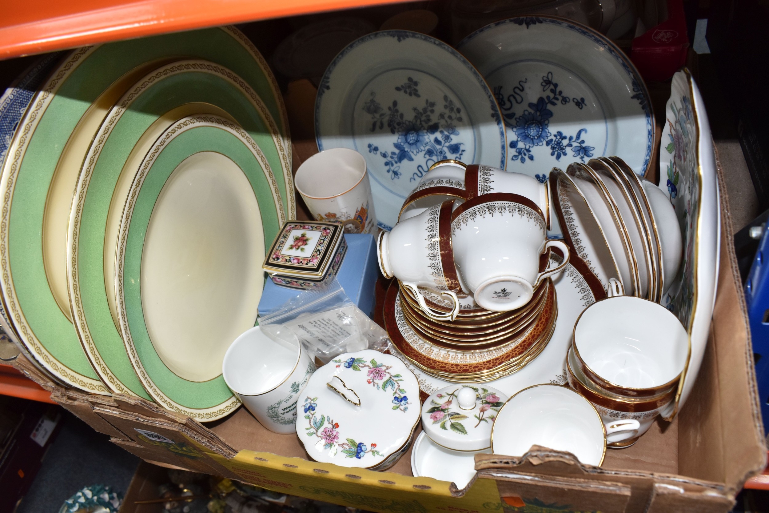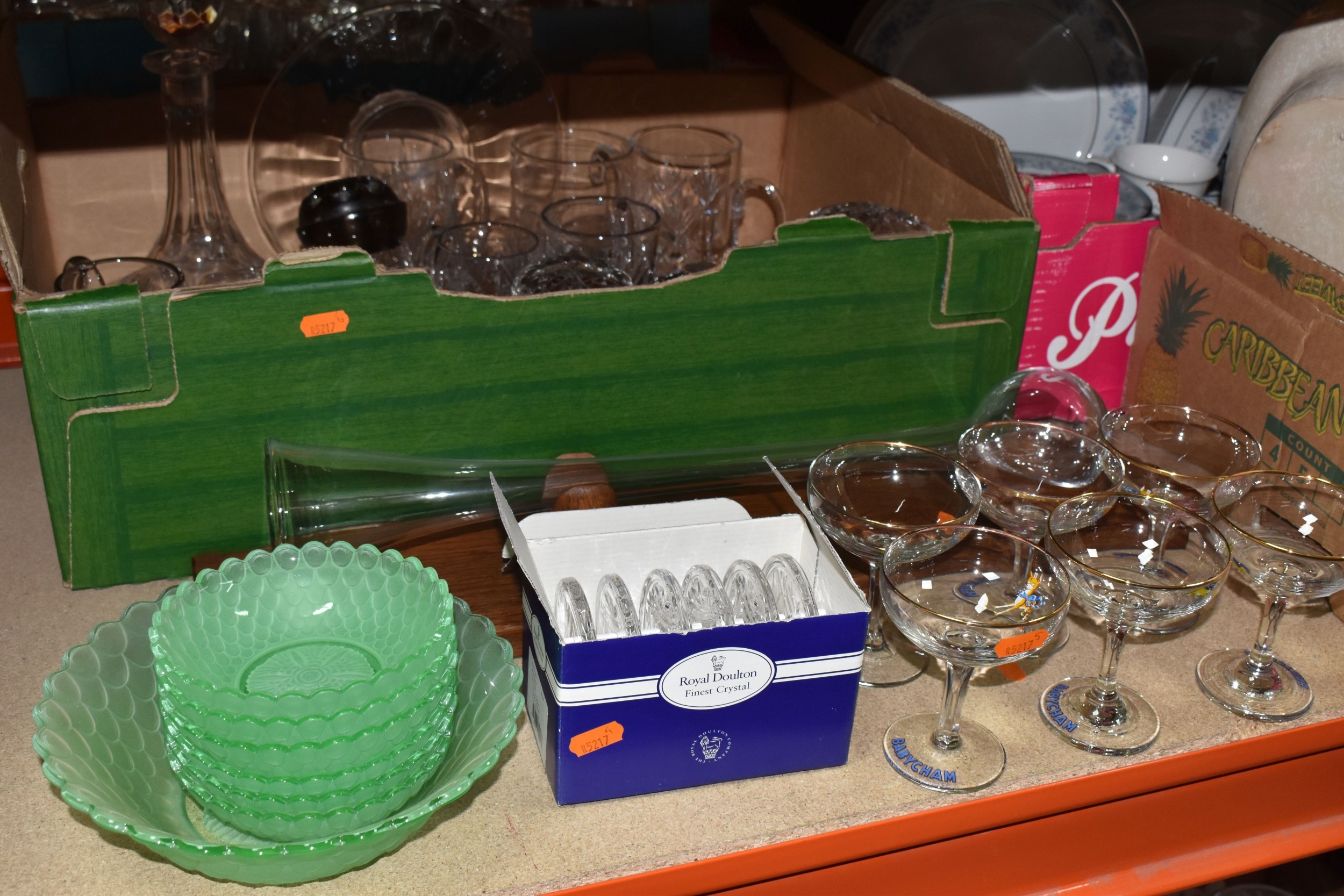 THREE BOXES AND LOOSE CERAMICS AND GLASS to include a group of Bagley and Co. uranium glass 'Fish scale' bowls comprising six bowls and a larger serving bowl, diameter of largest 21.5cm, a boxed Wedgwood 'Clio' trinket pot, an Aynsley 'Pembroke' trinket pot and plate, a Wedgwood 'Hathaway Rose' trinket pot, a group of Duchess 'Winchester' tea ware comprising cups, saucers, plates, and bowls, a box of Noritake 'Blue Hill' dinnerware comprising tureens, plates, bowls, sauce boat, etc, a box of Royal Doulton glass coasters, a group of assorted glassware to include Babycham glasses, a decanter, assorted jars, tankards, etc (3 boxes and loose) (s.d)