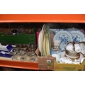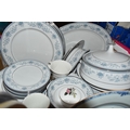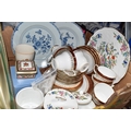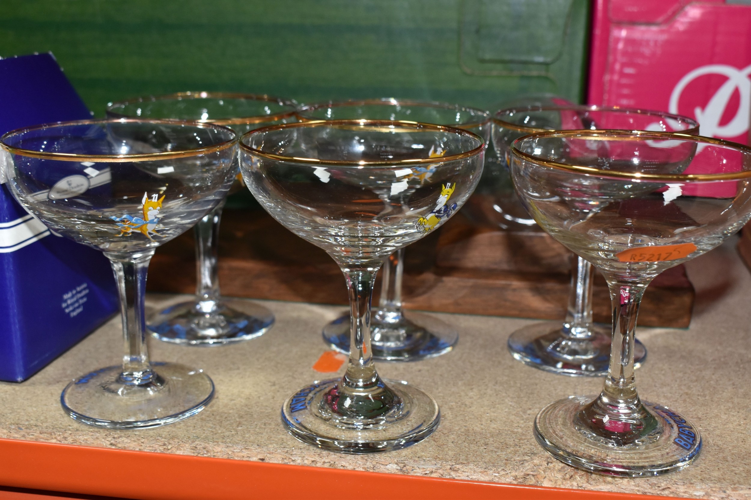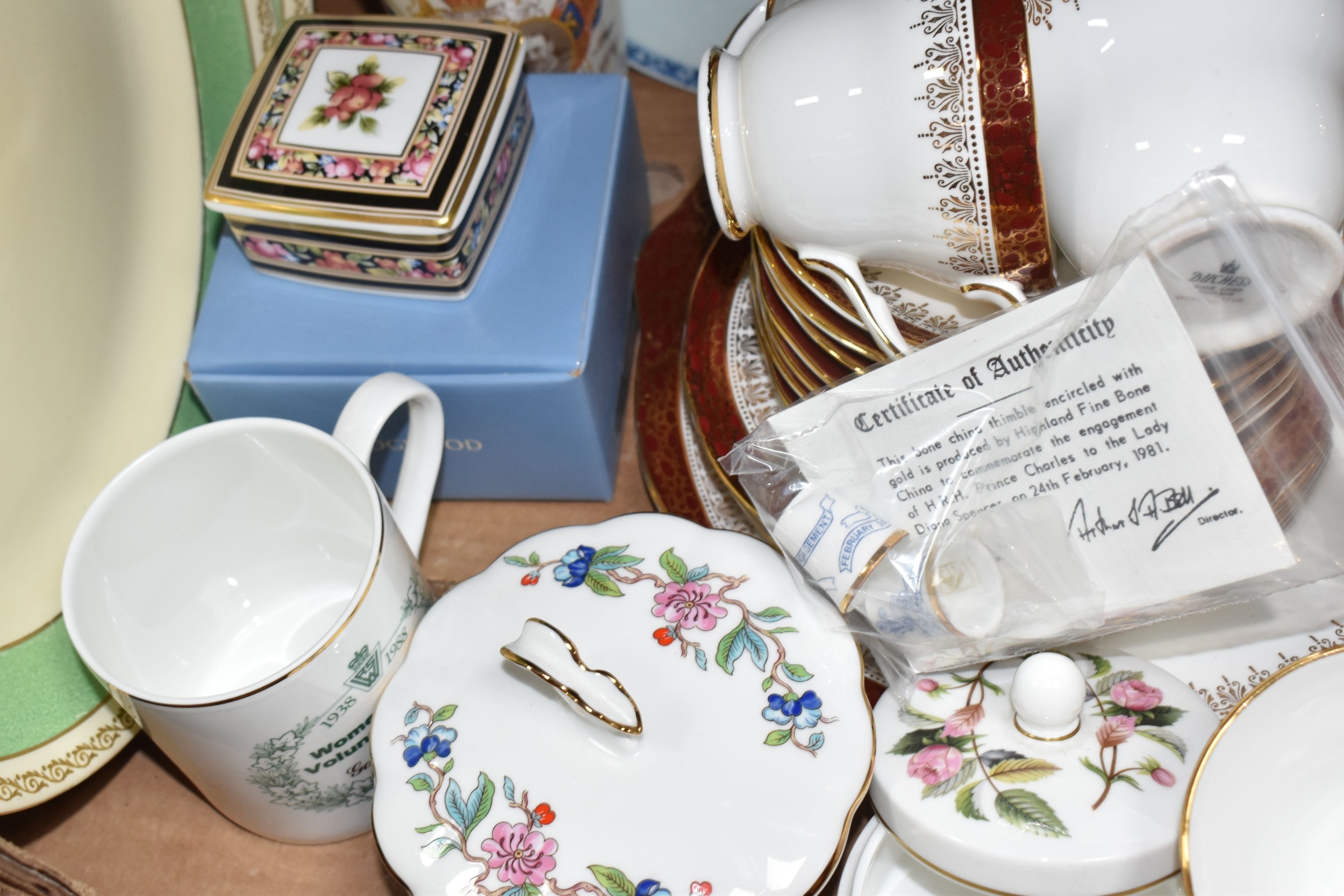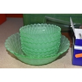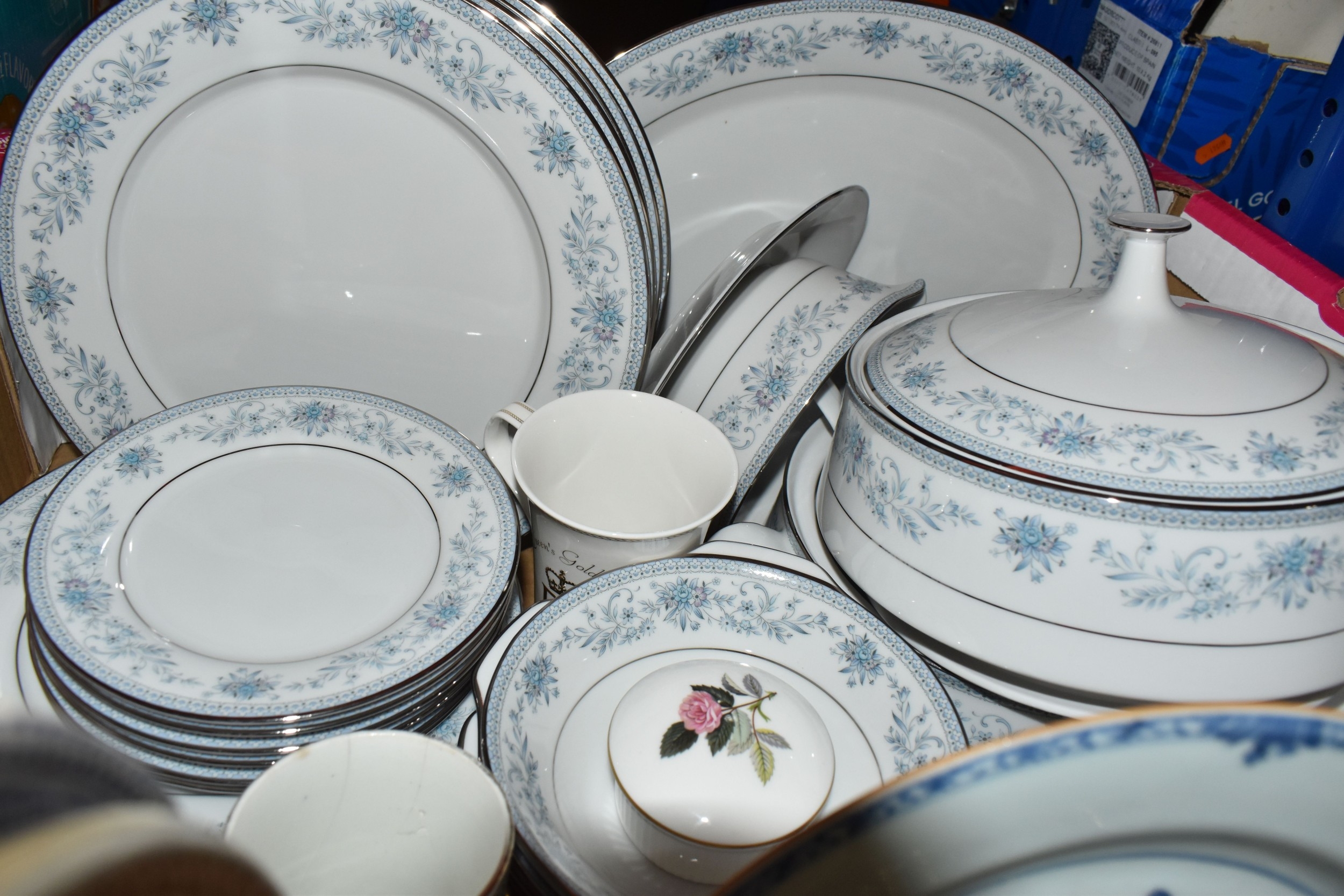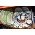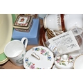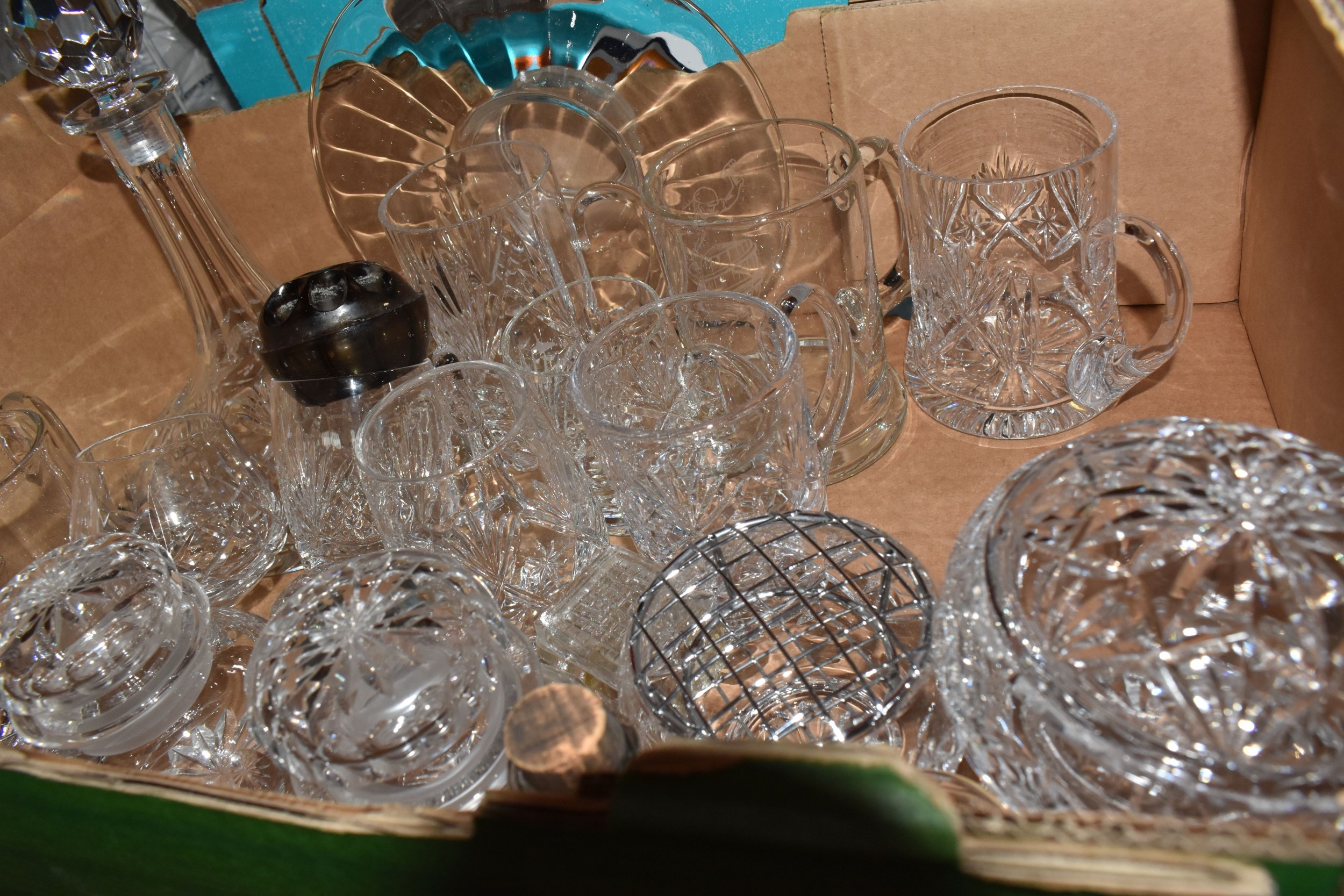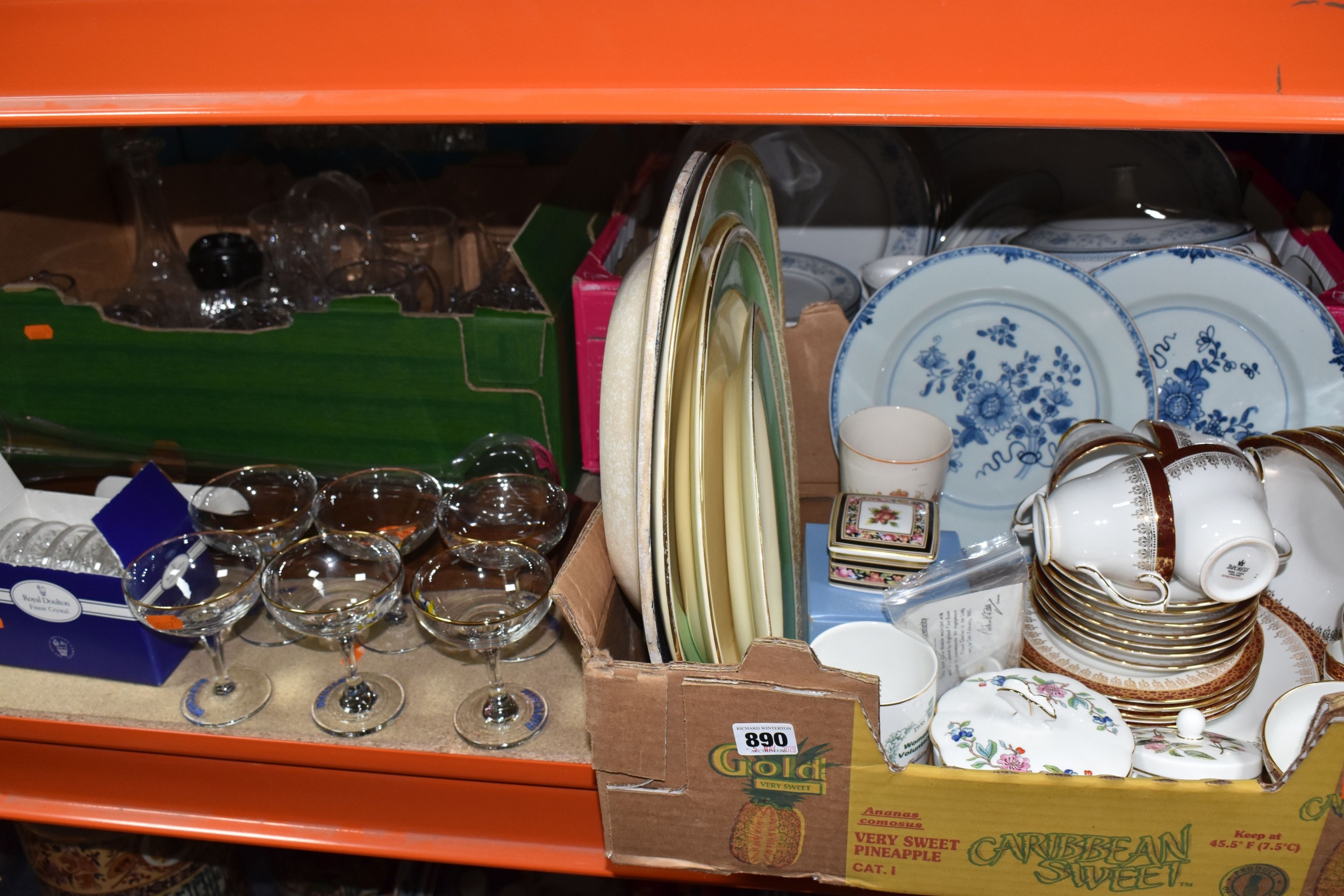THREE BOXES AND LOOSE CERAMICS AND GLASS to include a group of Bagley and Co. uranium glass 'Fish scale' bowls comprising six bowls and a larger serving bowl, diameter of largest 21.5cm, a boxed Wedgwood 'Clio' trinket pot, an Aynsley 'Pembroke' trinket pot and plate, a Wedgwood 'Hathaway Rose' trinket pot, a group of Duchess 'Winchester' tea ware comprising cups, saucers, plates, and bowls, a box of Noritake 'Blue Hill' dinnerware comprising tureens, plates, bowls, sauce boat, etc, a box of Royal Doulton glass coasters, a group of assorted glassware to include Babycham glasses, a decanter, assorted jars, tankards, etc (3 boxes and loose) (s.d)