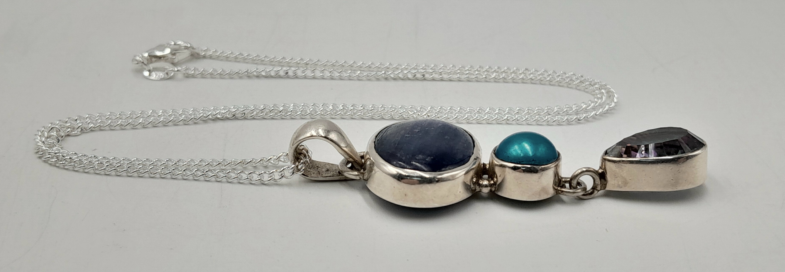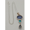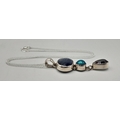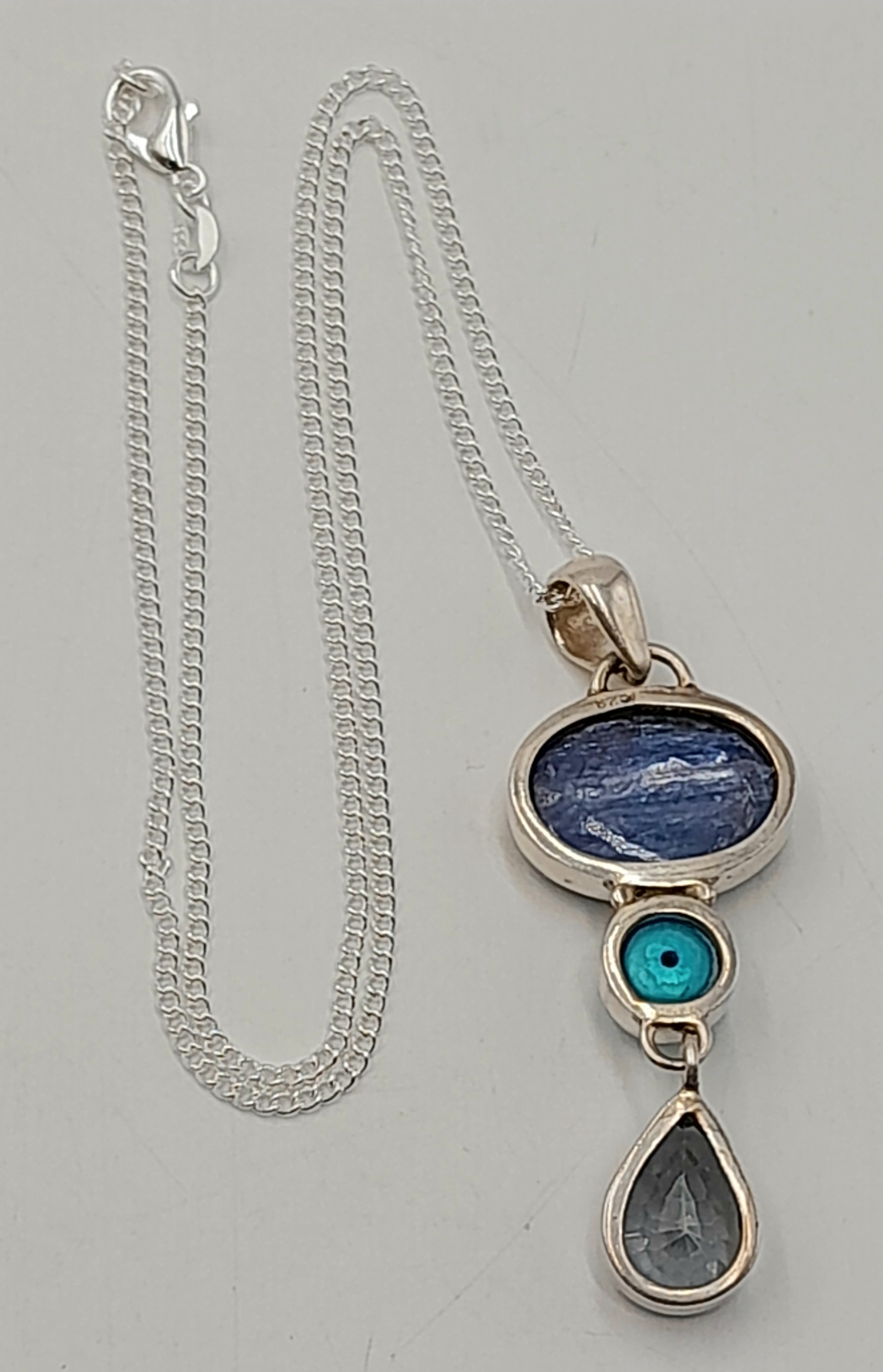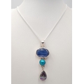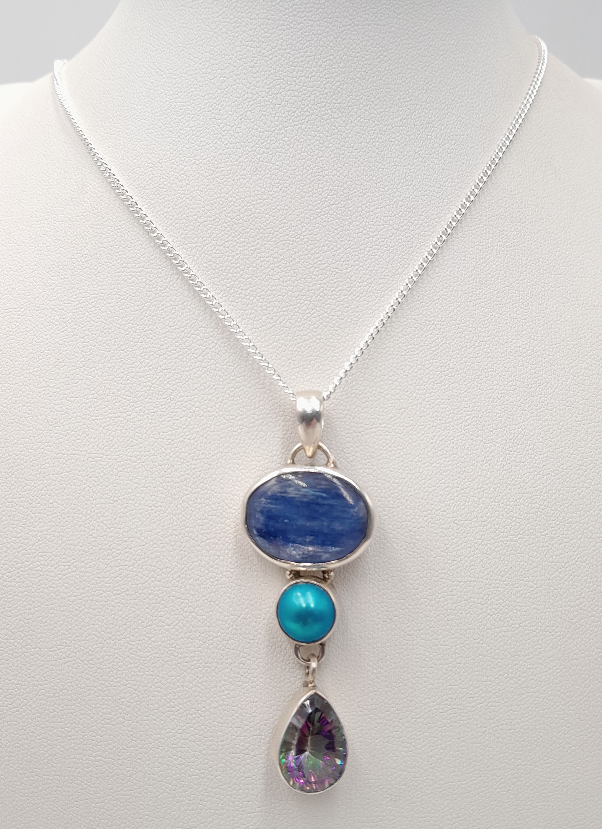 A Vintage Sterling Silver Kyanite and Mystic Topaz Pendant on a later 46cm Length Sterling Silver Chain. Pendant measures 5.7cm Drop and is 2.1cm Wide. Gross weight 15.02 Grams.