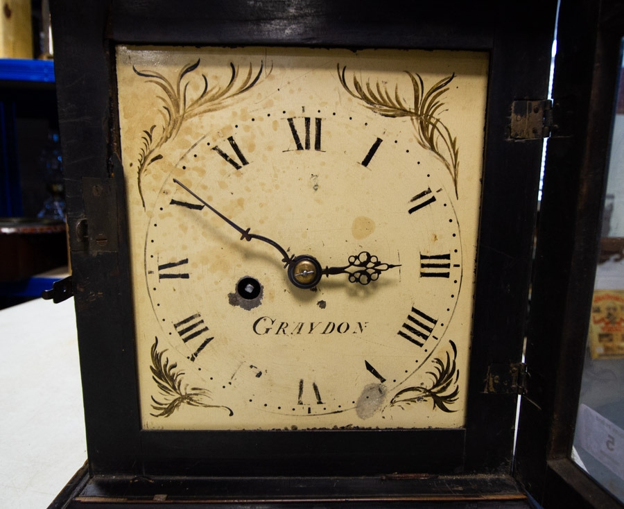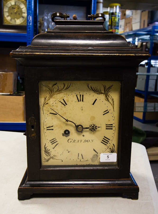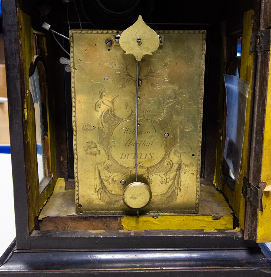 INTRIGUING IRISH EBONISED VERGE BRACKET TIMEPIECE, SIX-PILLAR MOVEMENT WITH PULL-QUARTER REPEAT ON 3 + 1 BELLS, FINELY ENGRAVED BACKPLATE ‘WILLIAM MARSHALL / DUBLIN’ IN A CARTOUCHE, ETC., HEART-SHAPED COCK APRON, SMALL LENTICULAR PENDULUM BOB, CA.1720; WITH A CUSTOM-MADE OFF-SQUARE 7-INCH X 8-INCH PAINTED DIAL OF CA.1805 SIGNED ‘GRAYDON’ (I.E. GEORGE GRAYDON, DUBLIN)