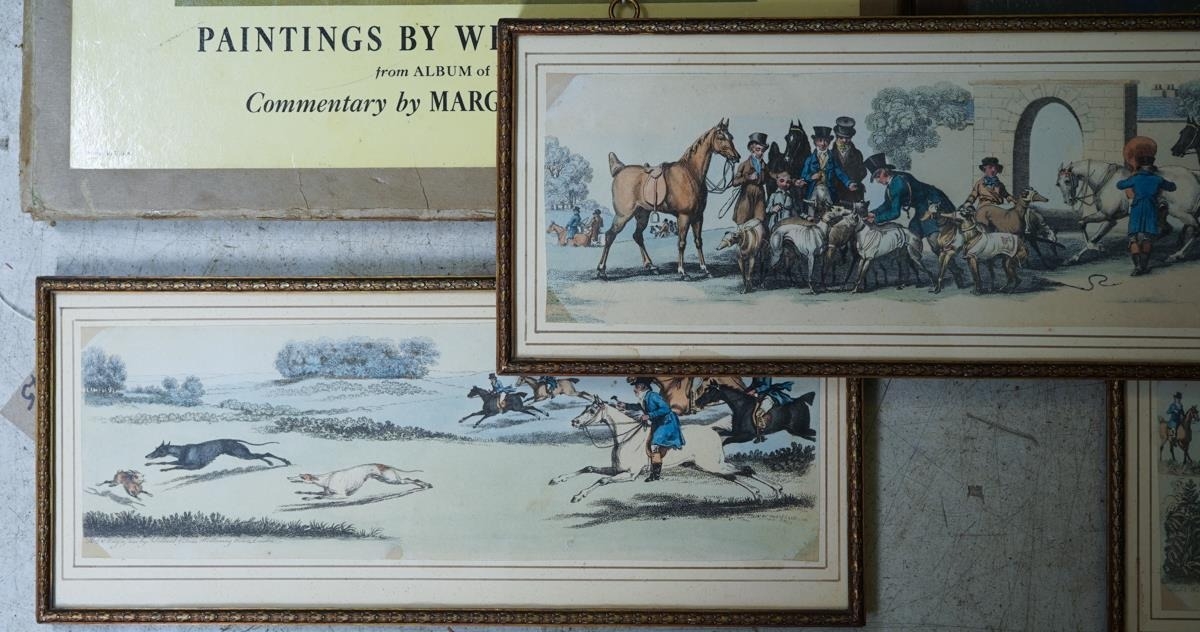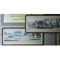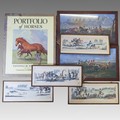 A set of 4 19th century hand coloured hare coursing prints in gilt metal frames after R. Pollard ( image size 9 x 28 cm approx) together with a pair of hand coloured print of steeplechasing in wooden frames and a portfolio of horses of the paintings by Wesley Dennis. (q)