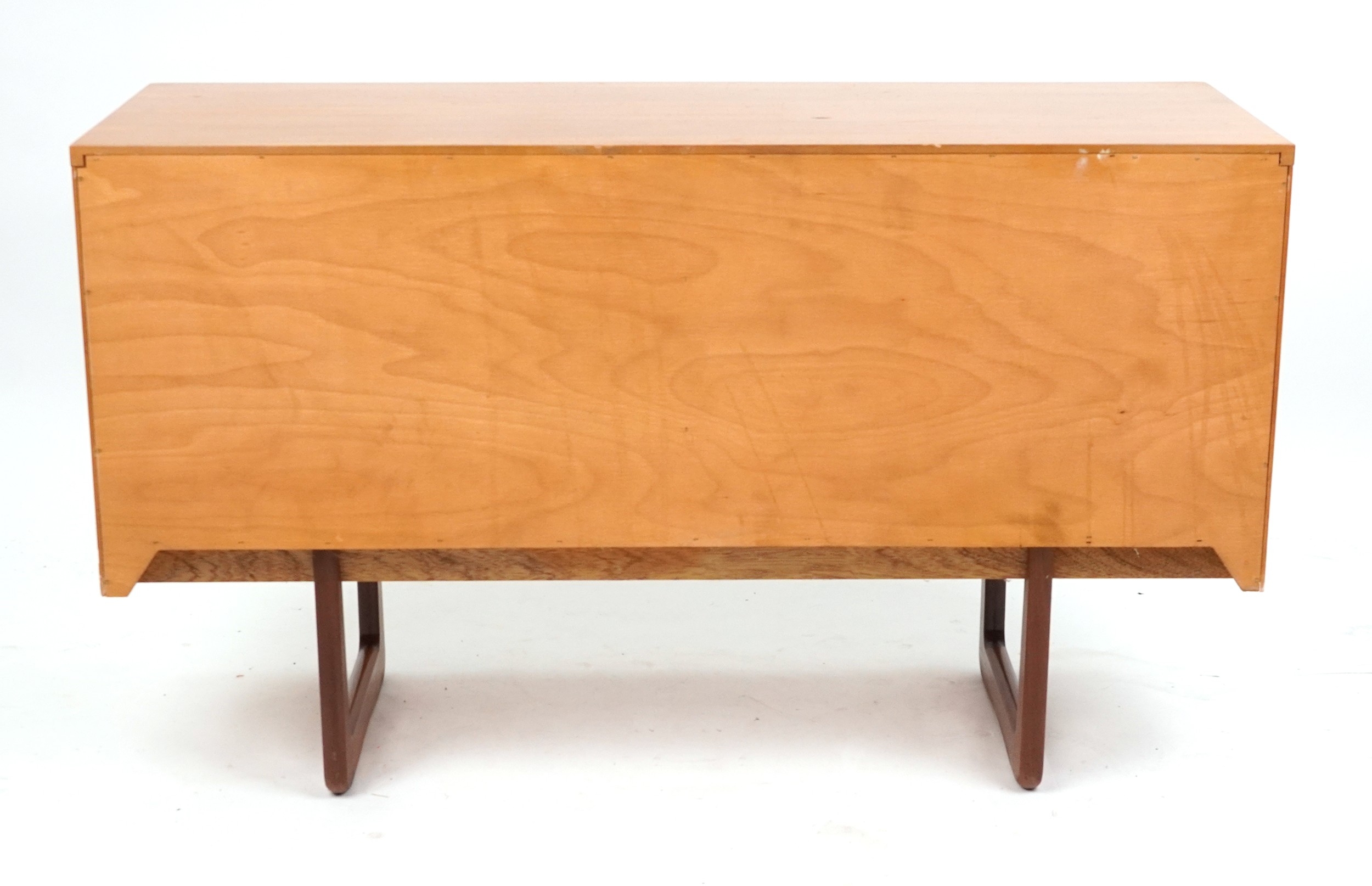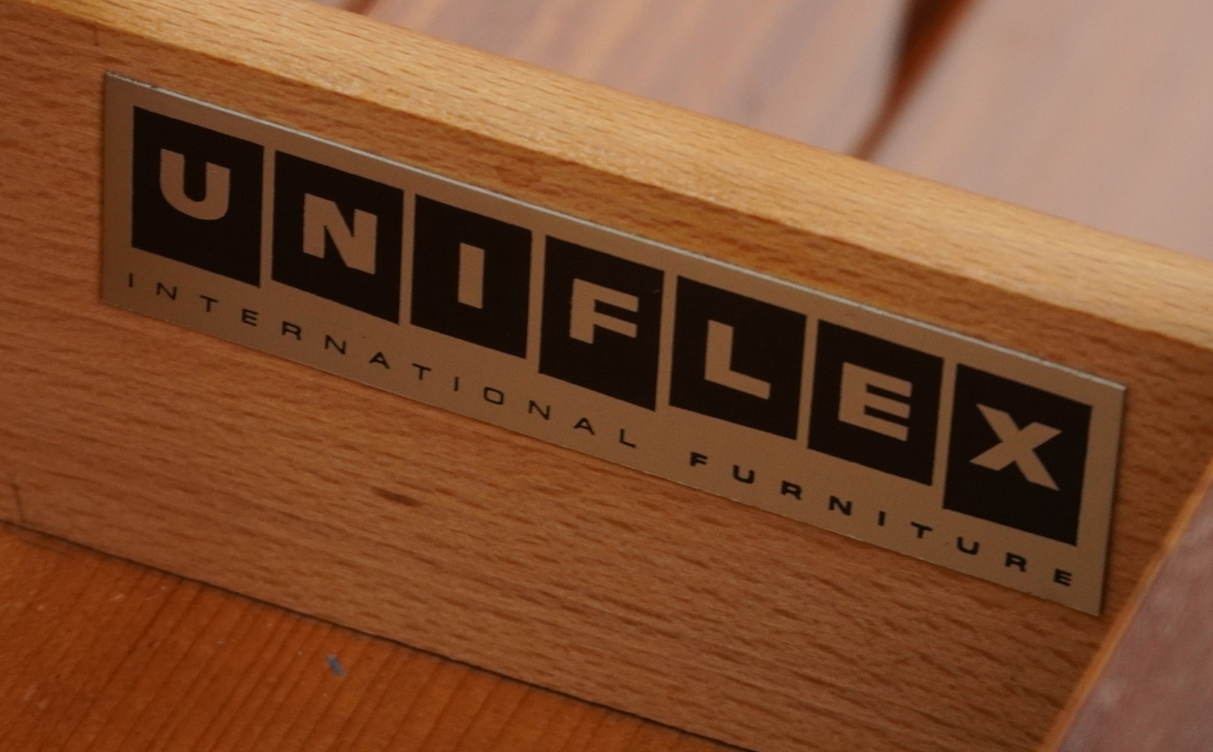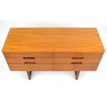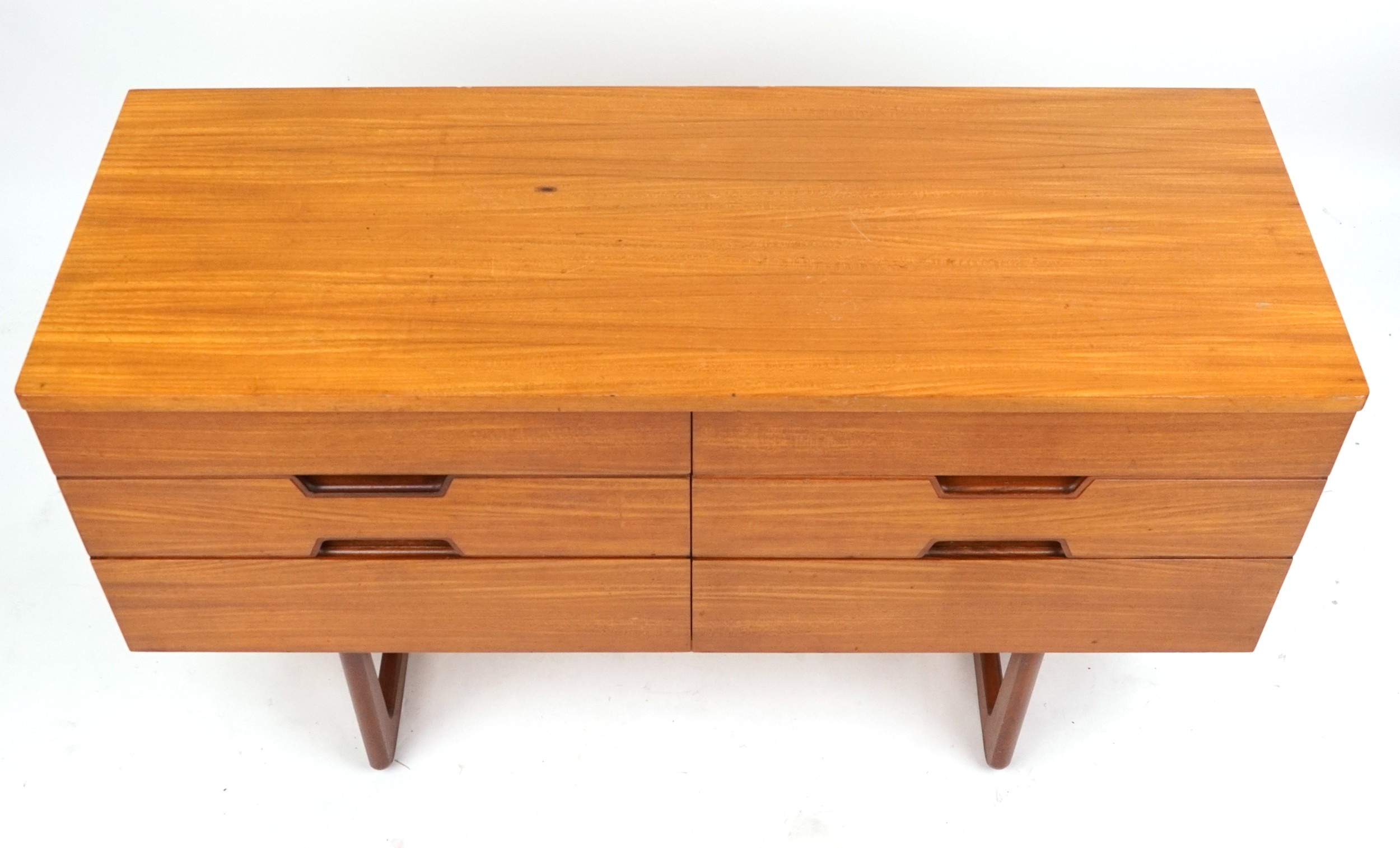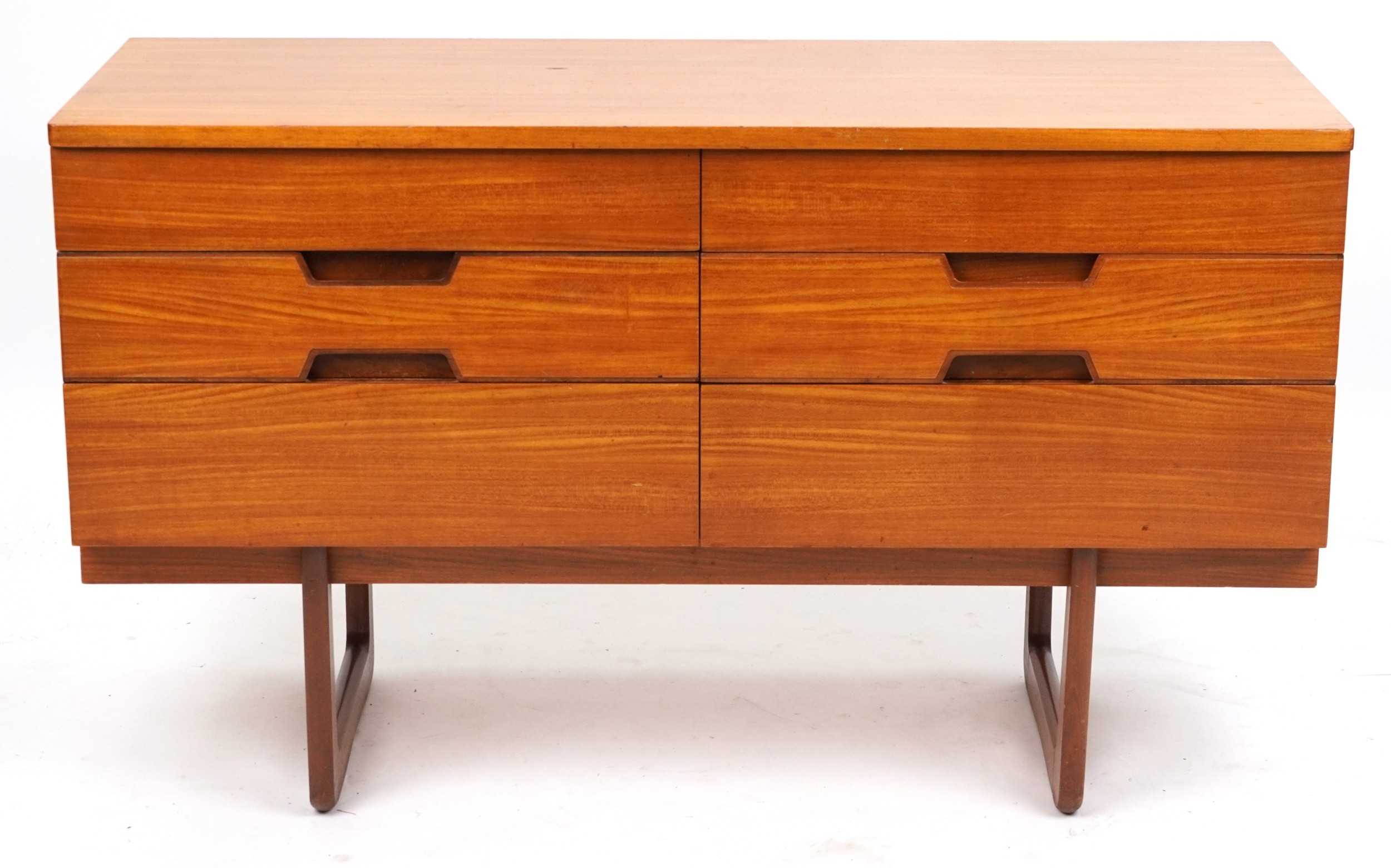 A mid 20th century teak chest of six drawers by Uniflex Furniture, on shaped supports, 71cm H x 121cm W x 45cm D.