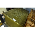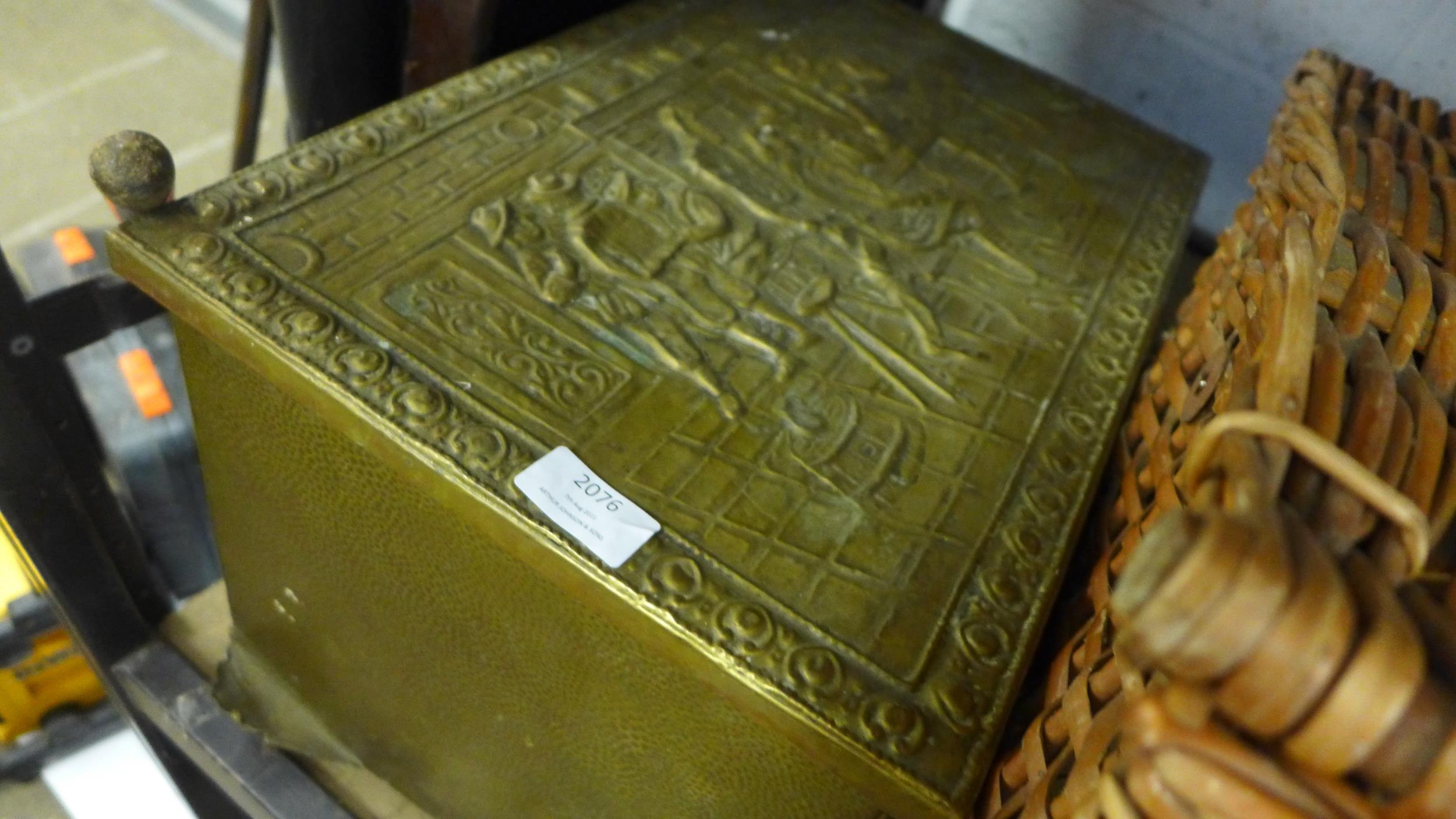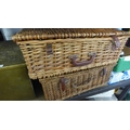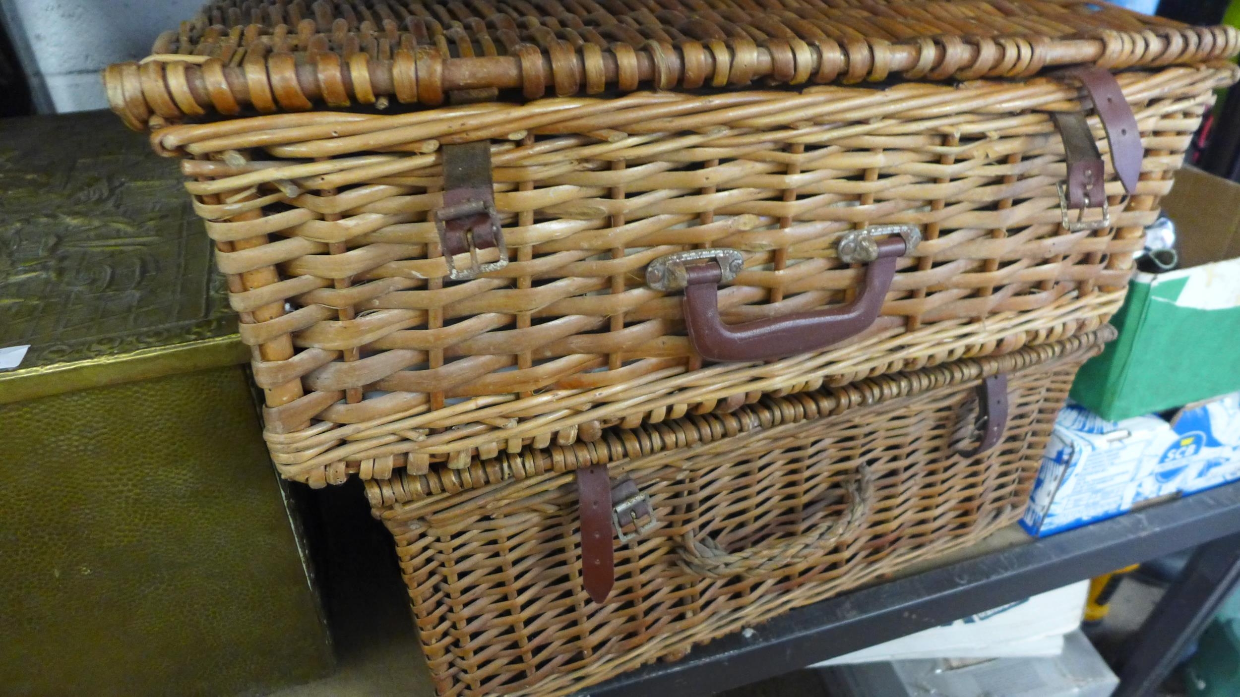 2 Wicker picnic sets, tray, carpenter tool chest with brass coal box
