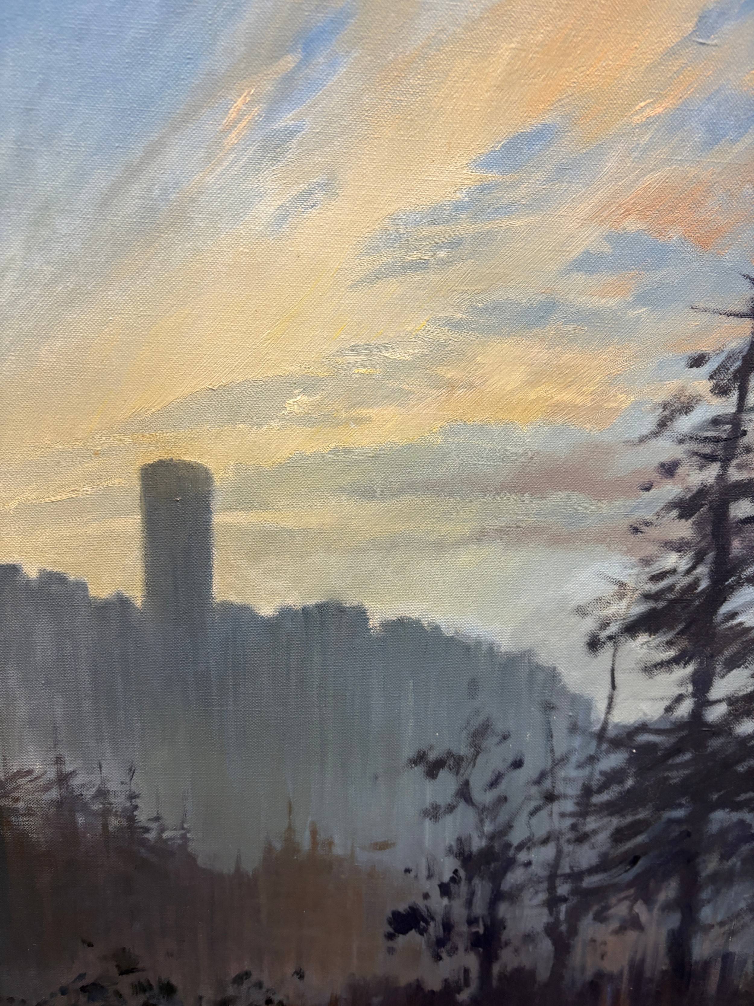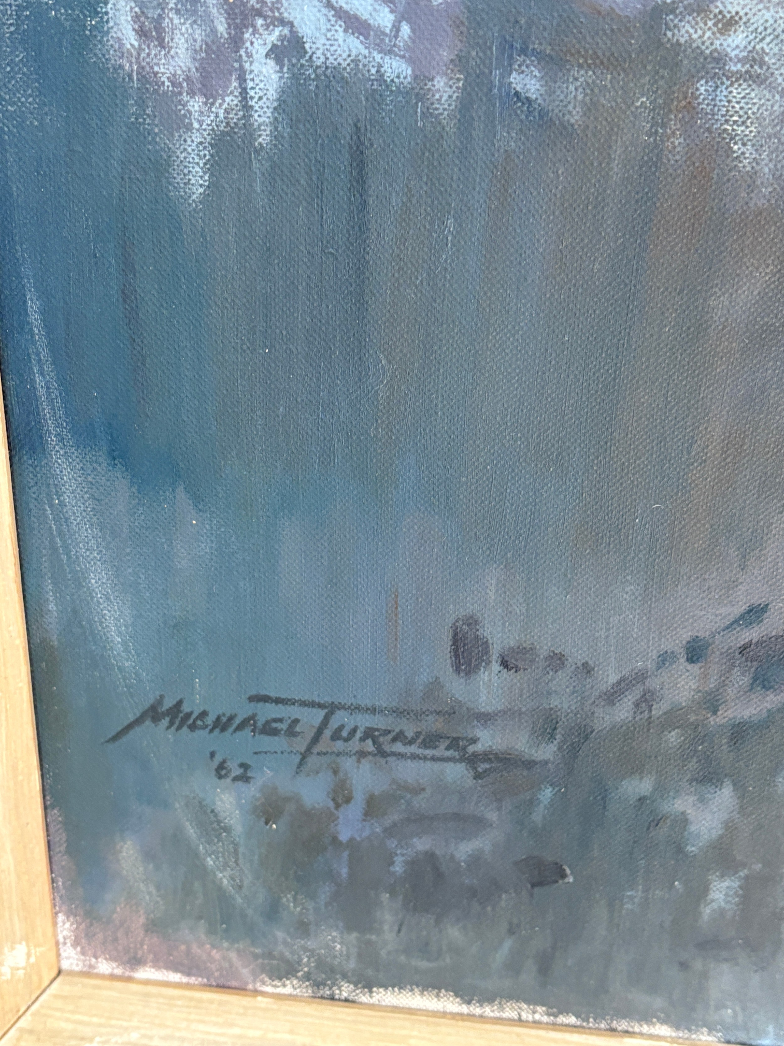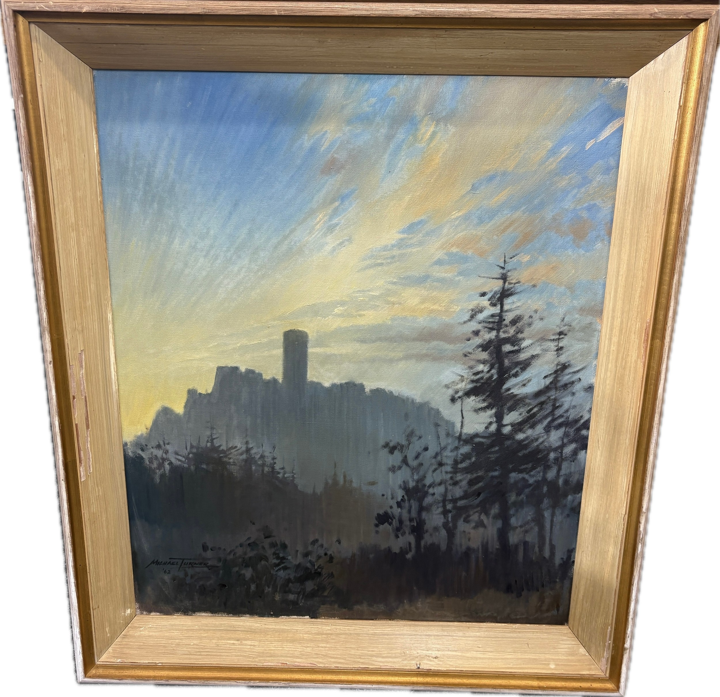 Framed Michael Turner original oil on canvas depicting a landscape scene, signed Michael Turner 62. Canvas measures approximately Height 24 inches, Width 20 inches, frame measures approximately Height 28 inches, Width 24 inches
