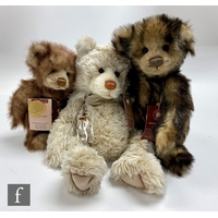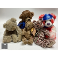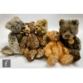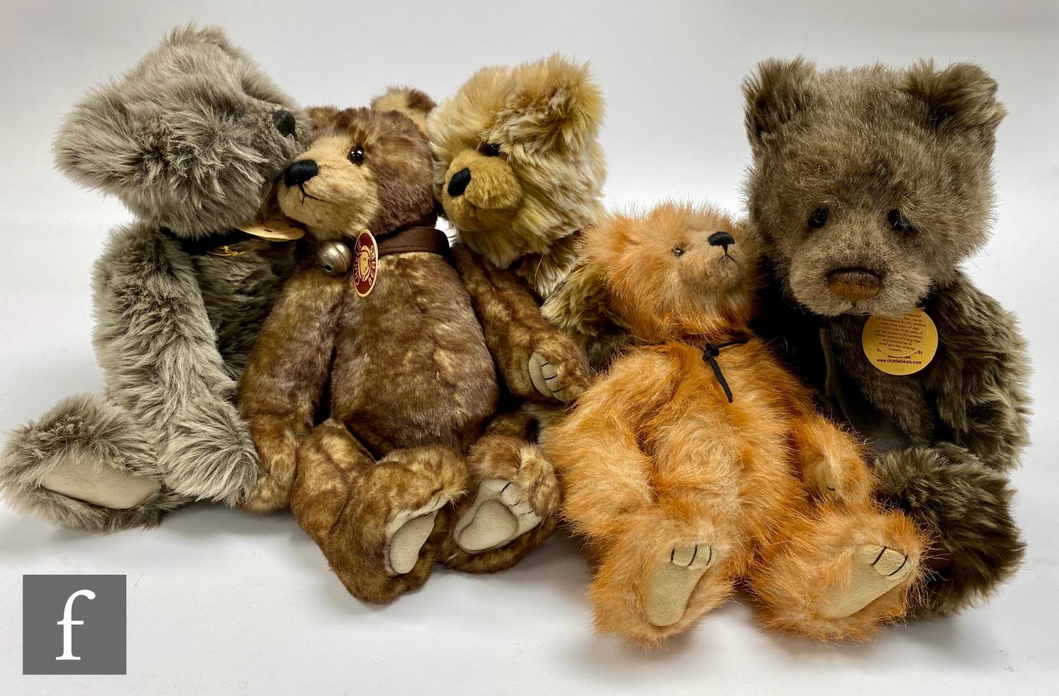 Five Charlie Bears teddy bears, Heather (CB193747C), light brown plush with magnetised paws, height 35cm, Gracie (CB094061), grey plush, Jenkins (CB614848), brown plush with frosted tips, Josh (CB183931), beige plush with brown tips, and Alice (CB094079B), light brown plush with cinnamon tips, all with swing tags. (5)
