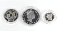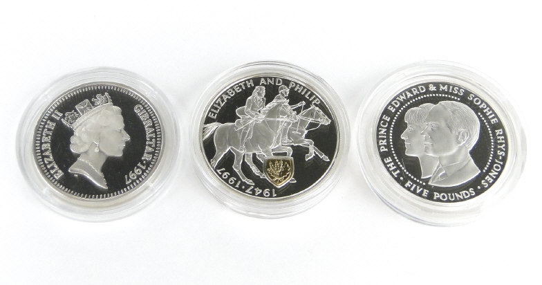 Three Elizabeth II silver proofs - Uganda 2,000 shillings, Gibraltar £5 and Guernsey £5