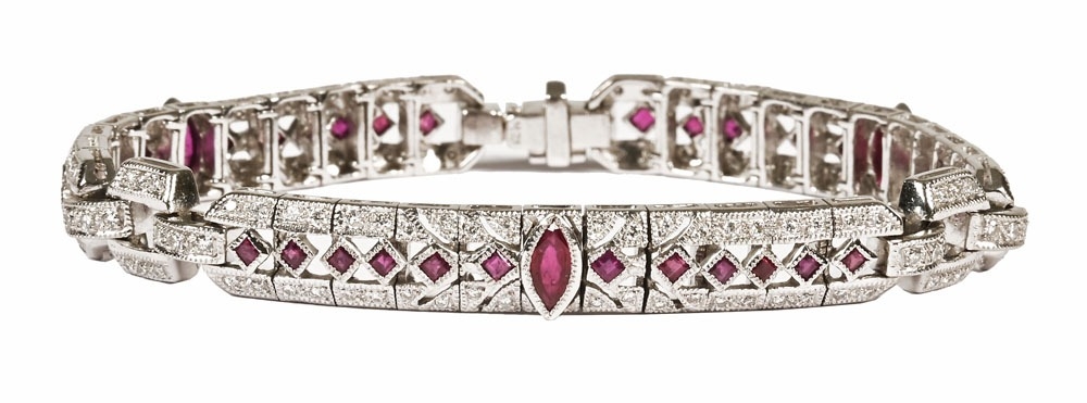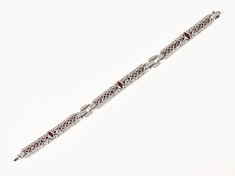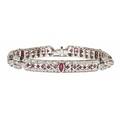 An 18 ct white gold diamond and ruby bracelet. Length 18 cm, the large rubies measuring +/- 6 mm in length x 2 mm. Gross weight 29 grams. Purchased by the Vendors father at The Waldorf Astoria Hotel in New York (see illustration).